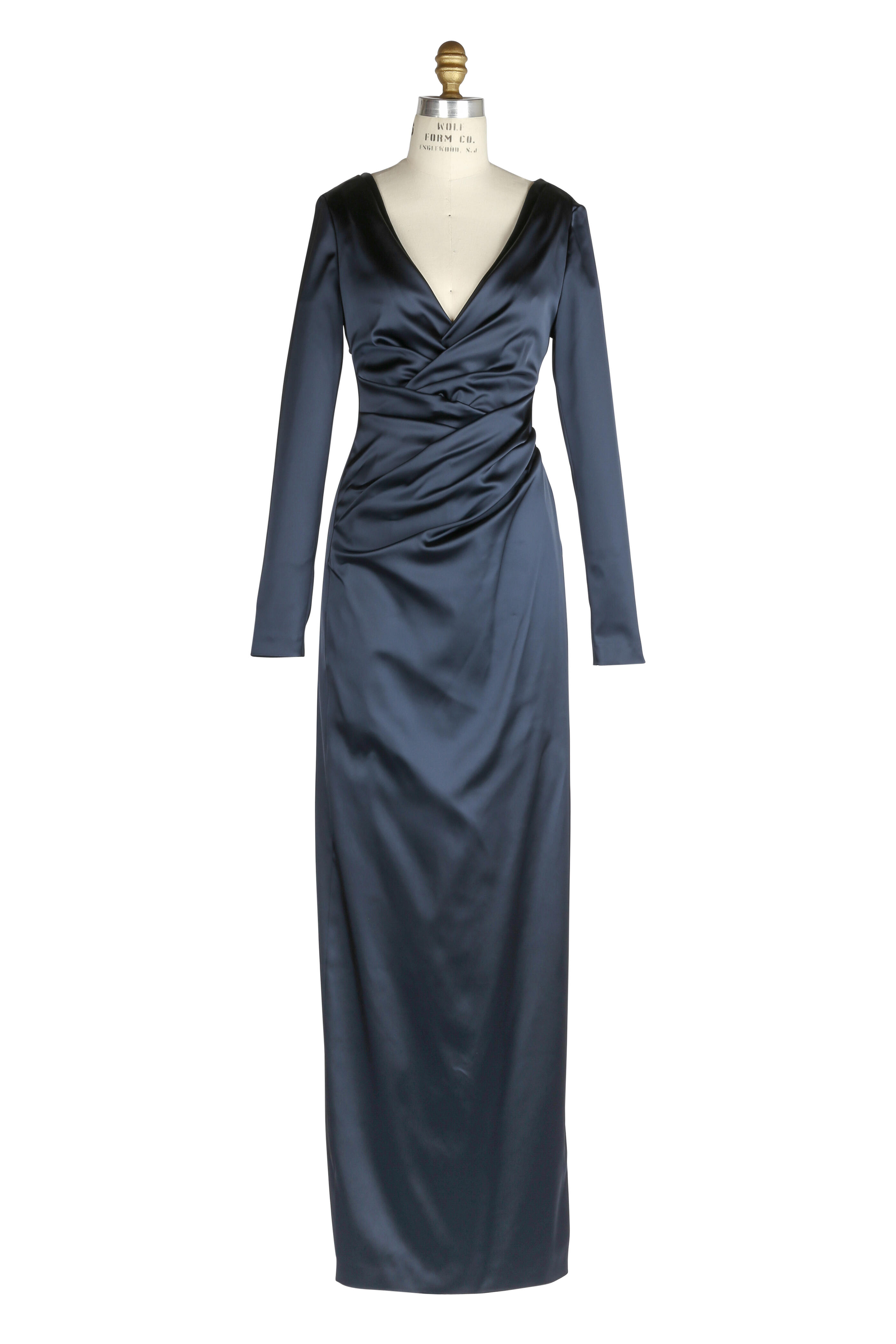Deep V-neckline. Concealed back zip closure. Ruching. Back slit. Made in Germany. 75% acetate, 22% polyamide, 3% elastane; full lining. Dry clean.