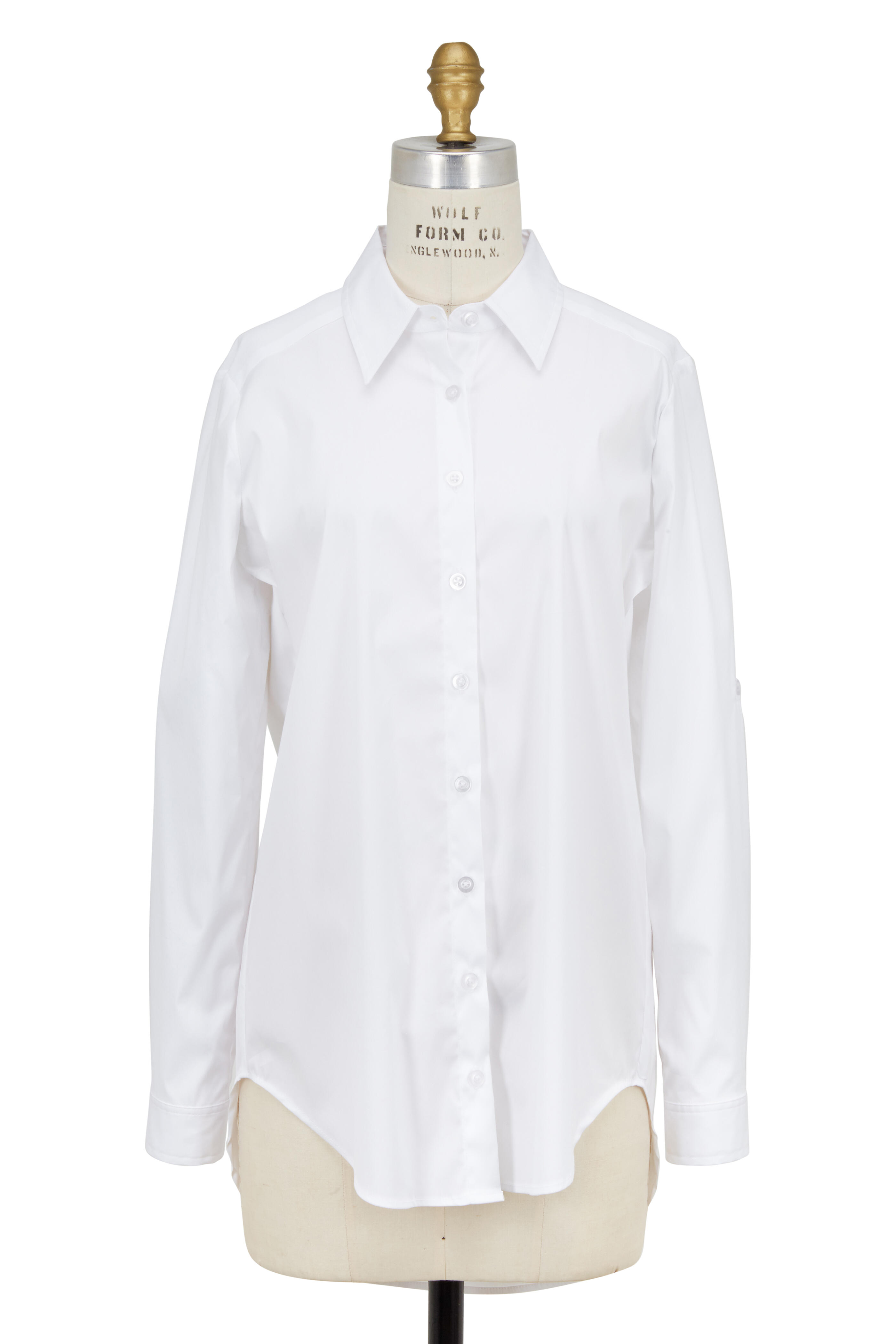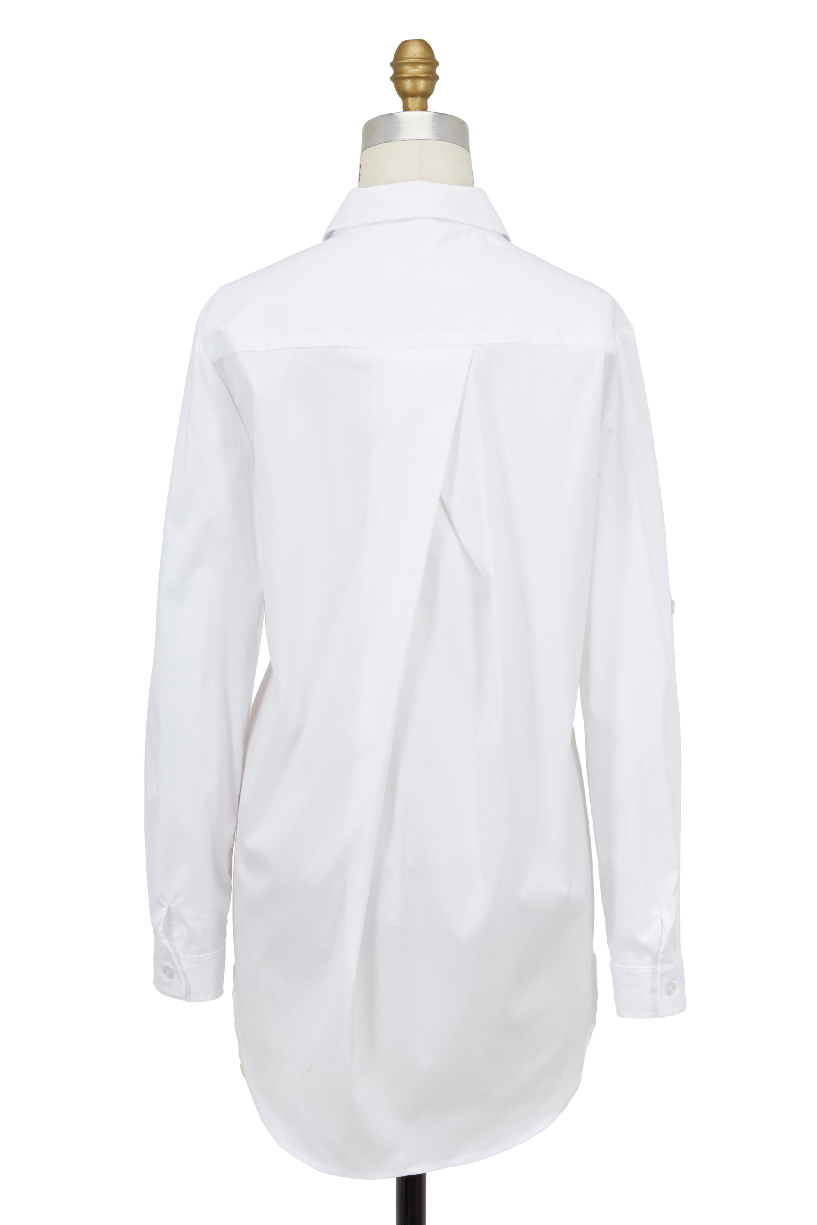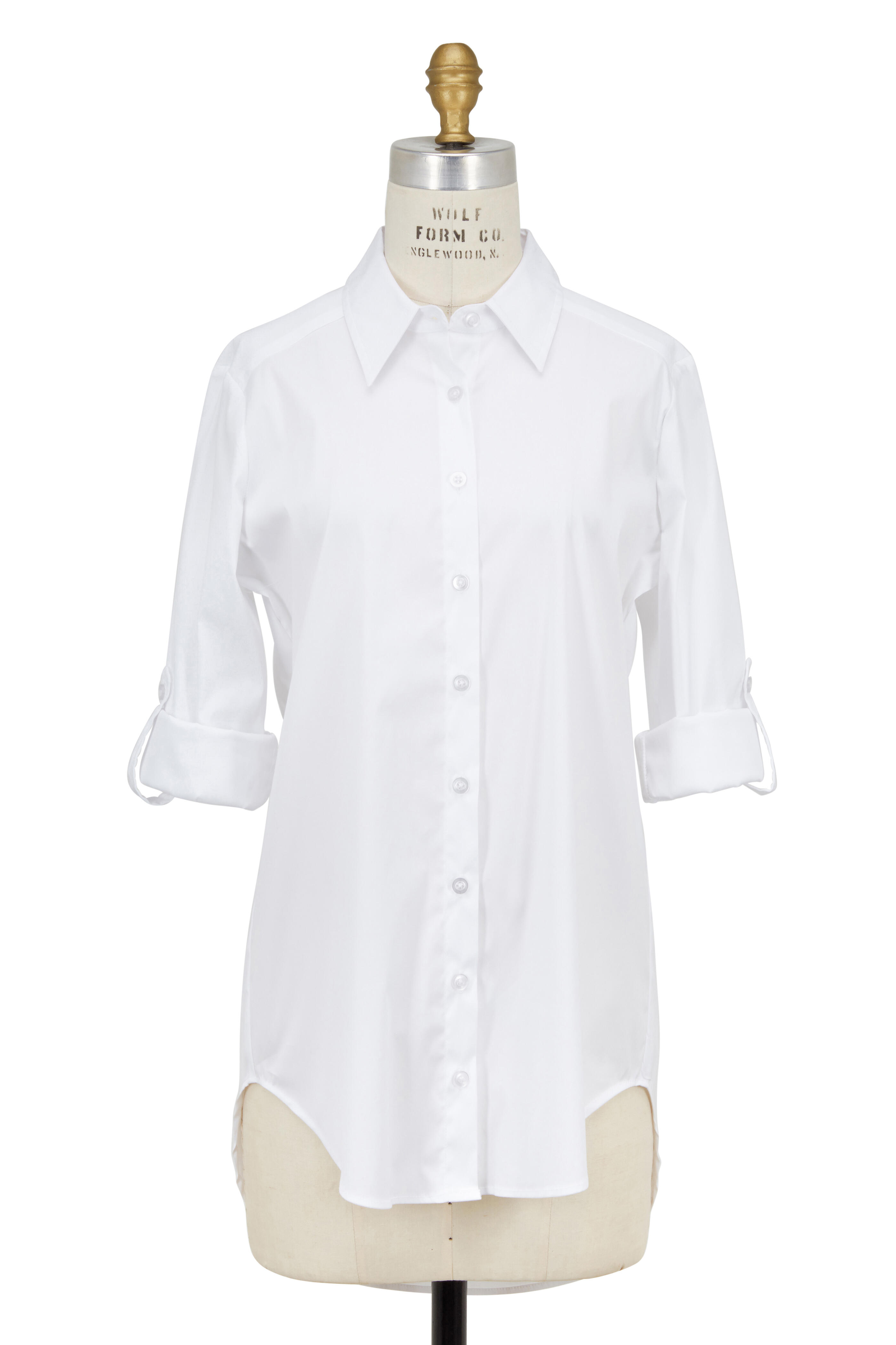 Spread collar. Button placket. Roll tab sleeve. High-low hem. Made in the USA. Length: 33" (back hem). 75% cotton, 20% polyester, 5% elastic. Dry clean.
