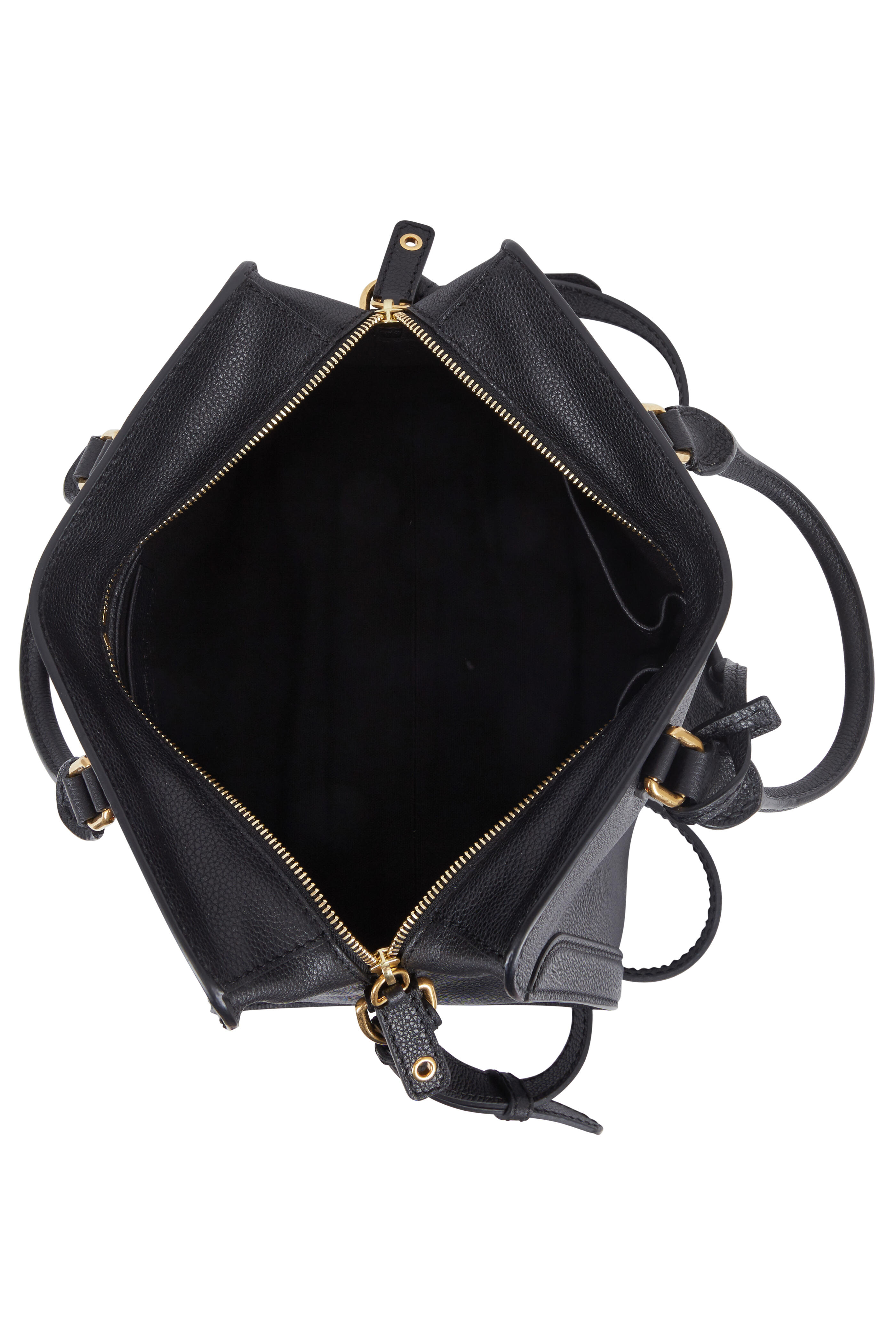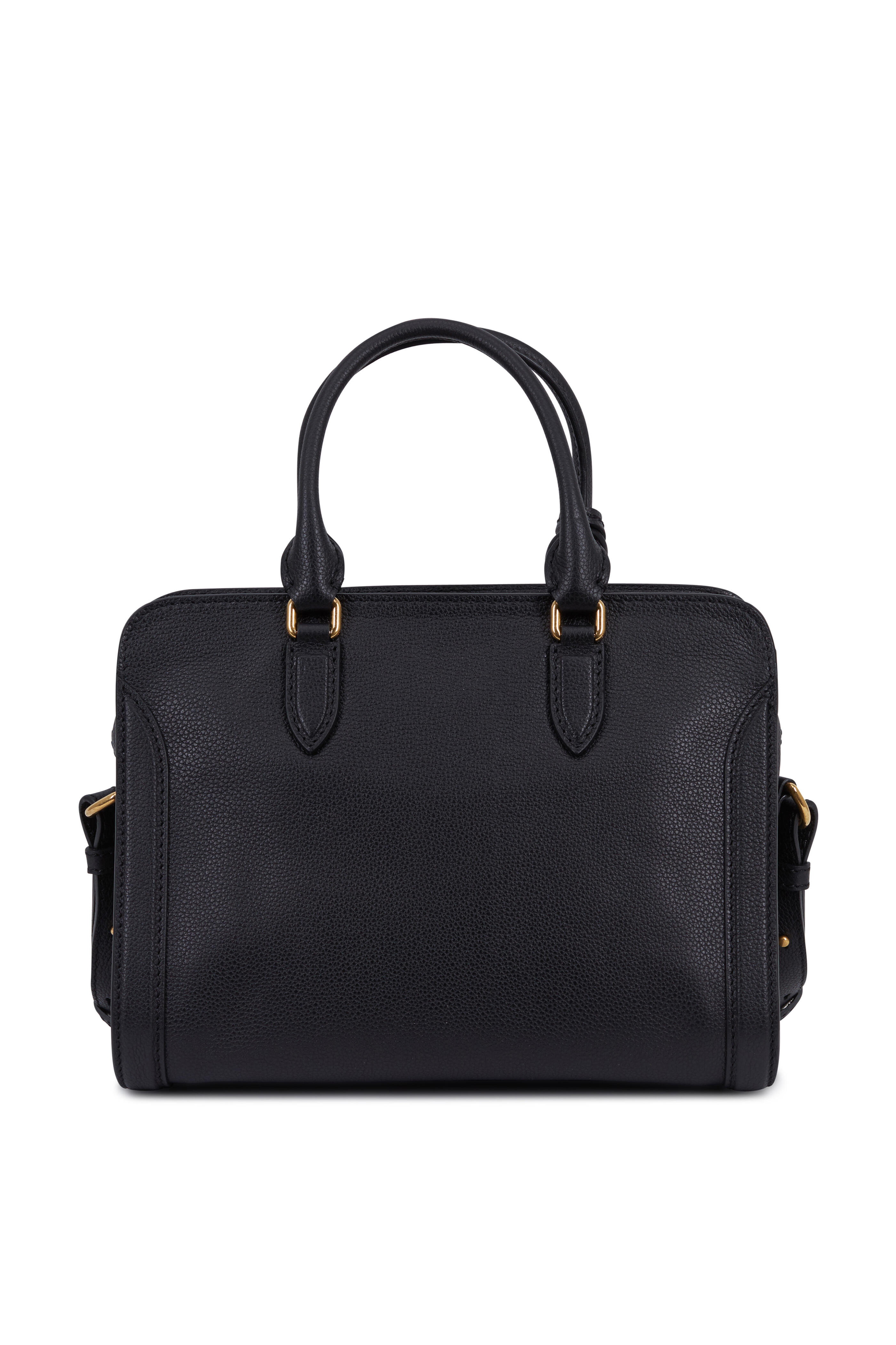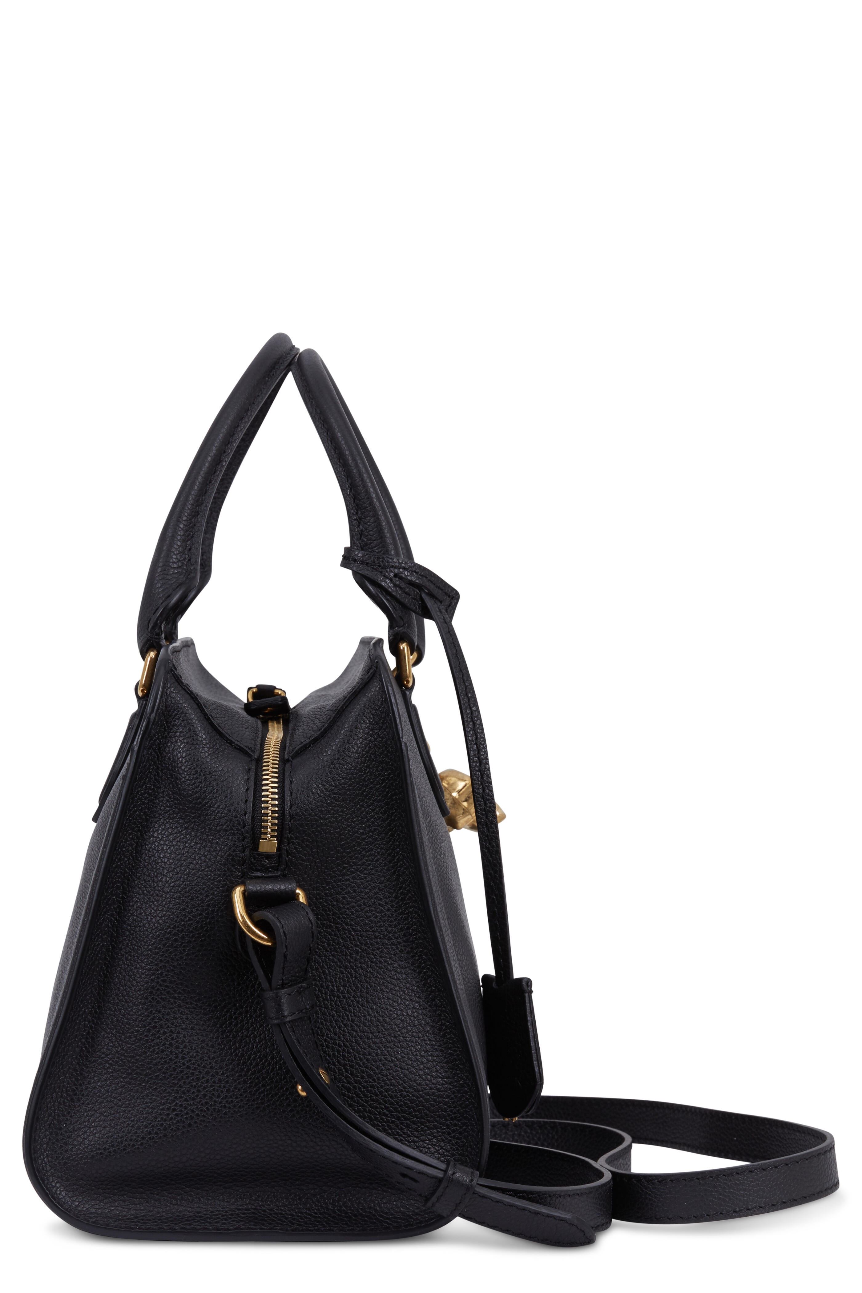 Pebbled leather. Double rolled top handles. Detachable and adjustable strap. Top two-way zip closure. Iconic gold-toned skull padlock. One interior zip pocket, two smart phone pockets. Lined in cotton canvas. Made in Italy. Width: 12". Height: 9". Depth: 6". Handle drop: 5". Detachable and adjustable strap drop: 20".