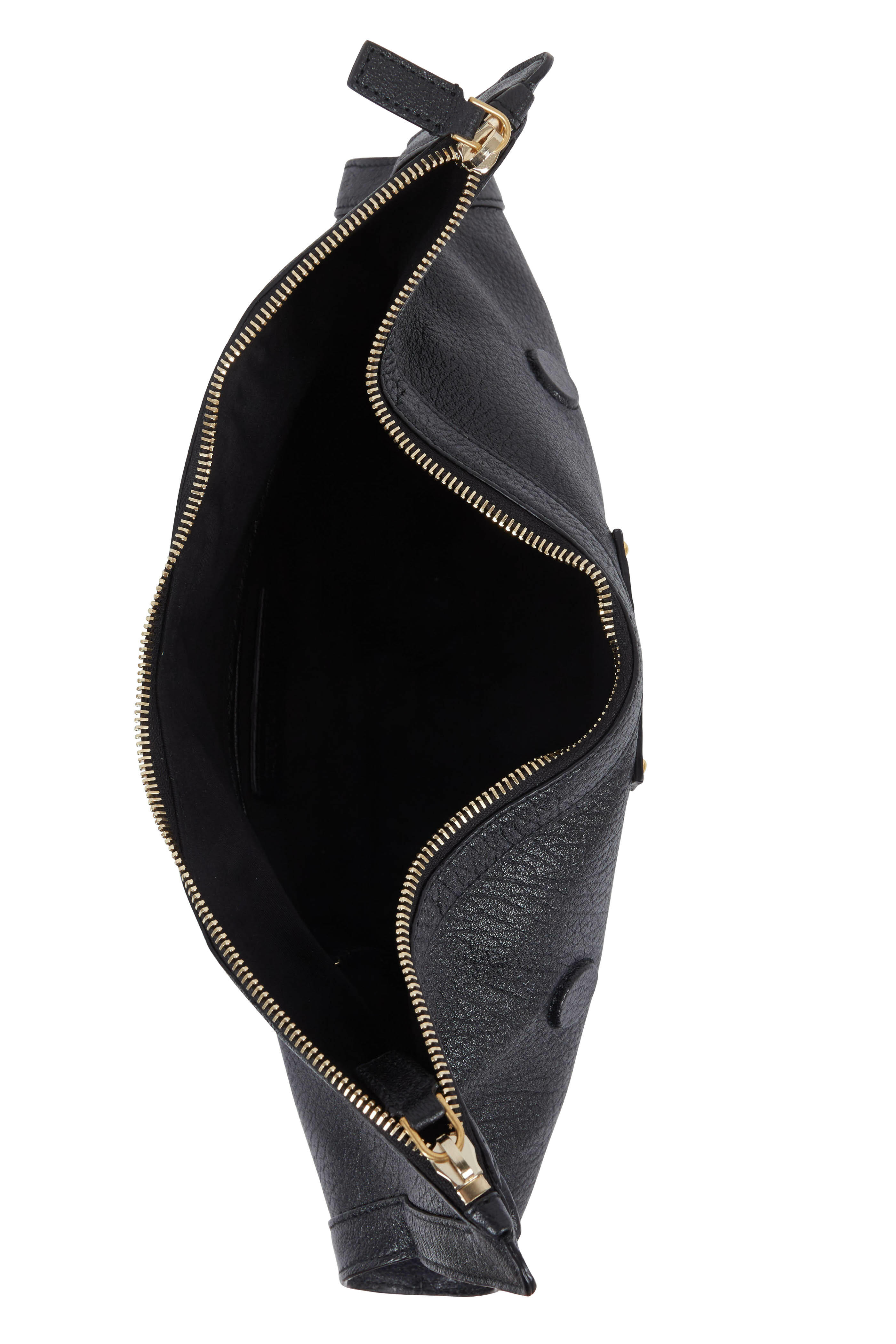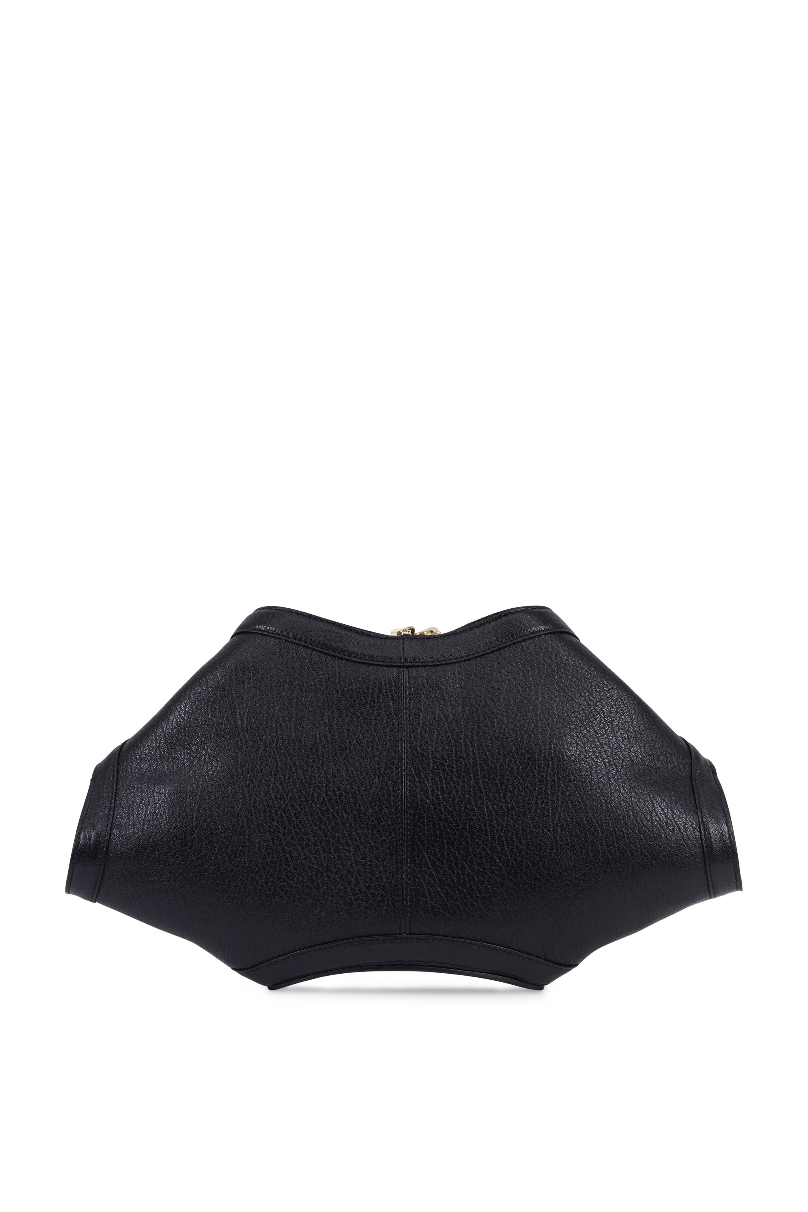 Pebbled leather. Top two-way zip closure. Fold over sides with hidden magnetic snaps. Trapeze shape with arched bottom. Interior one zipped pocket. Lined in cotton. Made in Italy. Width: 15". Height: 8 ½". Depth: 2".