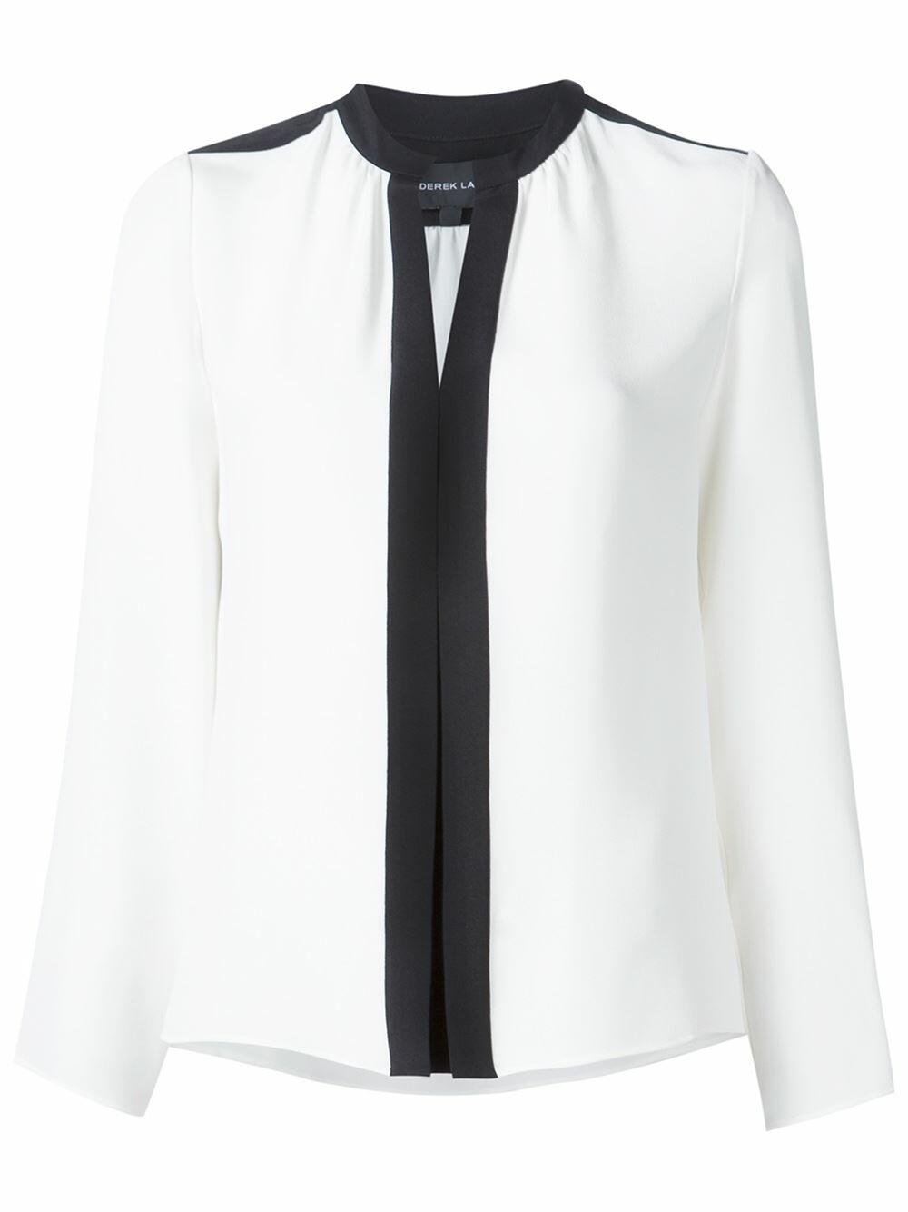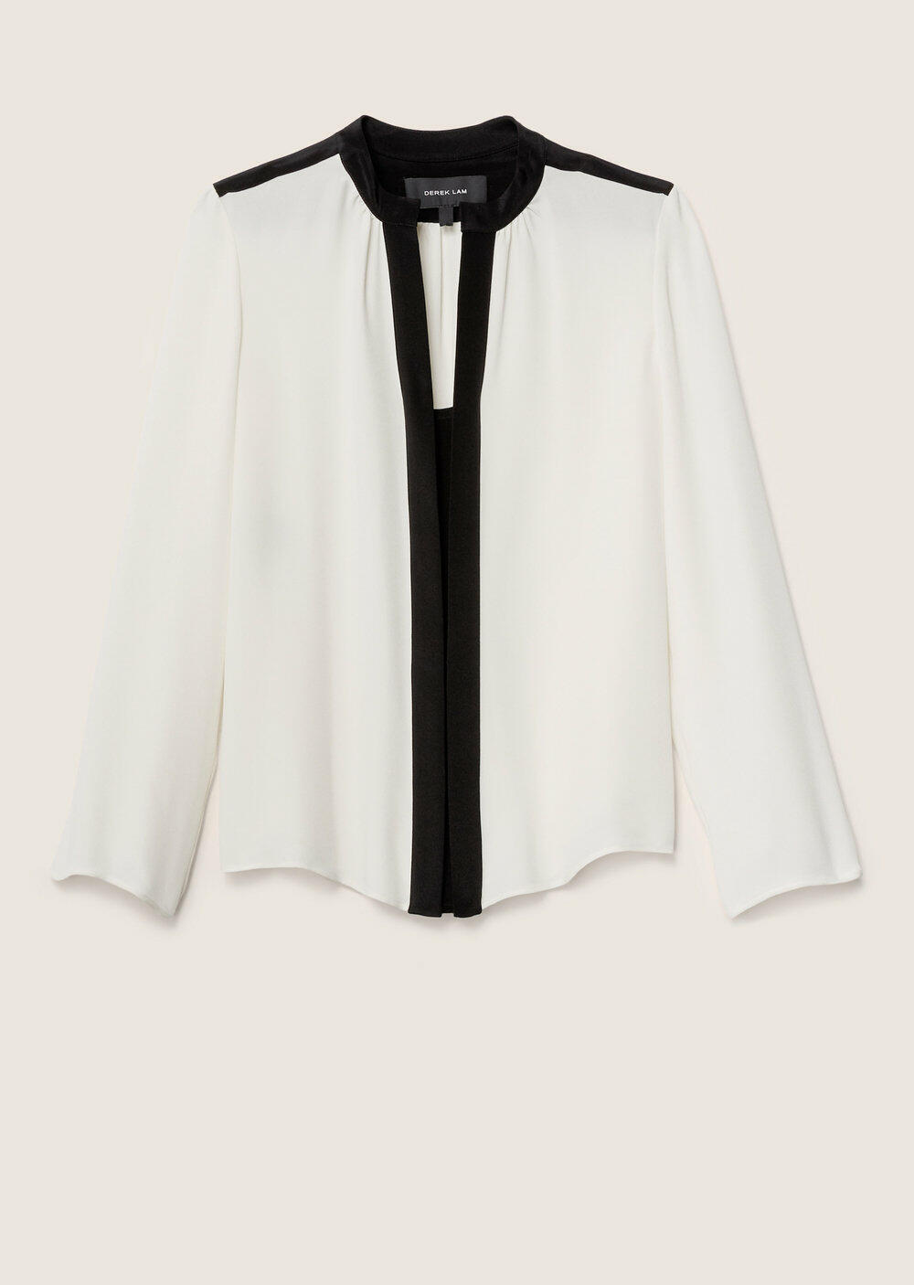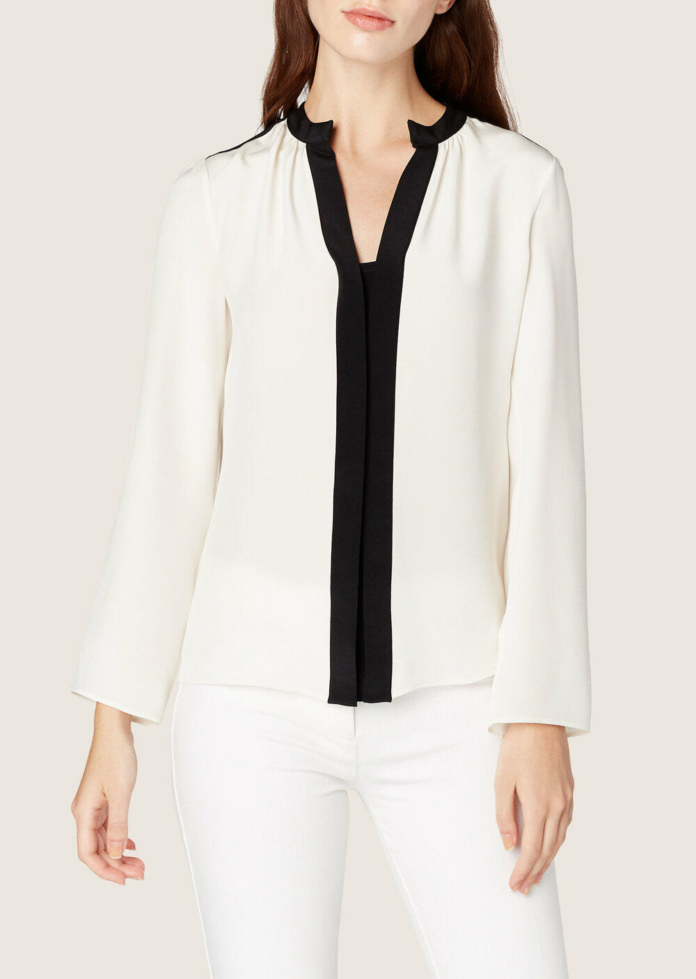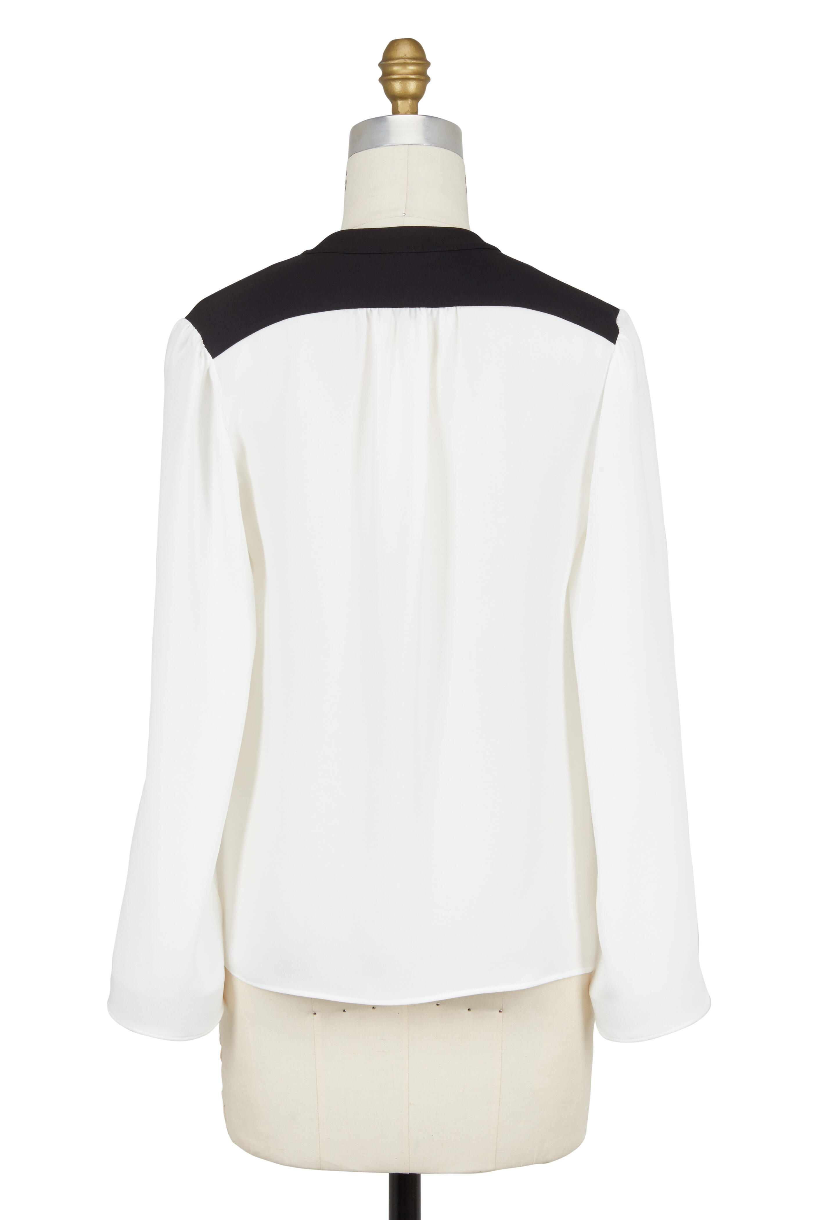 Gathered neckline. Contrast black trim. Imported. 100% silk. Dry clean.