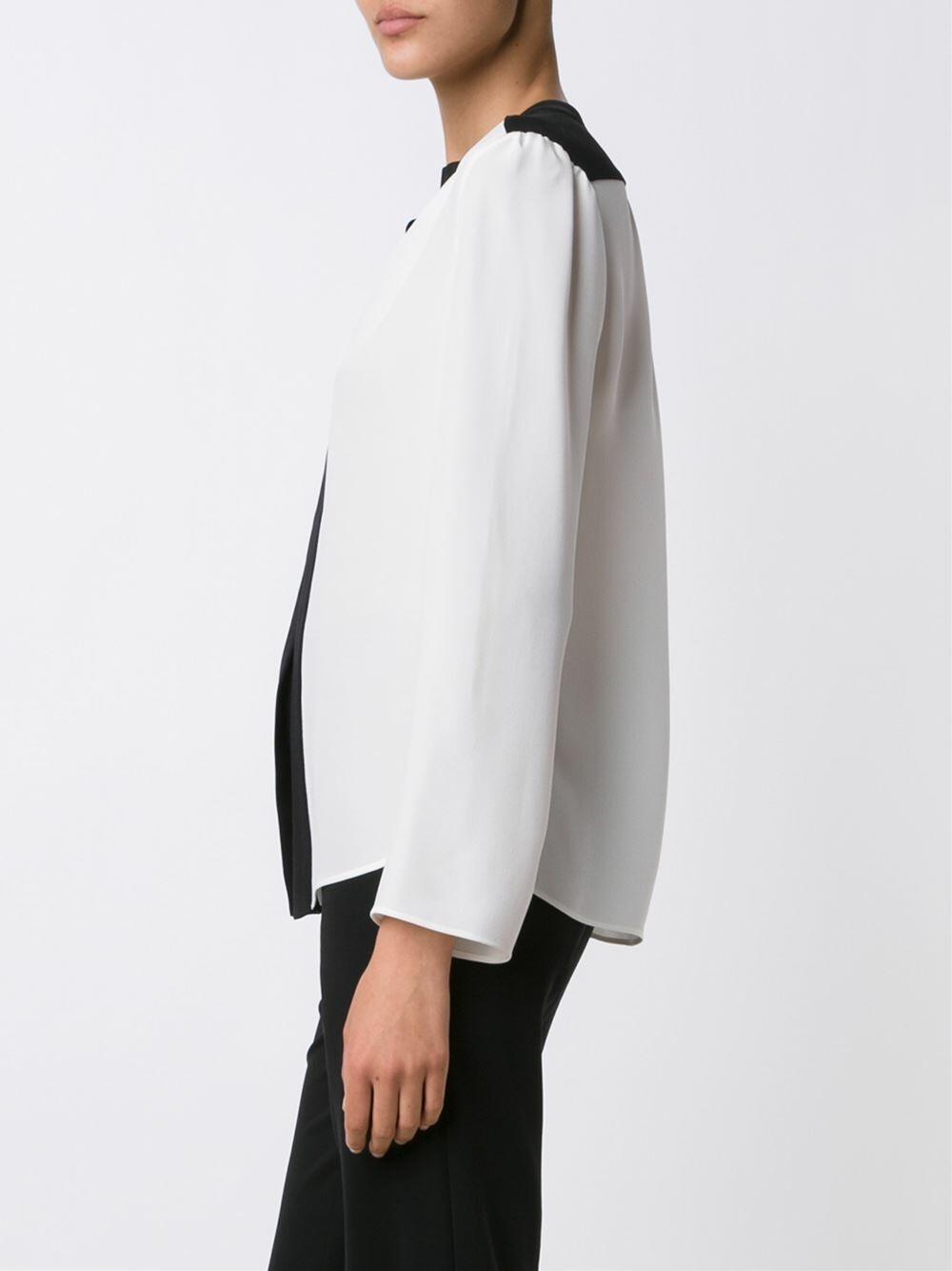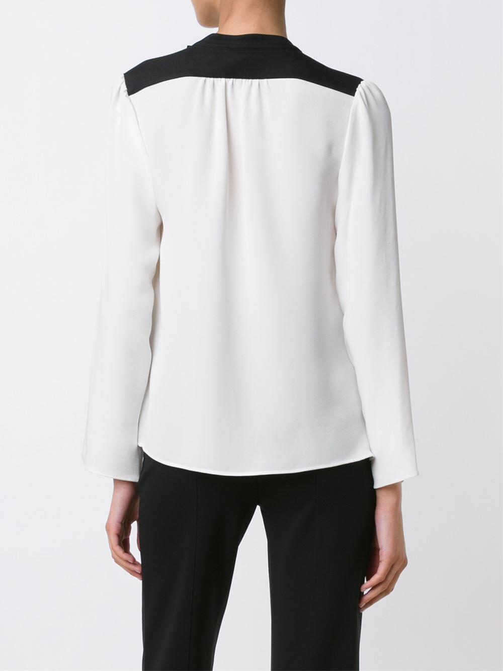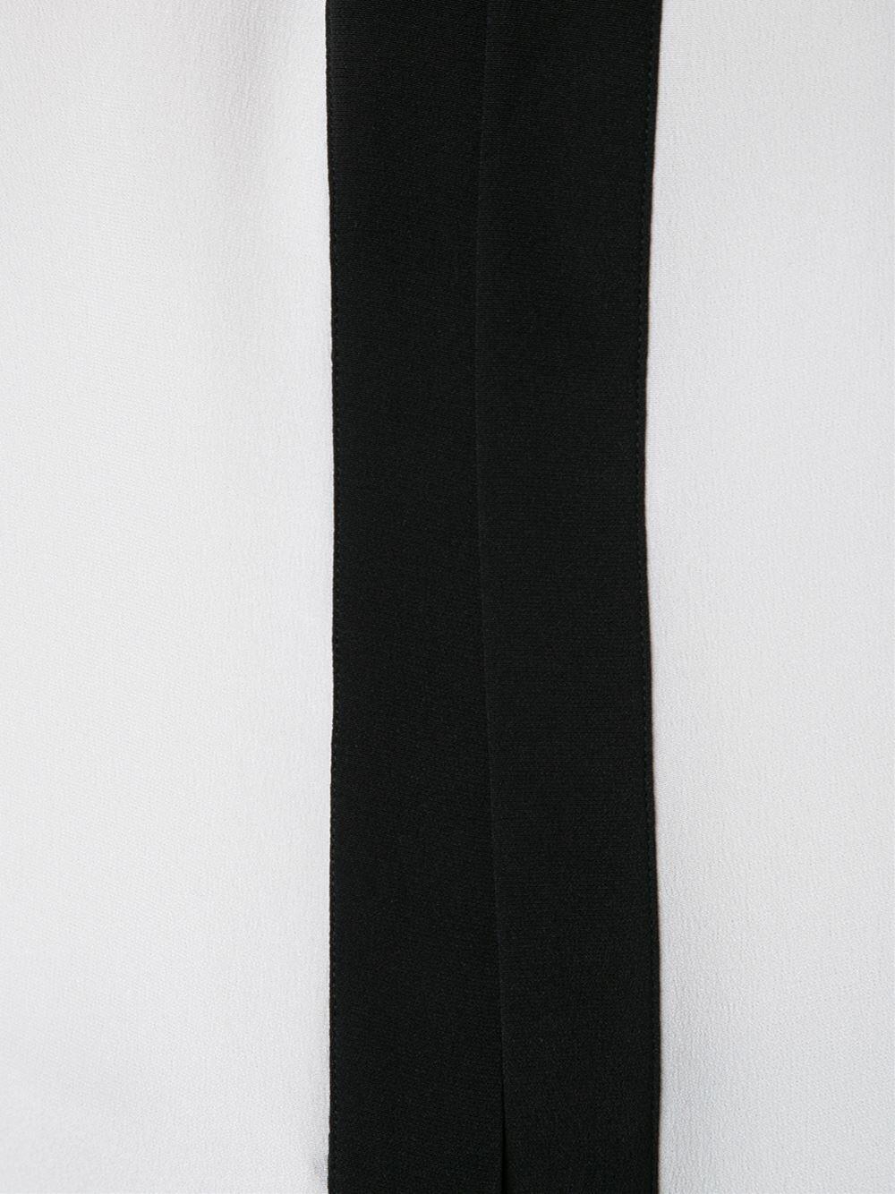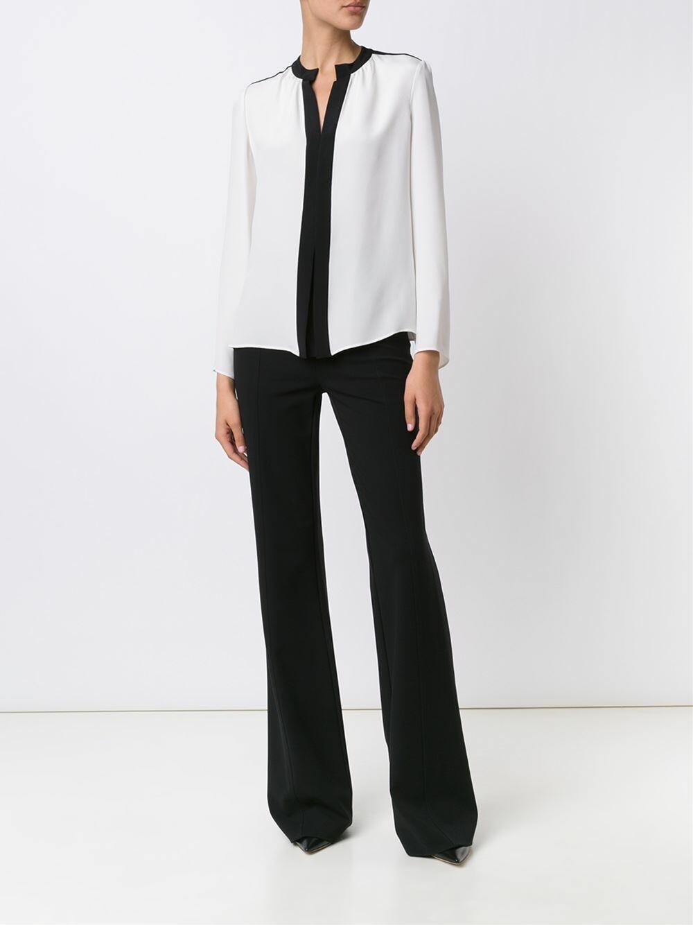 Gathered neckline. Contrast black trim. Imported. 100% silk. Dry clean.