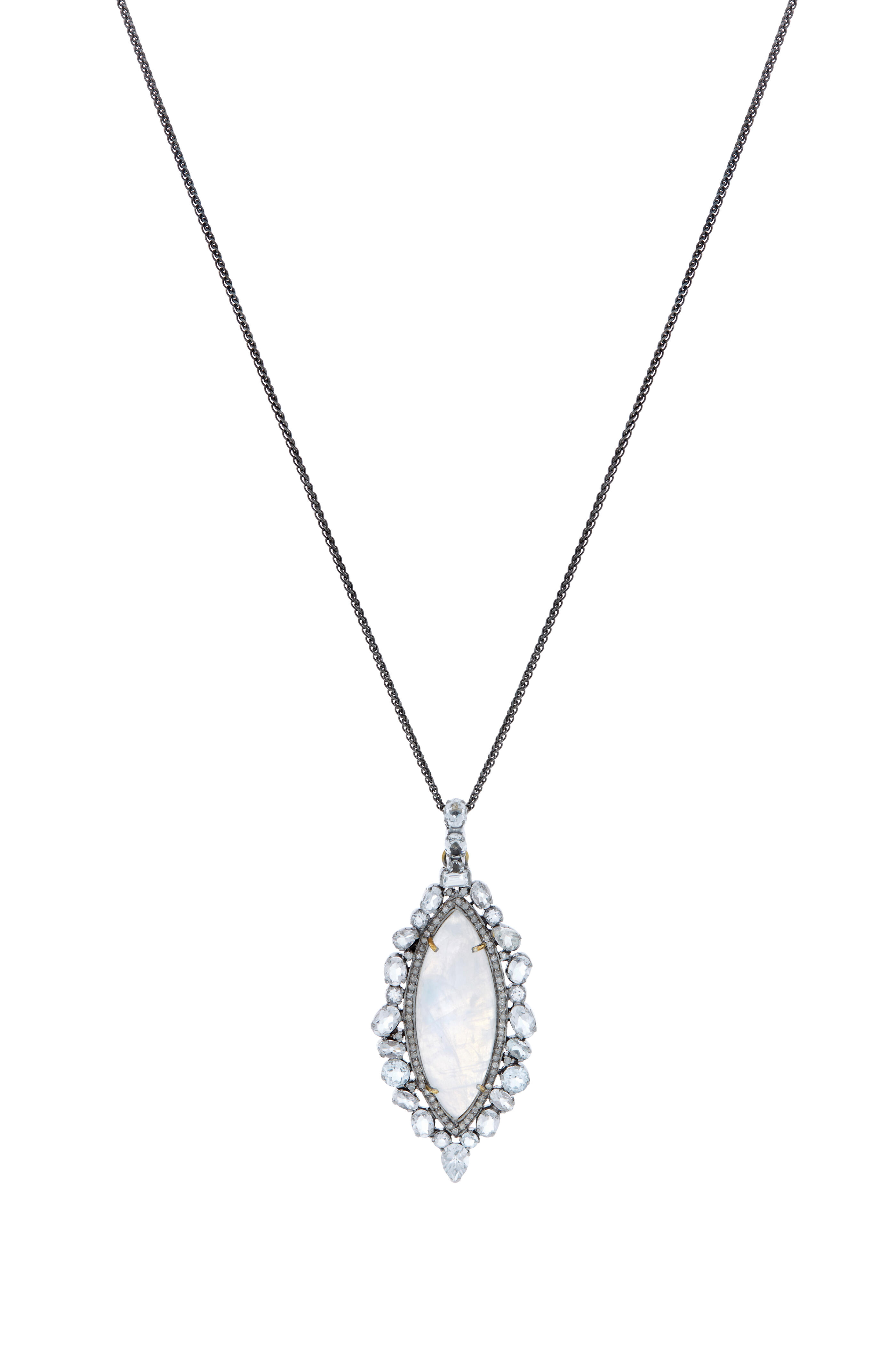 14k gold, sterling silver & black rhodium. Moonstones. White diamonds. Marquise moon pendant.