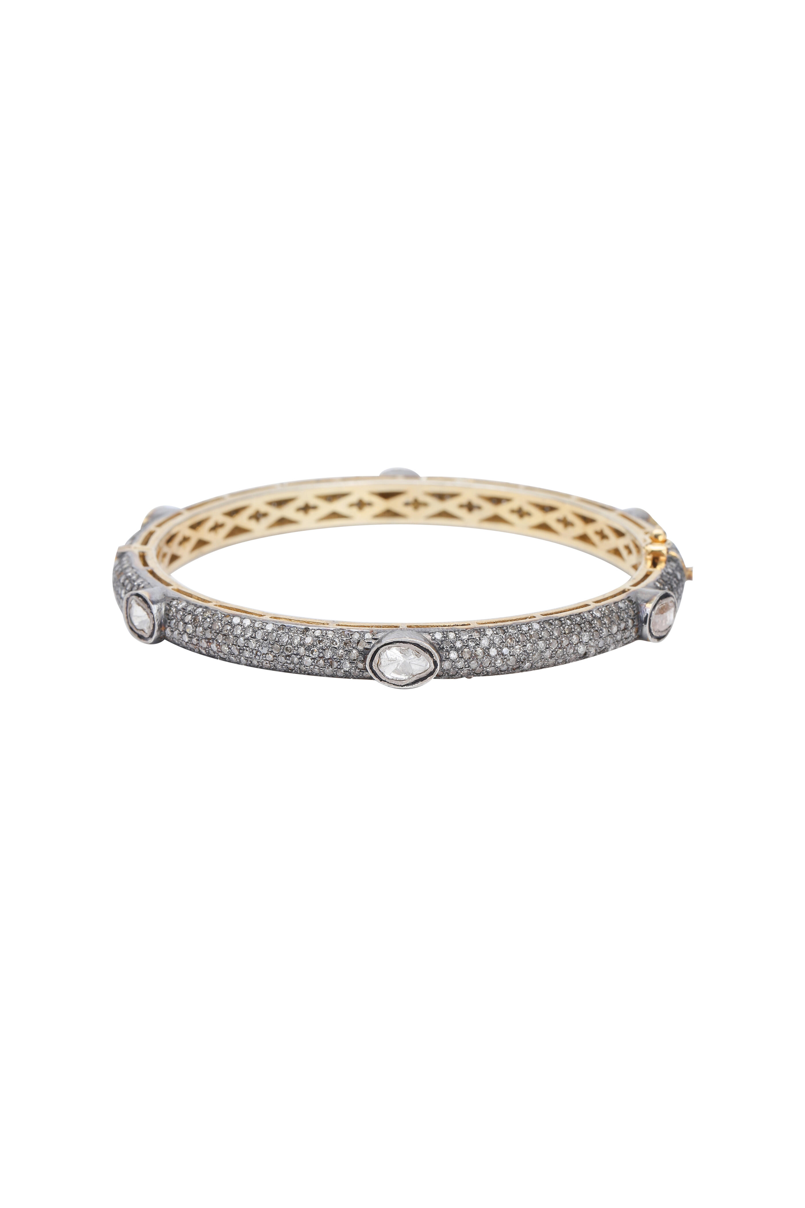 14k yellow gold & .925 sterling silver. Rose-cut white diamonds. Bangle bracelet.