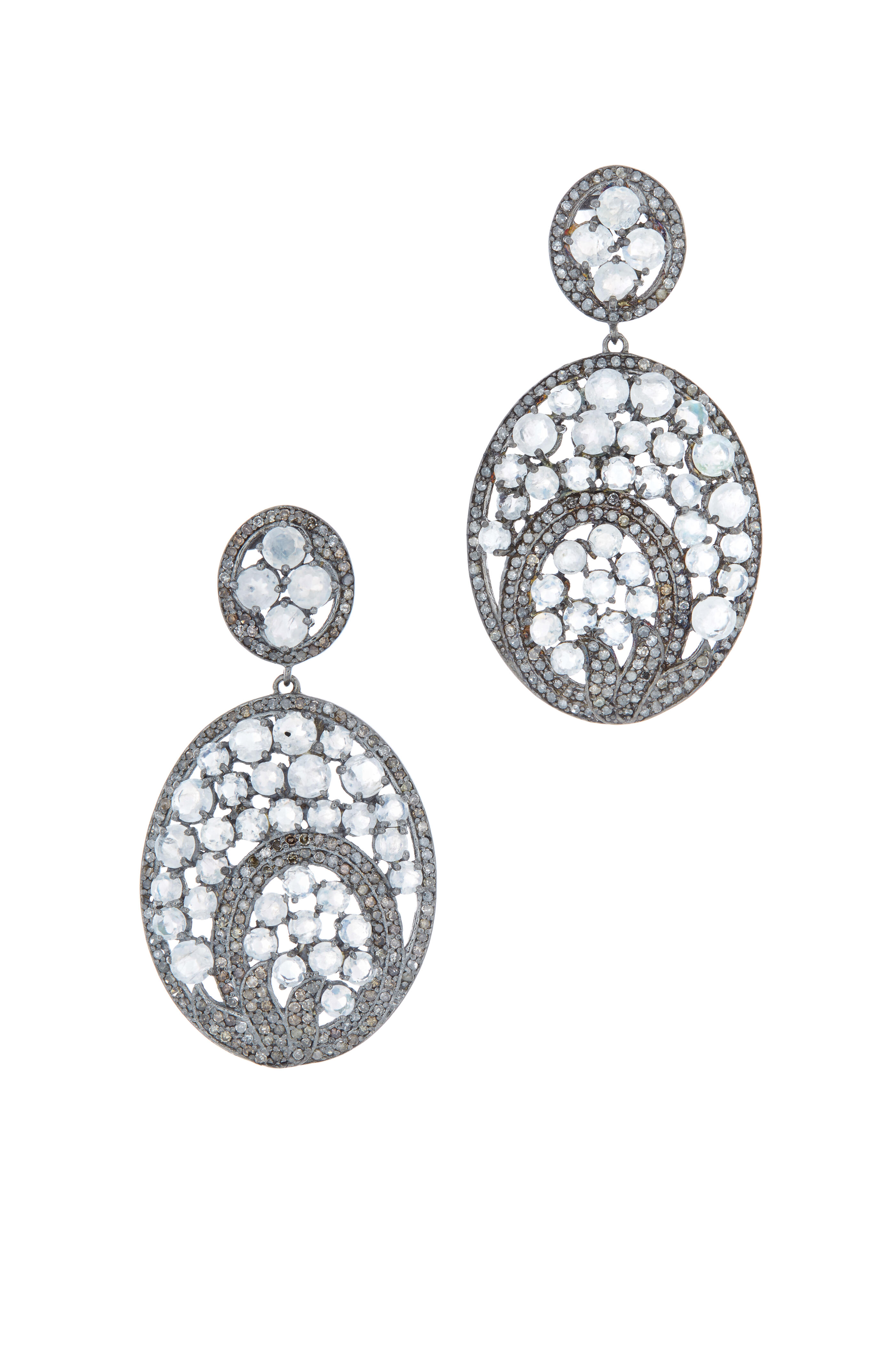 14k white gold, .925 sterling silver, black rhodium. Large oval moonstones. White diamonds.
