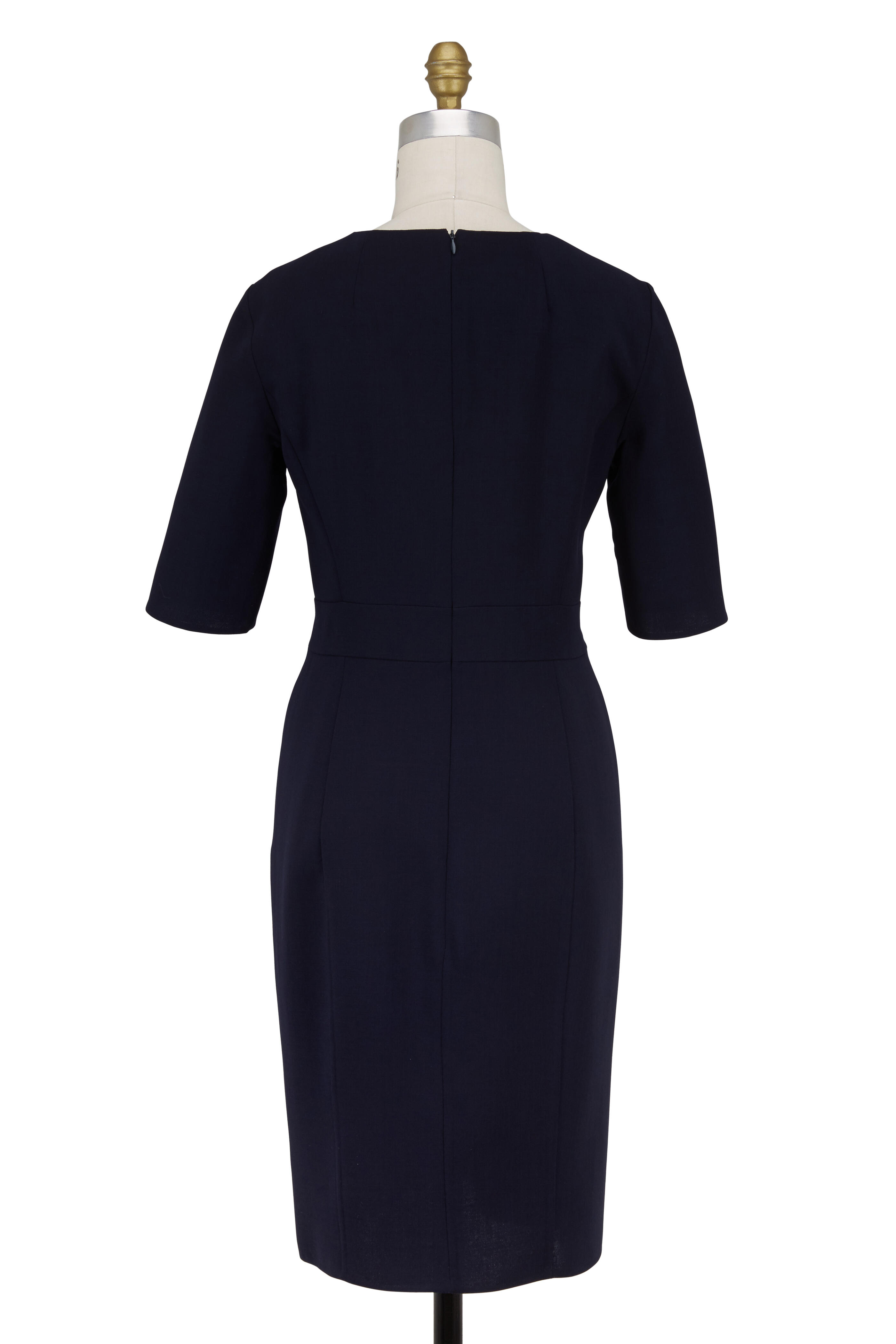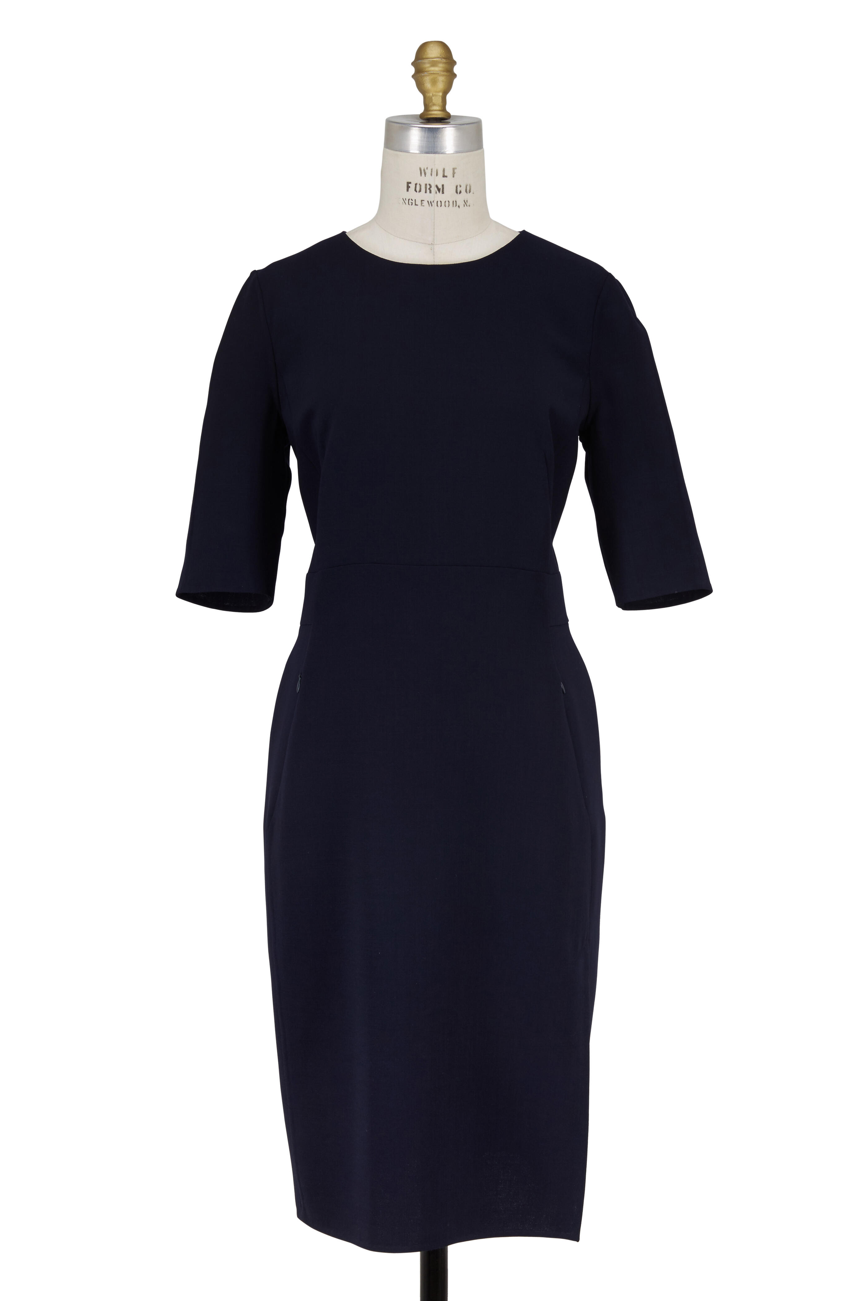 Round neckline. Concealed back zip closure. Elbow sleeves. Front zip pockets. Front vent. Fabric from Italy. 39" shoulder to hem (size 8). 99% wool, 1% polyamide; fully lined. Dry clean.