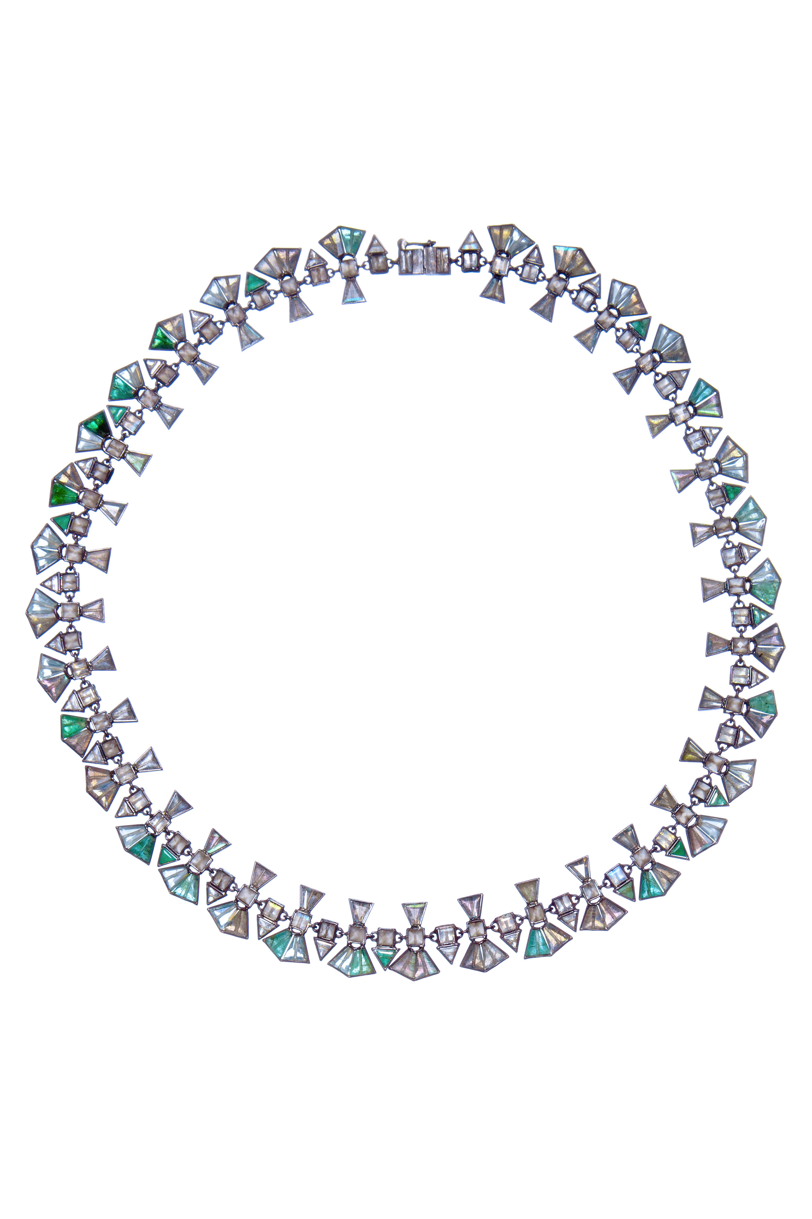 .925 sterling silver. Labradorite gemstones. Emerald gemstones. Gray sapphire gemstones. 18" length.