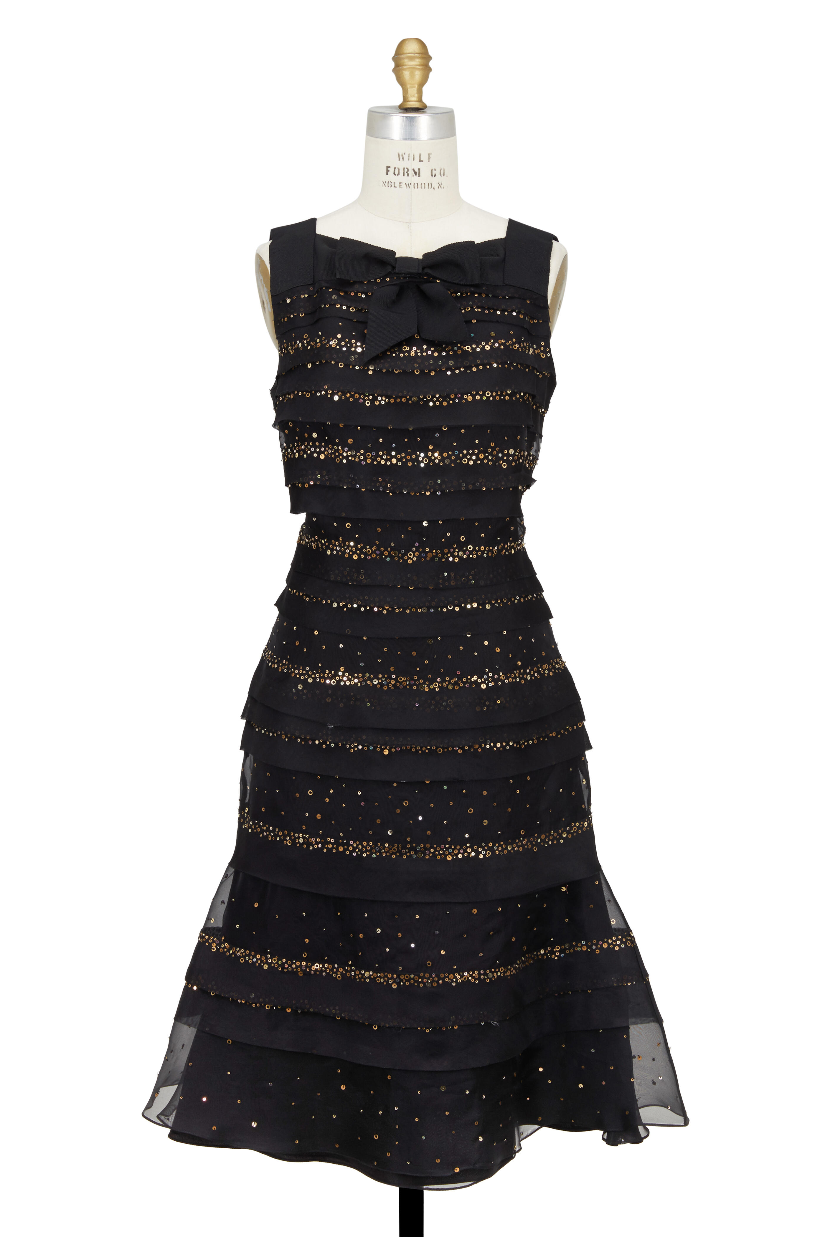 Square neckline with grosgrain ribbon detail and bow at neck. Concealed side zip closure. Gold-toned sequin embroidery. Ruffled hem. Made in the USA. 100% silk; lining: 100% silk. Dry clean.