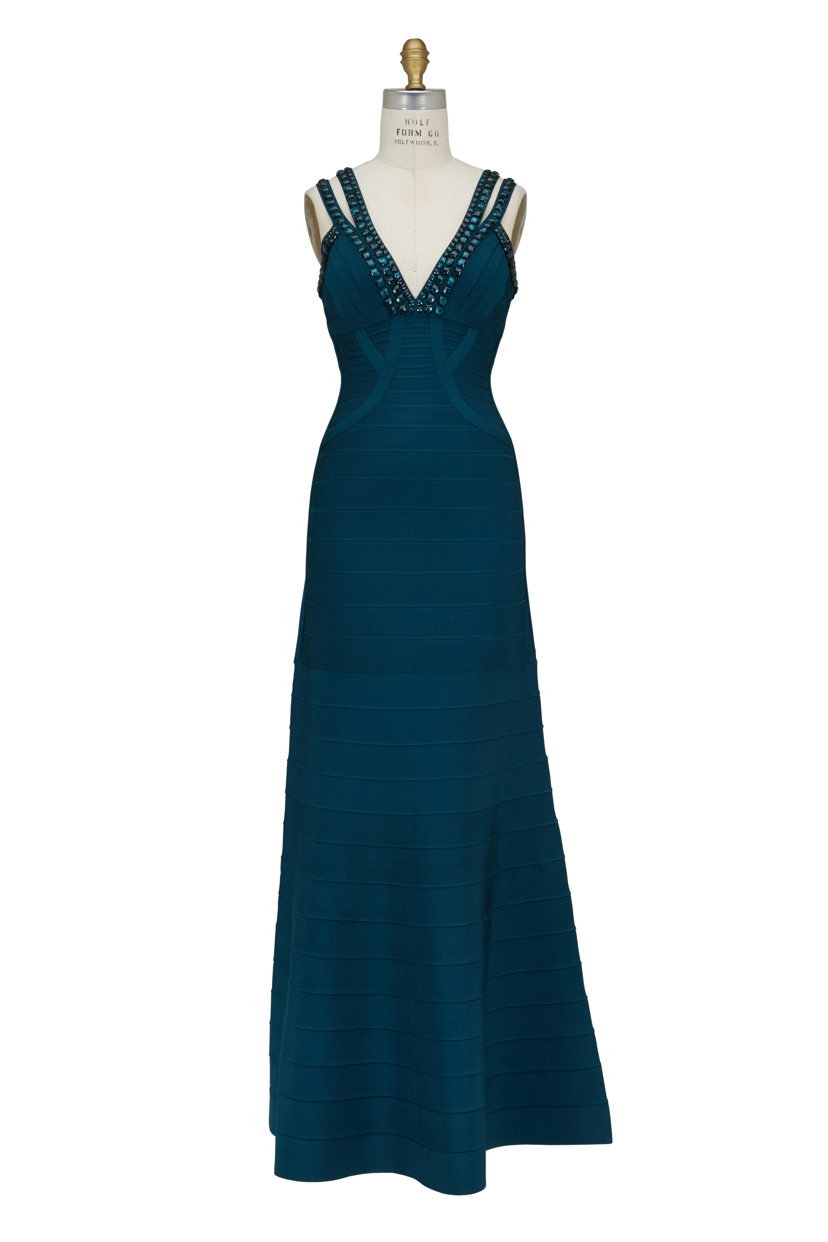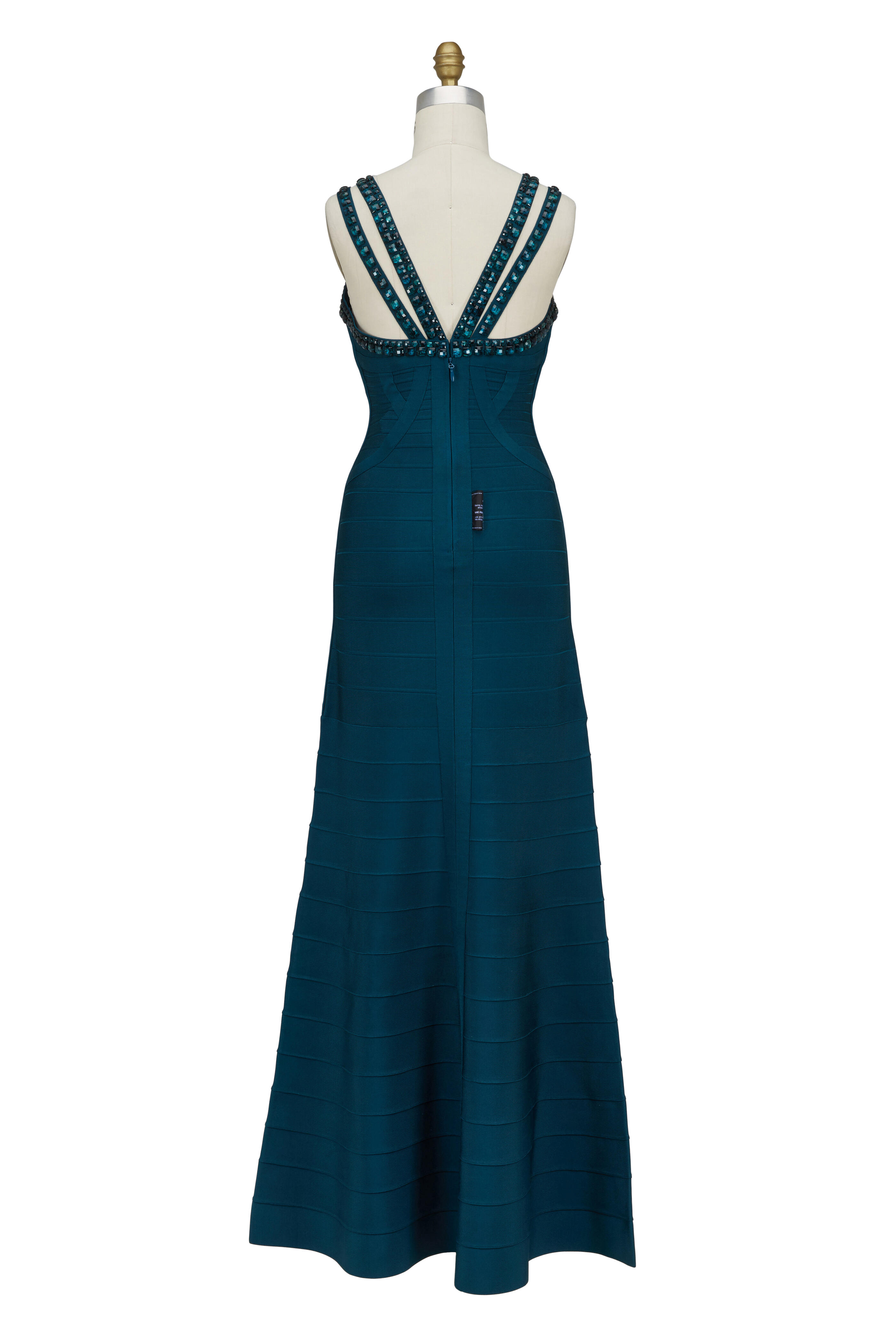V-neckline. Concealed back zip closure. Tonal bead embellishments. Flared hem. Imported. 90% rayon, 9% nylon, 1% elastane; unlined. Dry clean.