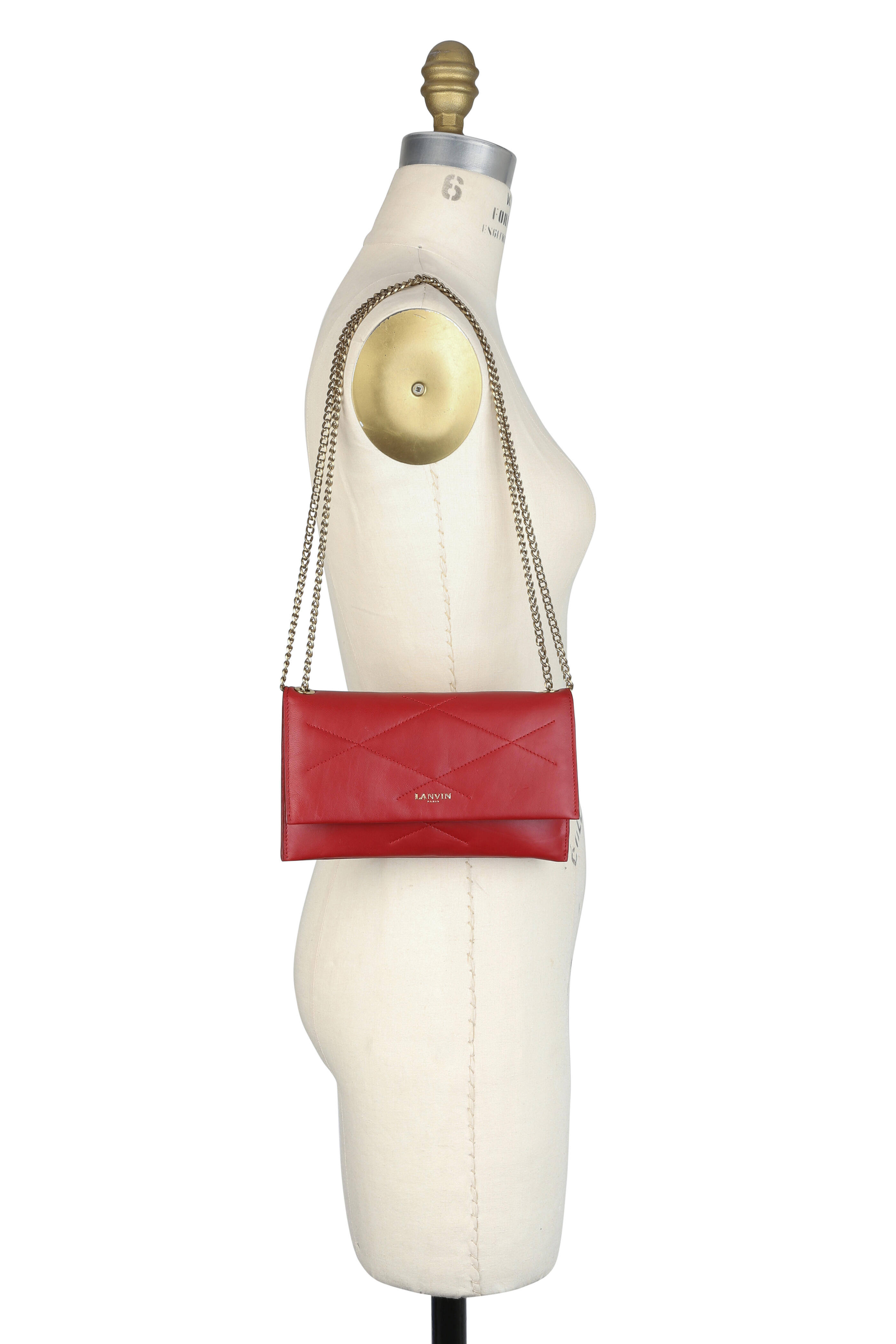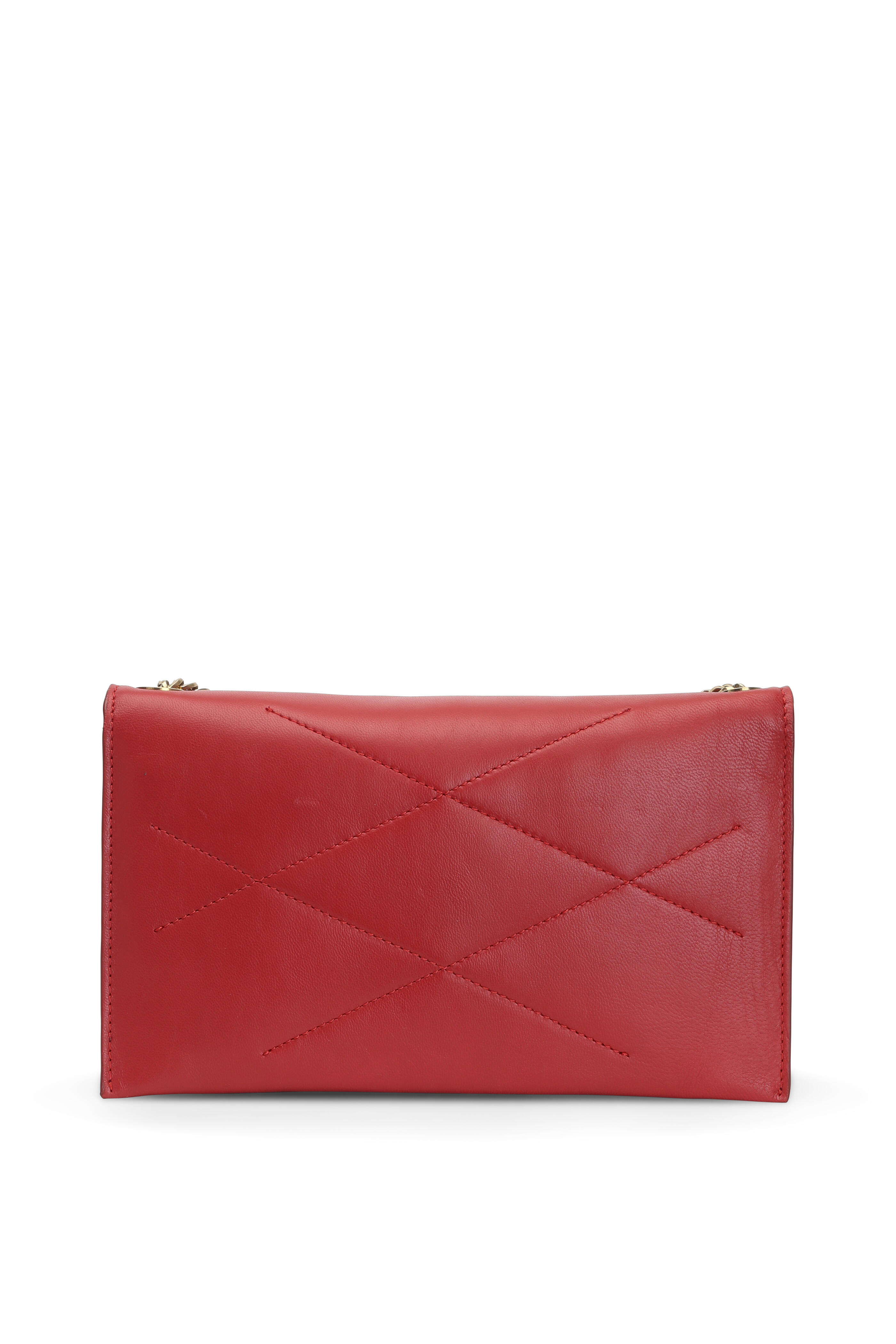 Lambskin leather. Gold-toned chain strap. Flap front with magnetic snap closure. Interior zipped coin pocket, two open pockets and six card slots. Fully lined. Made in Italy. Width: 8 ¼". Height: 5". Depth: 1". Strap drop: 12".