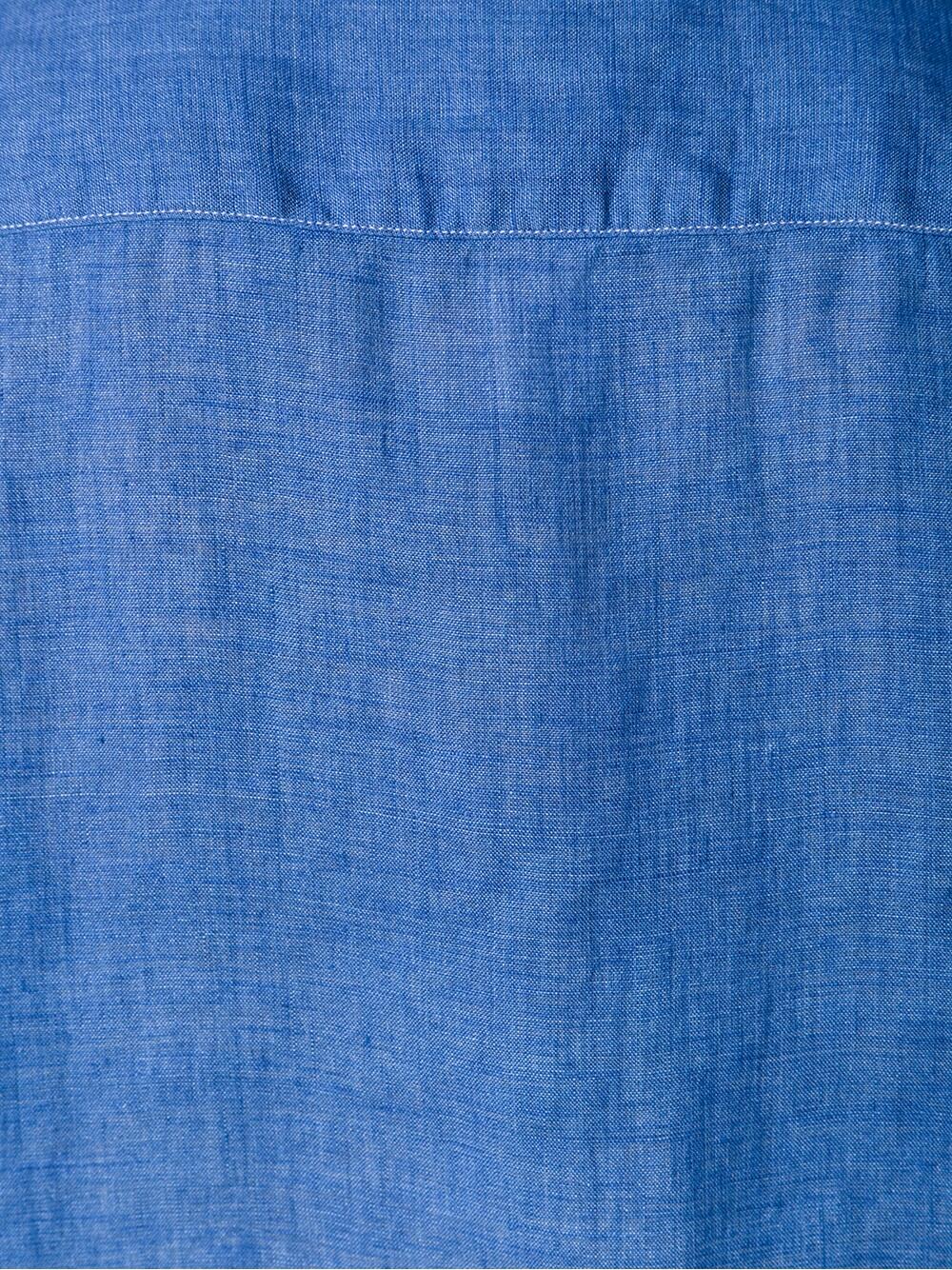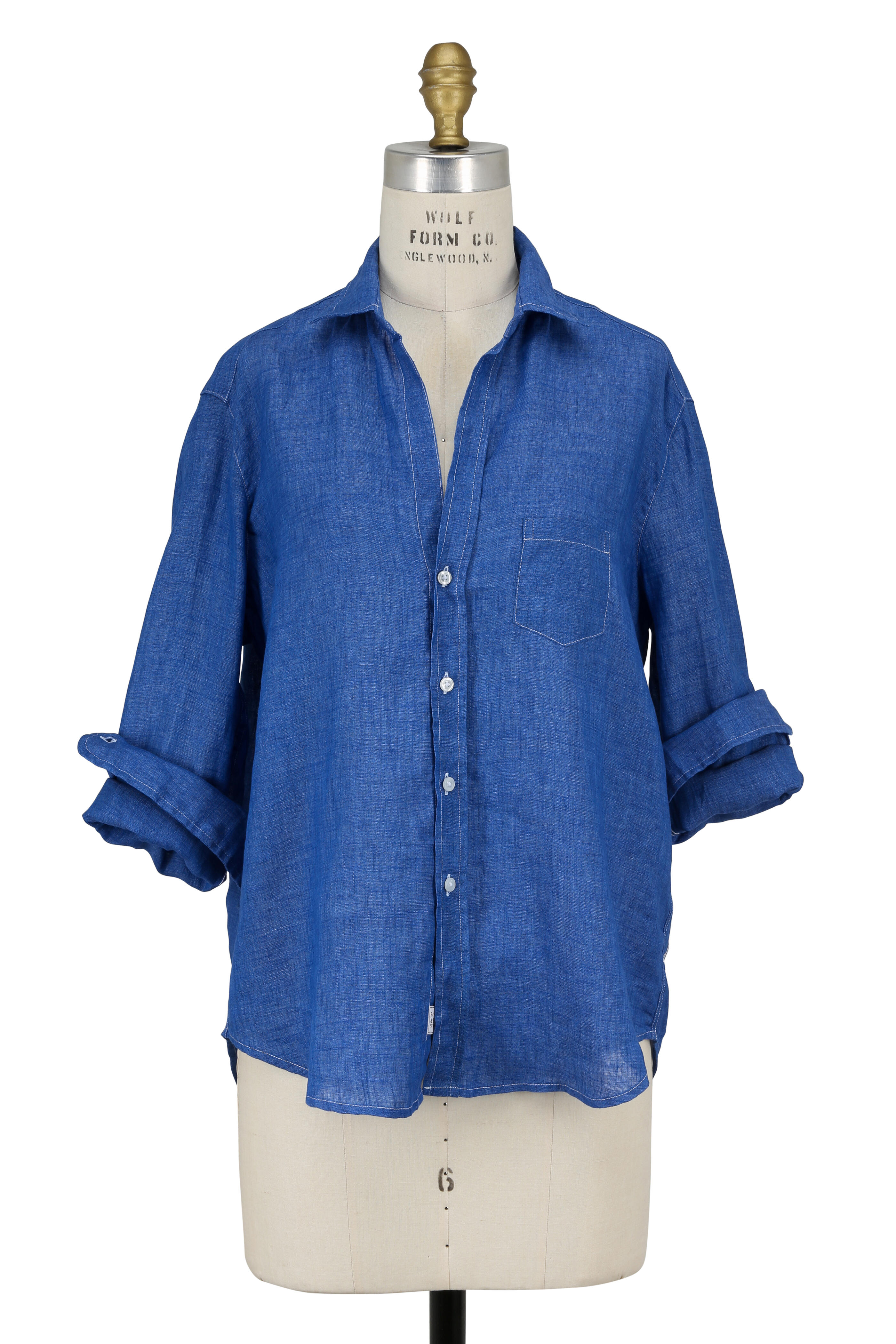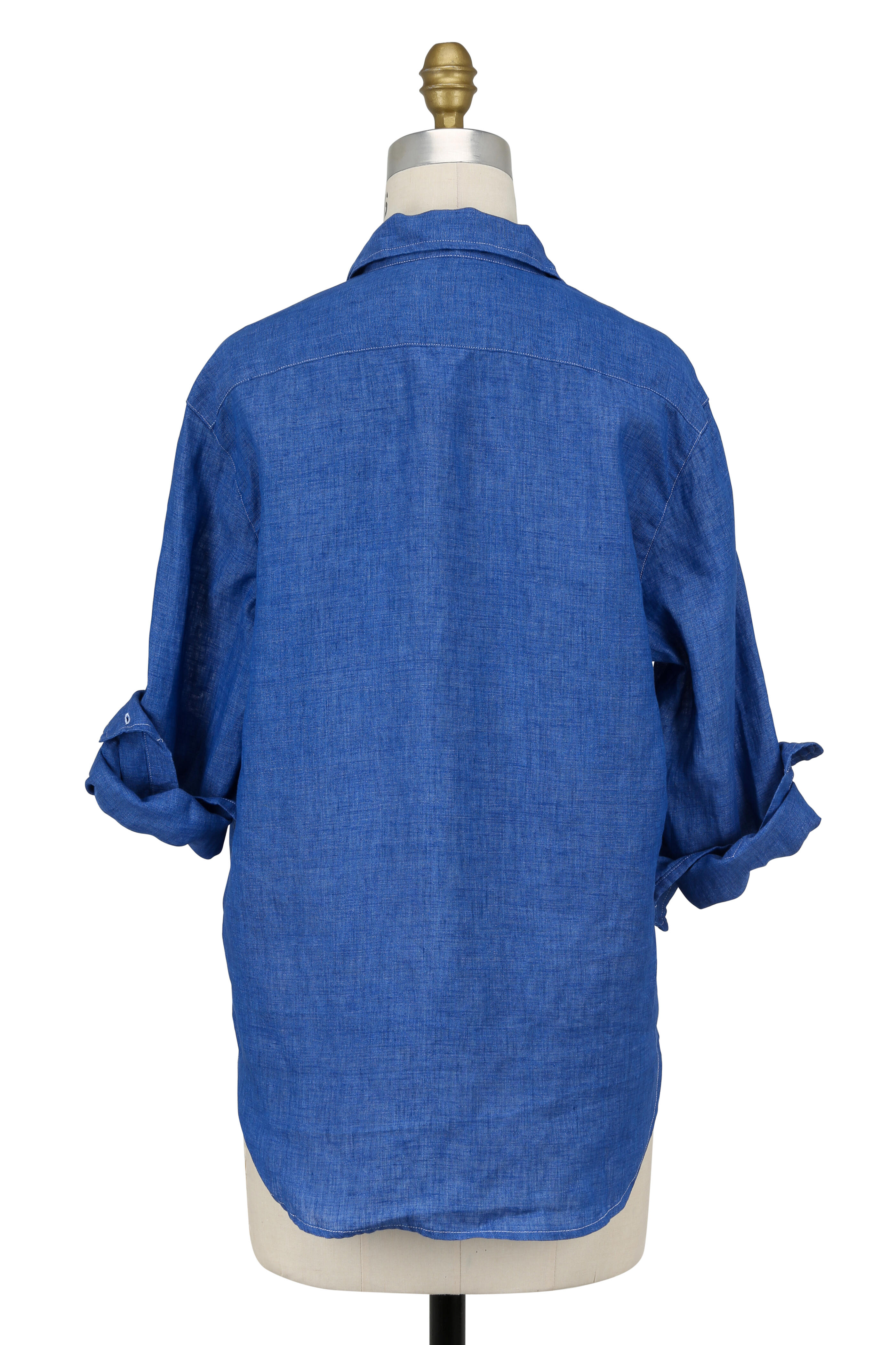 Spread collar. Button front. Chest pocket. Single button cuffs. Curved hemline. Made in the USA. 100% linen. Machine wash.