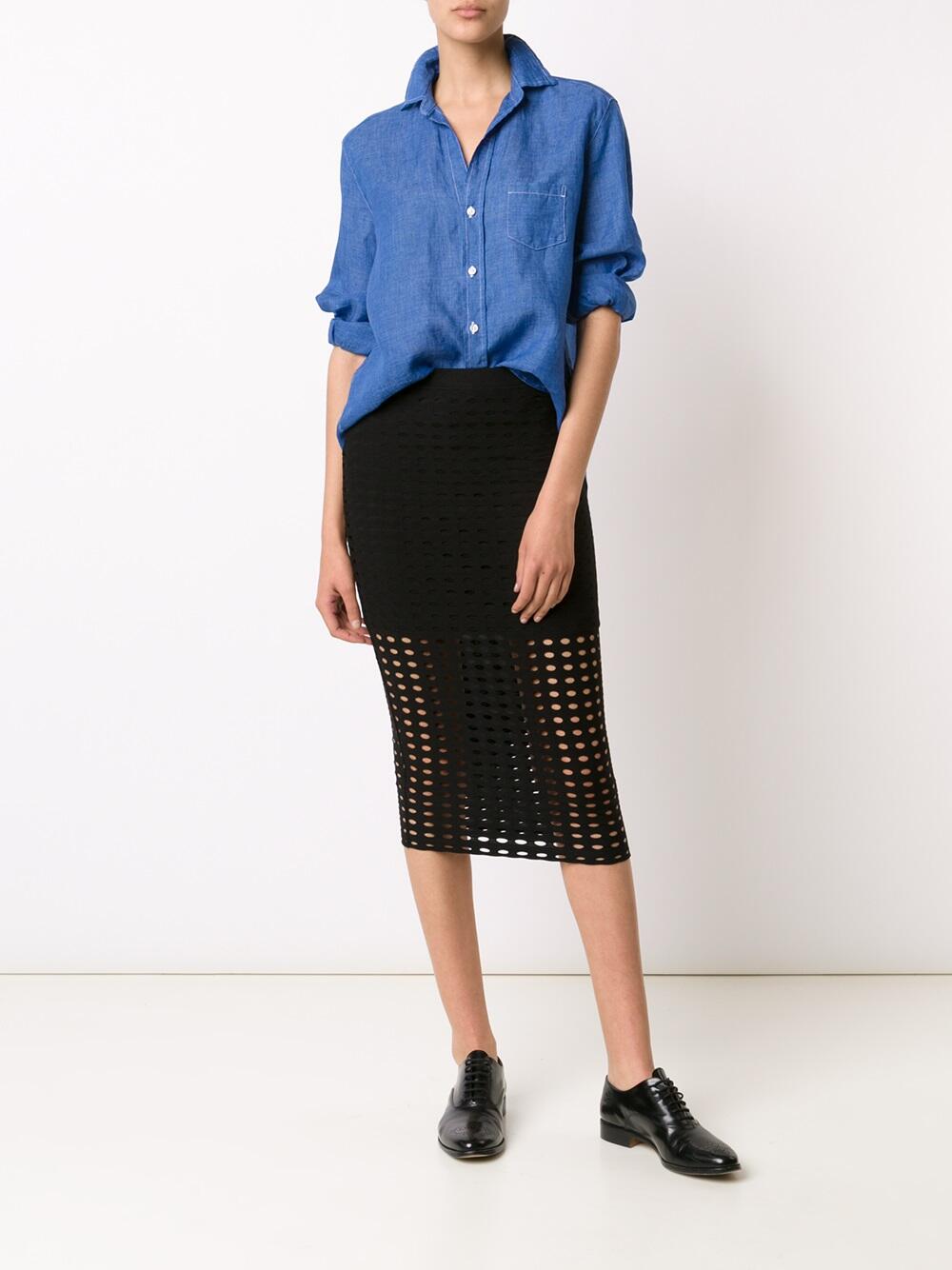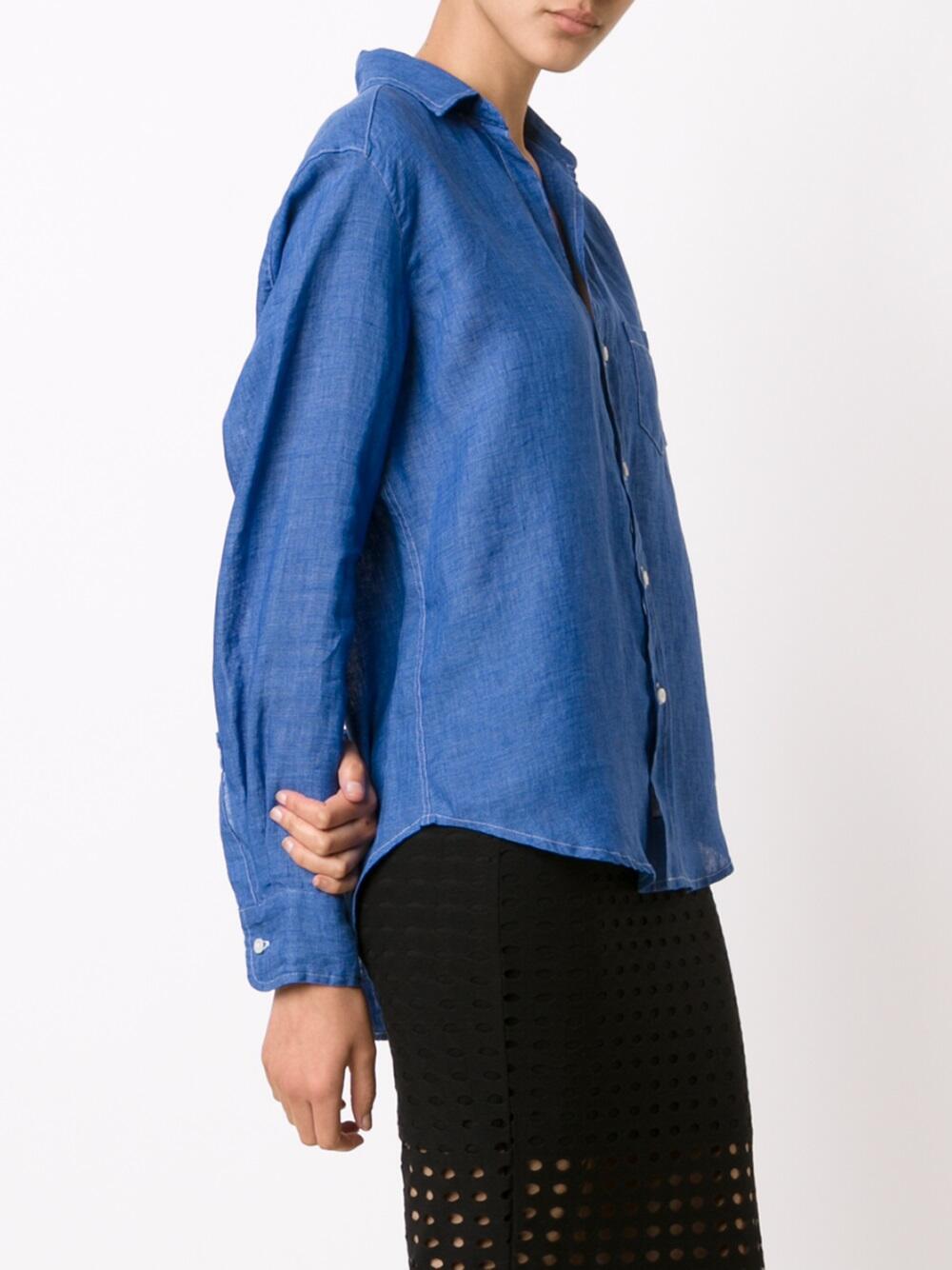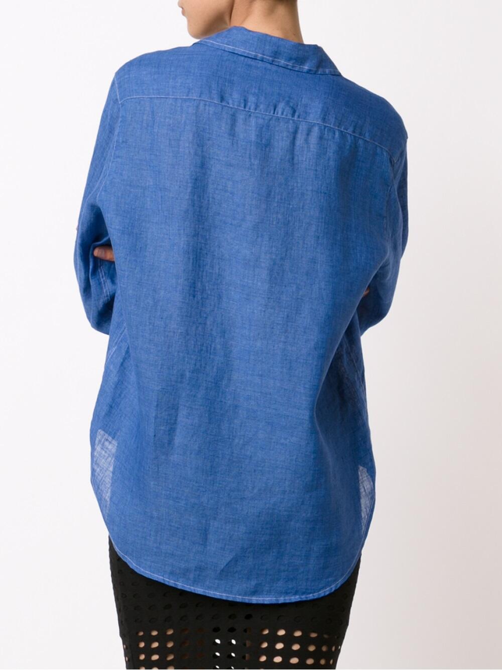 Spread collar. Button front. Chest pocket. Single button cuffs. Curved hemline. Made in the USA. 100% linen. Machine wash.