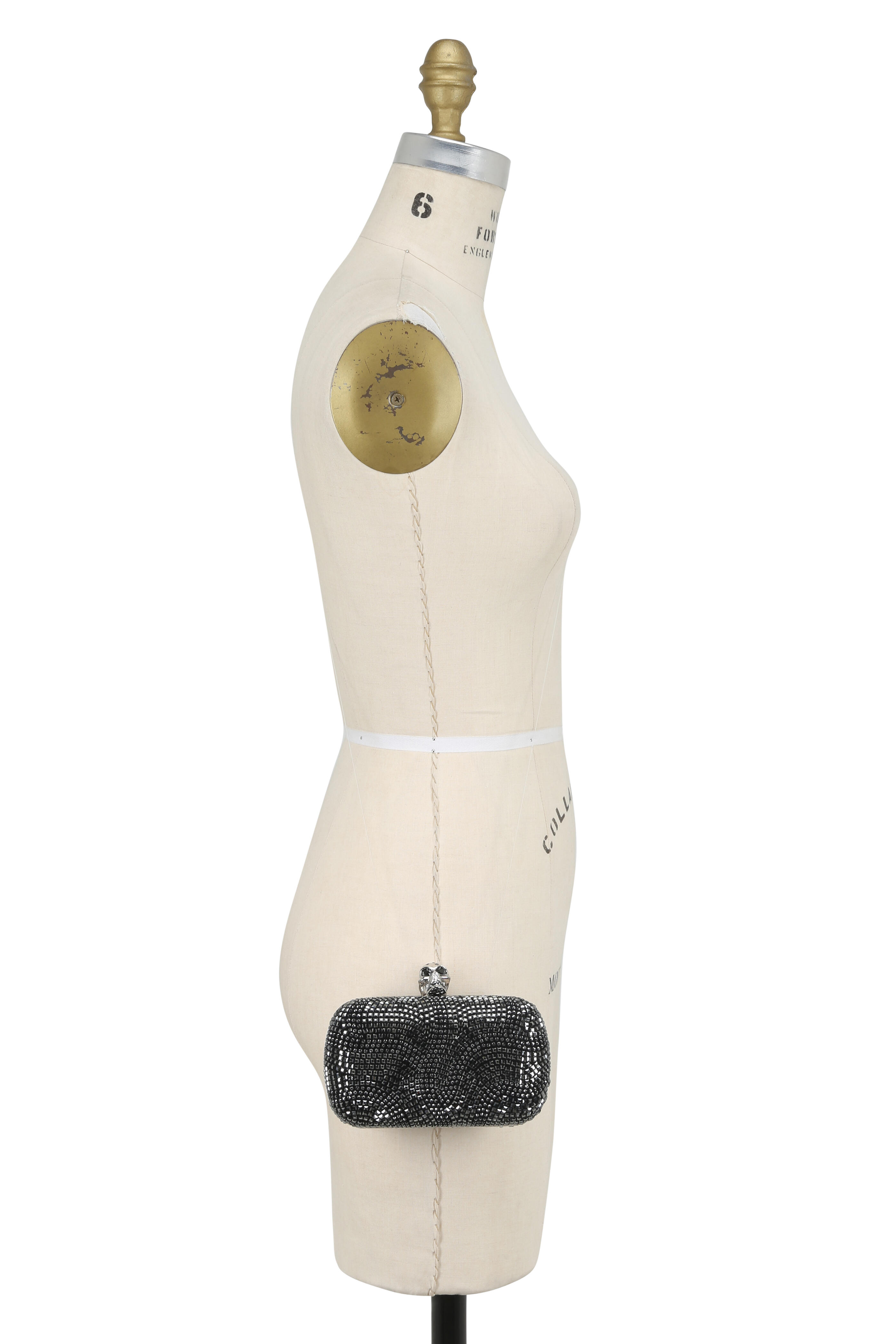 Full crystal embellished leather. Hinged clasp with signature embellished skull detail. Fully lined. Made in Italy. Width: 6 ½". Height: 4". Depth: 2".