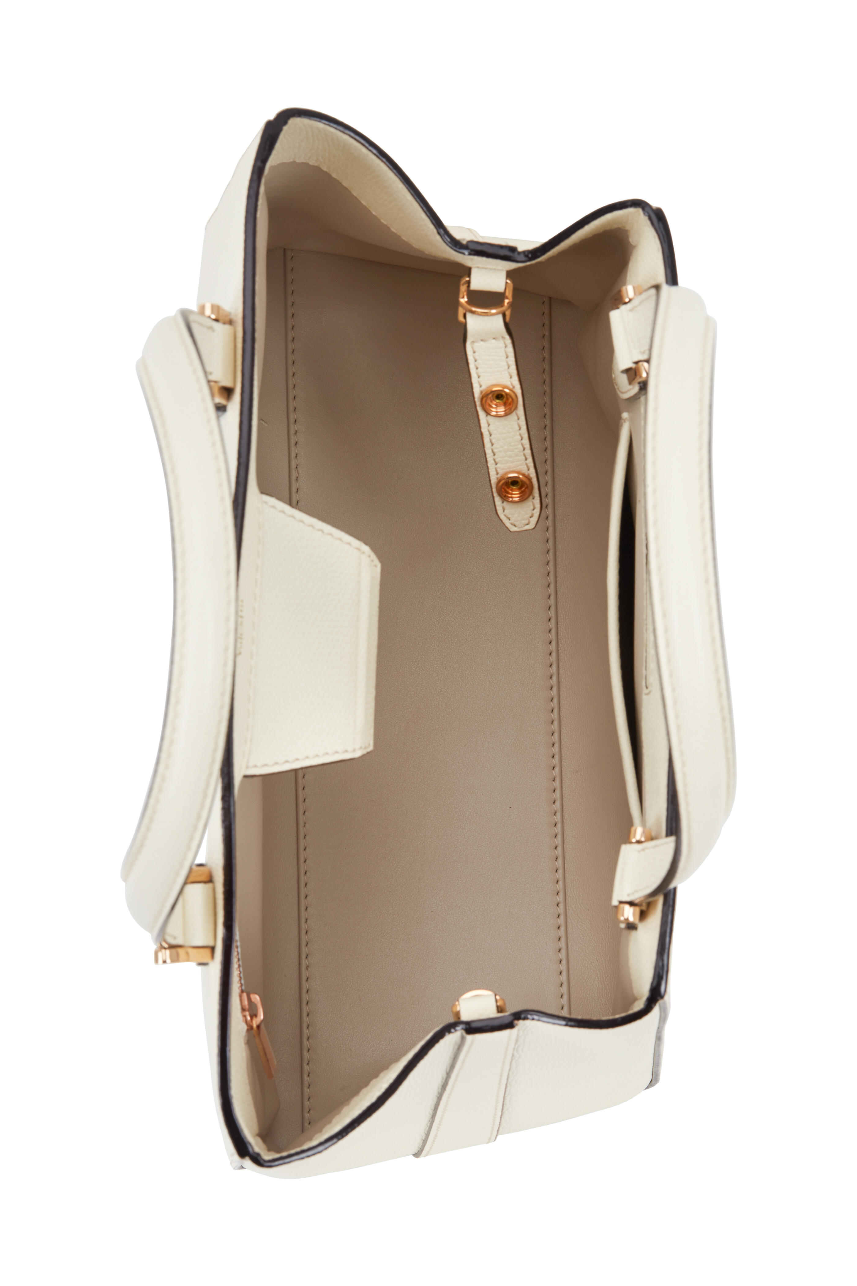Saffiano leather. Dual rolled top handles. Detachable flat shoulder strap. Asymmetric top line. Center snap-button tab closure. One interior zip and one open pocket. Lined in leather. Protective metal feet. Made in Italy. Width: 11". Height: 9". Depth: 5". Handle drop: 4 ½". Strap drop: 16".