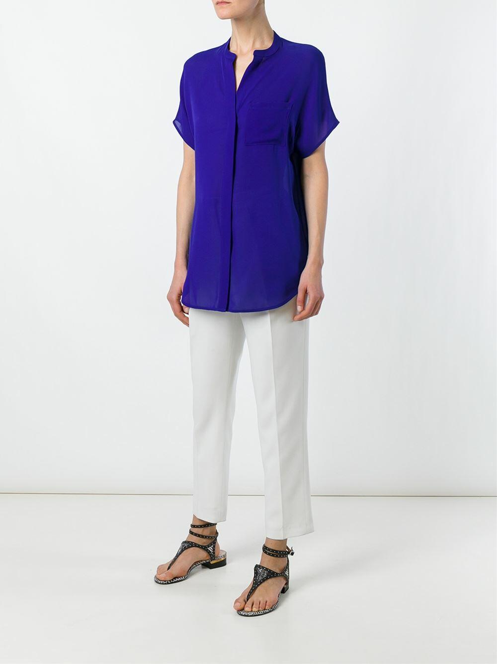 Deep V-neckline. Concealed button placket. Chest pocket. Imported. Relaxed fit. 100% silk. Dry clean.