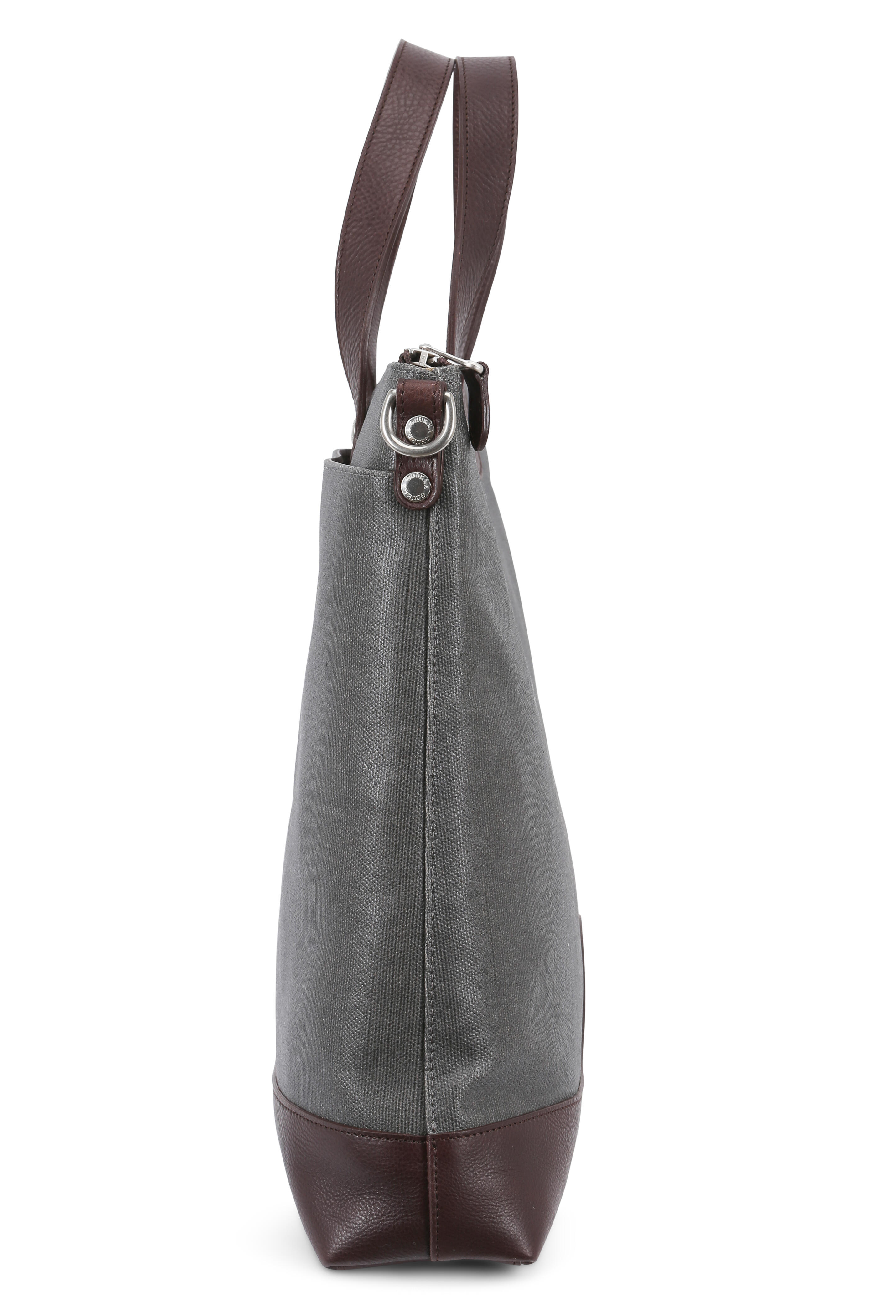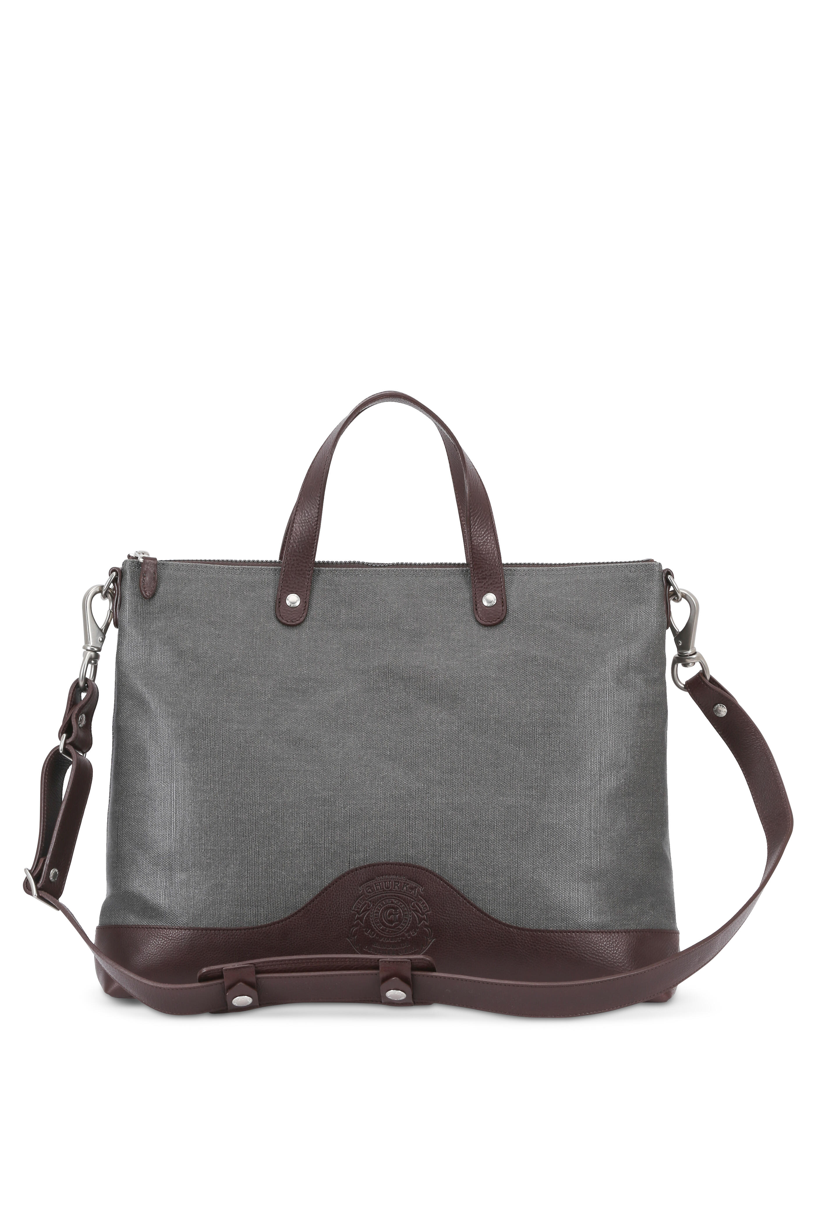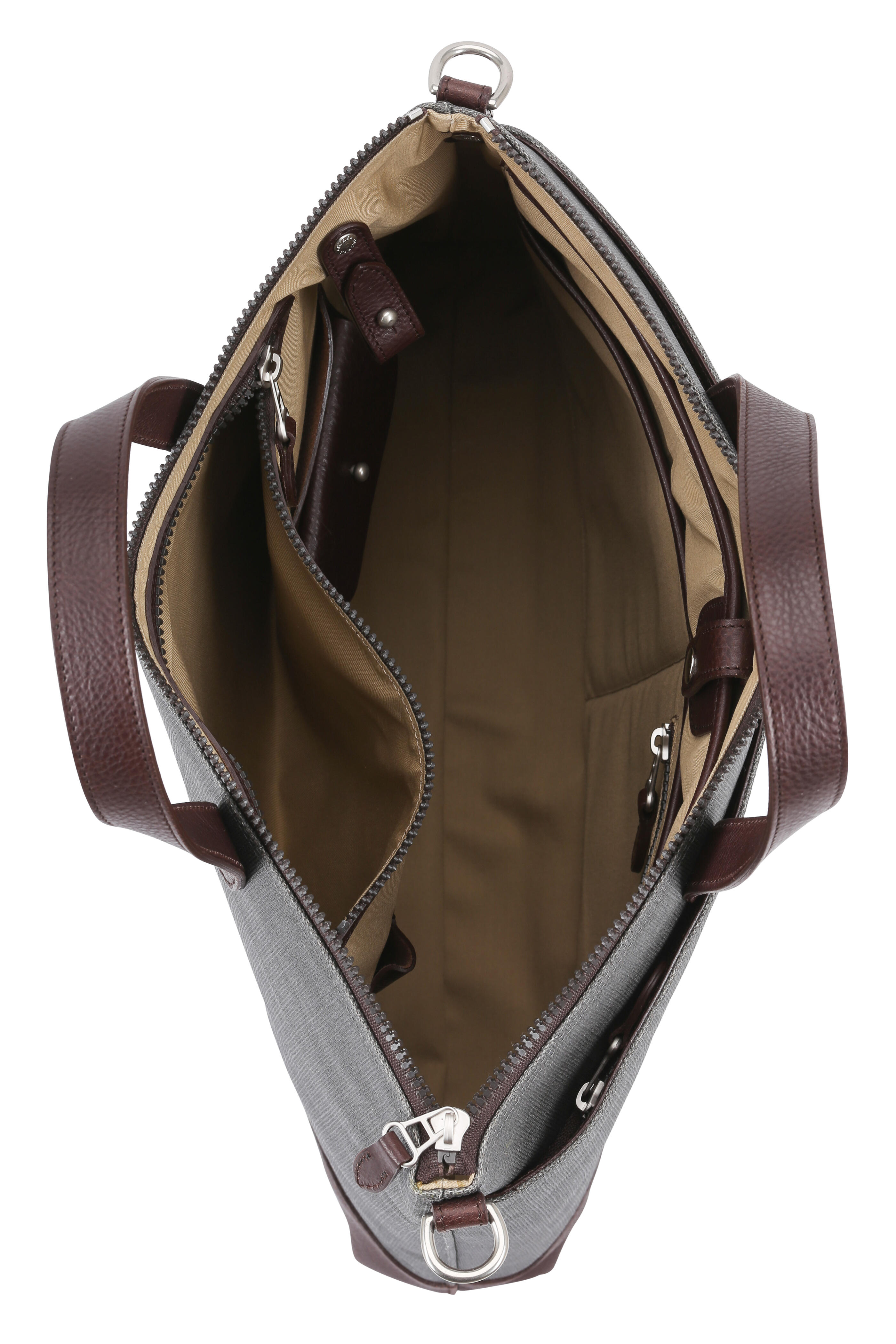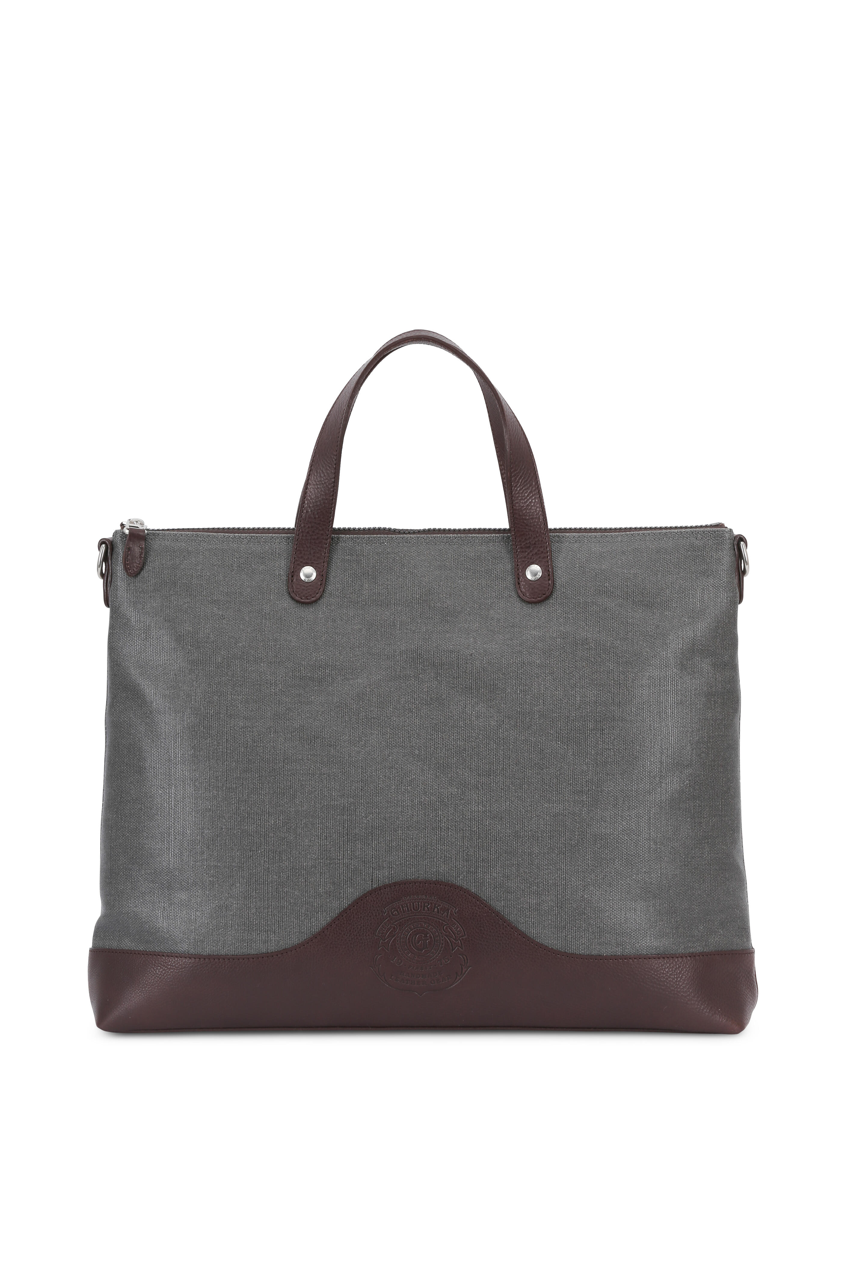 Tech fabric and leather. Dual flat top handles. Detachable shoulder strap. Top zip closure. Exterior back zipped compartment. Padded laptop compartment with tab closure. Two interior zipper compartments. Loop for keys, holder for pens and business card holders. Fully lined. Imported. Stain-resistant, water-resistant and lightweight fabric. Width: 17". Height: 12". Depth: 4".