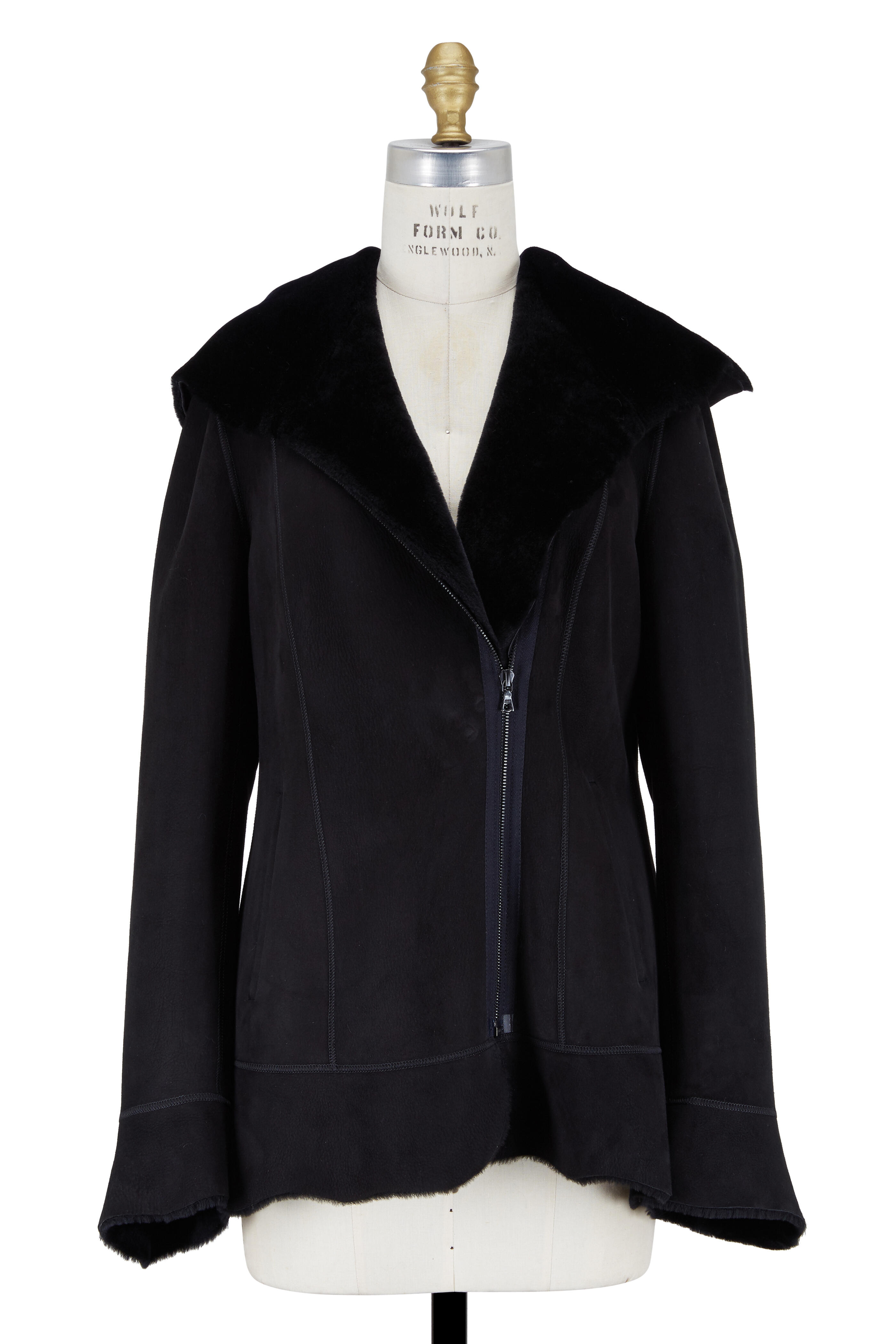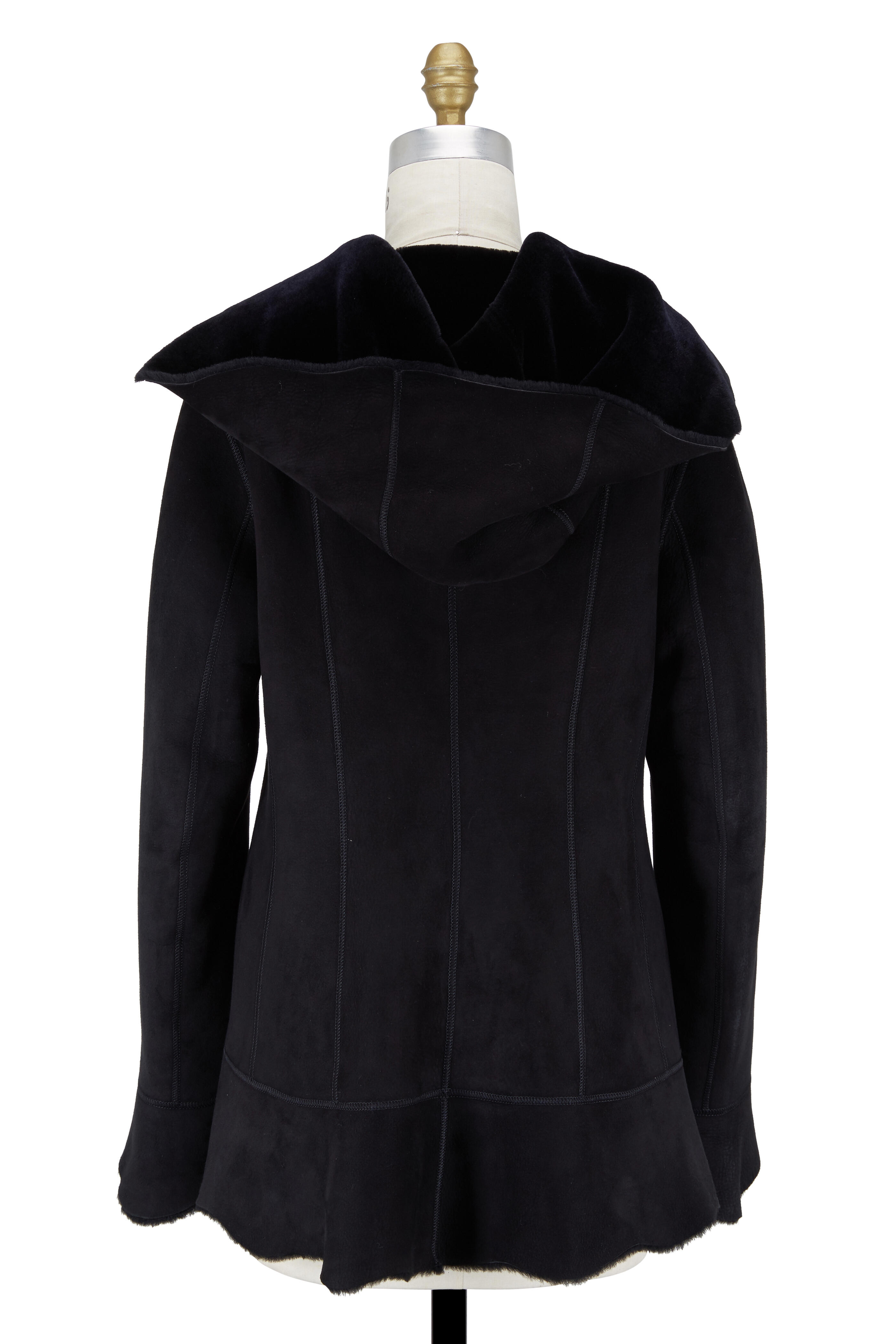 Shearling. Specialist clean. Attached hood. Asymmertic zip front closure. Fluted cuffs. Side slash pockets. Ruffled hem. Imported. 28" shoulder to hem.