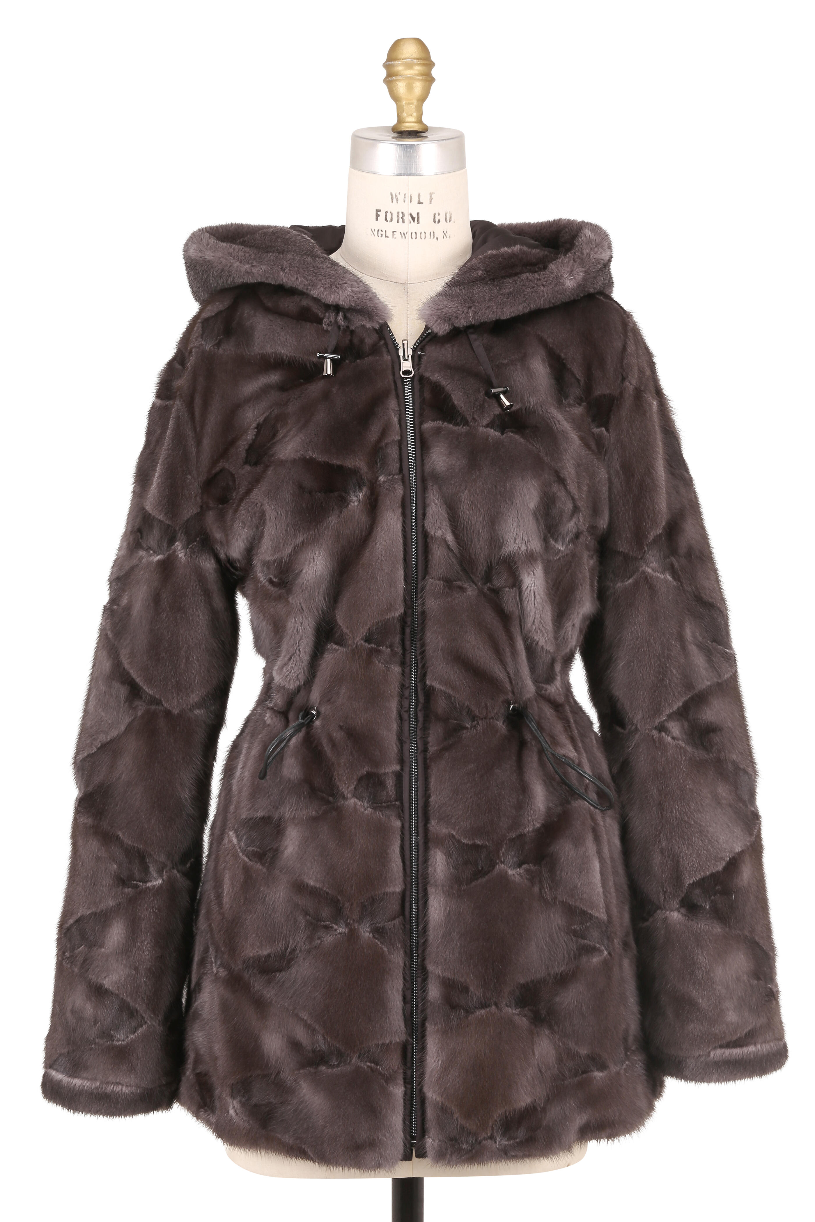 Mink; reverse side: nylon. Specialist clean. Drawstring hood. Front zip closure. Drawstring at waist. Front slip pockets. Reverses to black nylon. Imported. 30" shoulder to hem.
