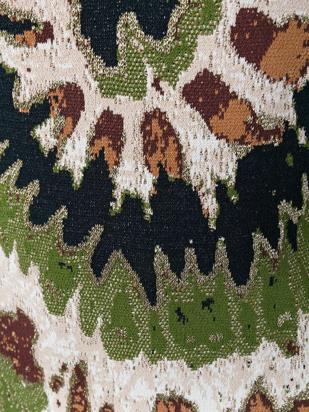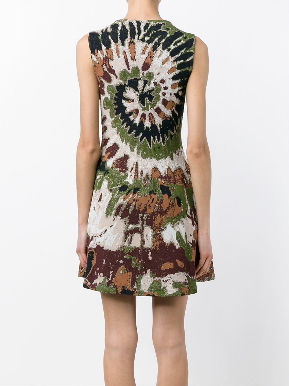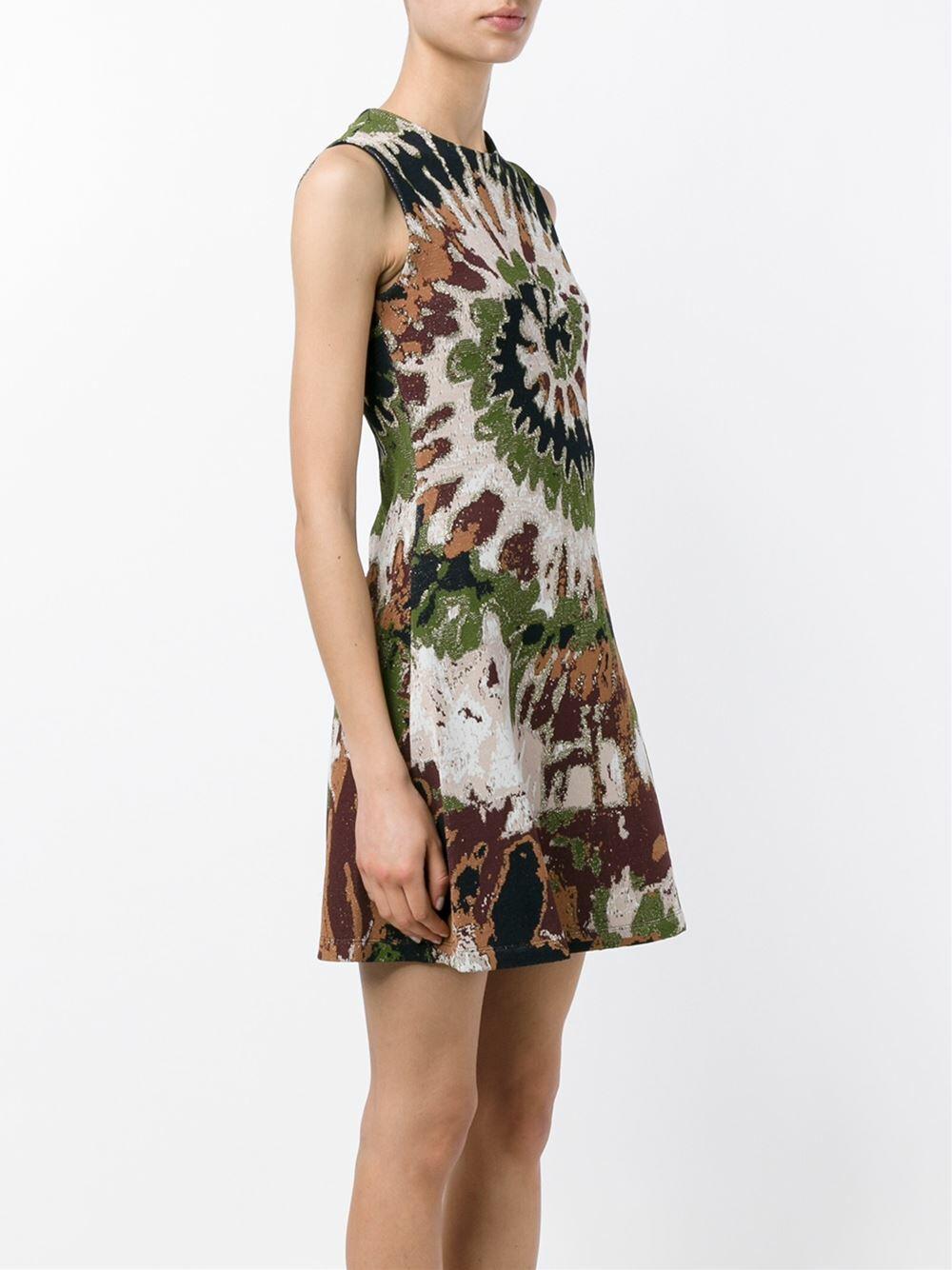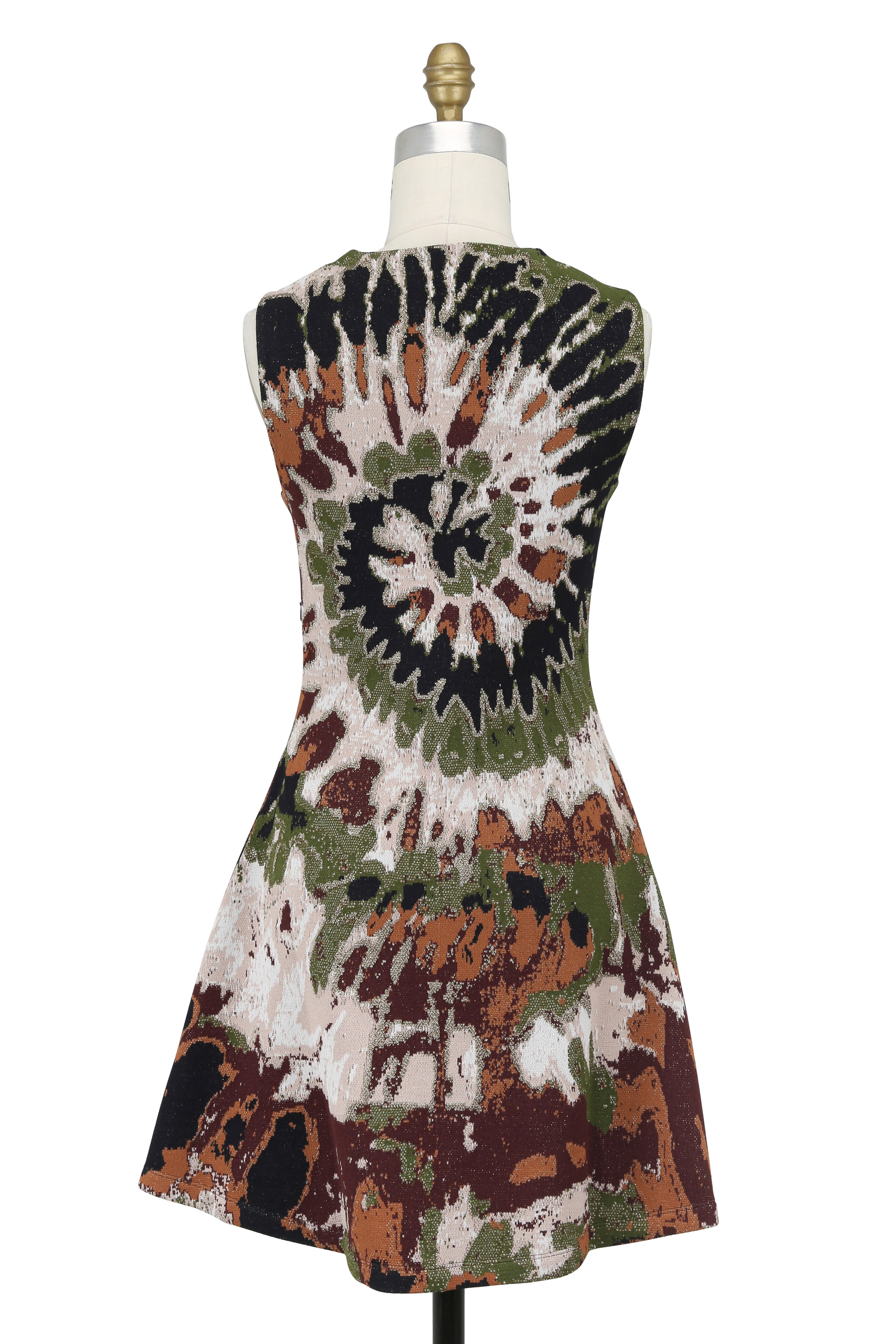 Jewel neckline. Concealed side zip closure. Flared skirt. Made in Italy. Fit and flare silhouette. 35" shoulder to hem. 82% viscose, 13% polyester, 5% lurex. Hand wash.