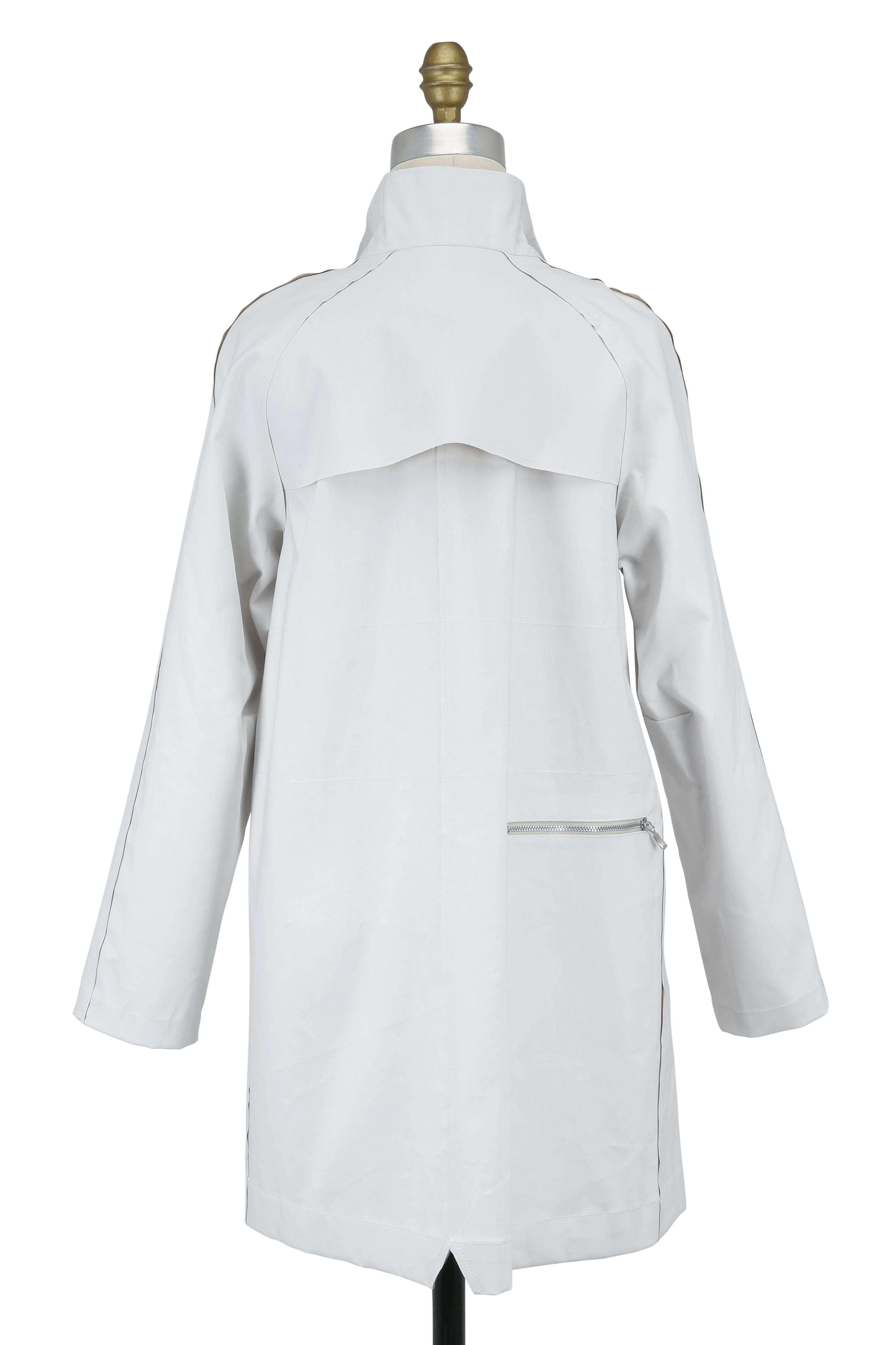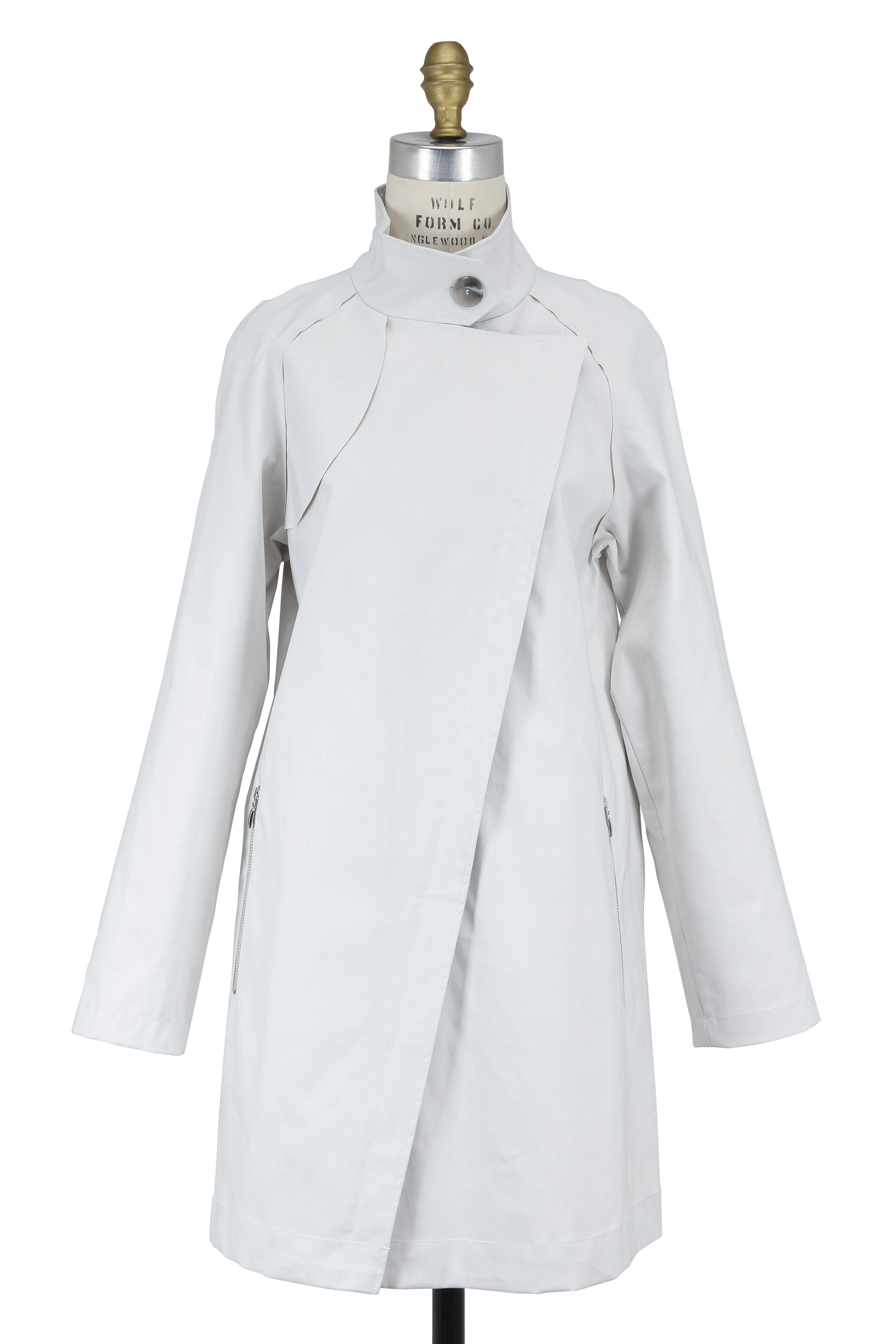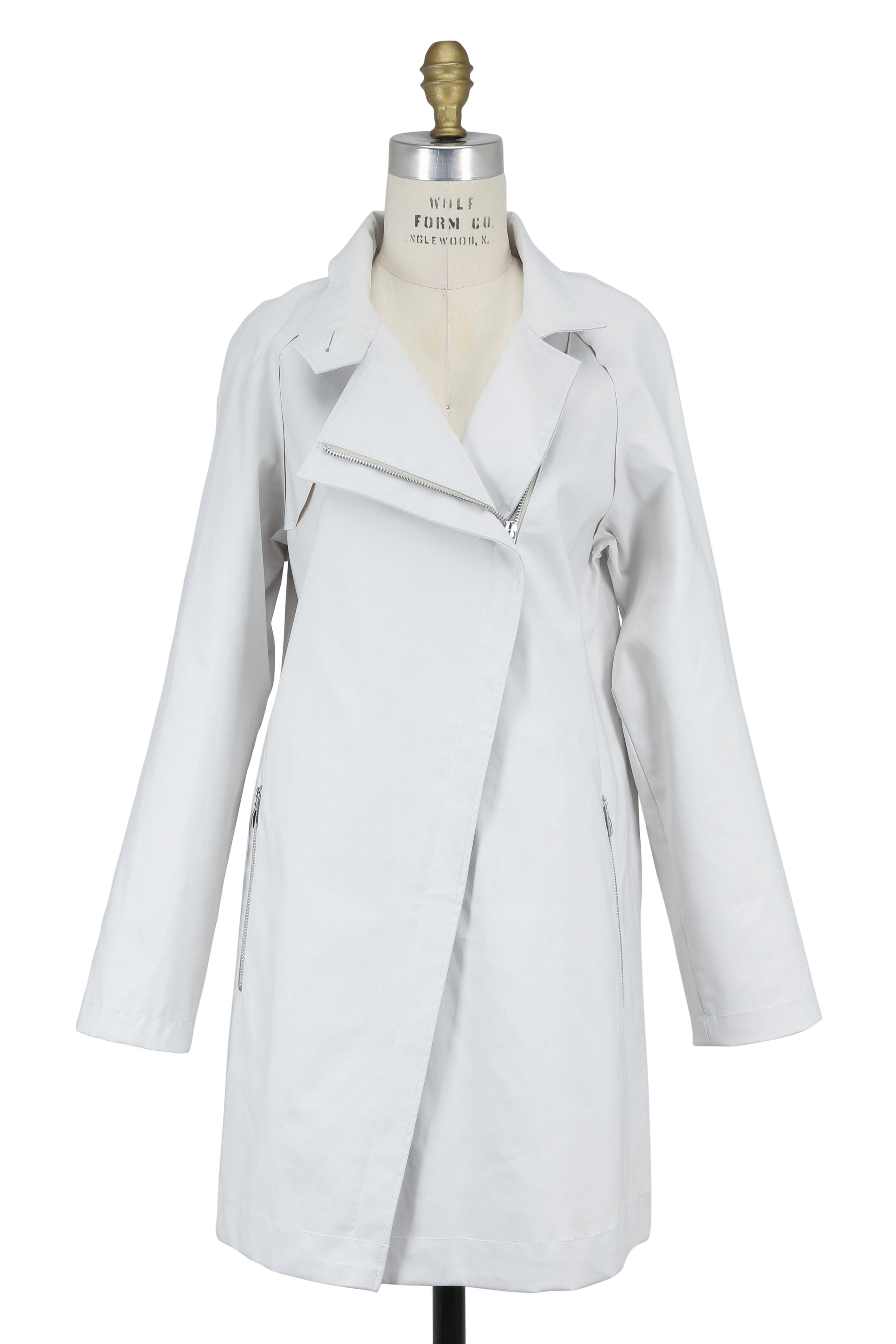 Stand collar. Asymmetric zip front closure. Storm flap. Raglan long sleeves. Front zipped slash pockets, zipped pocket at back. Imported of Italian fabric. 34" shoulder to hem. 87% cotton, 13% polyurethane; fully lined. Hand wash.