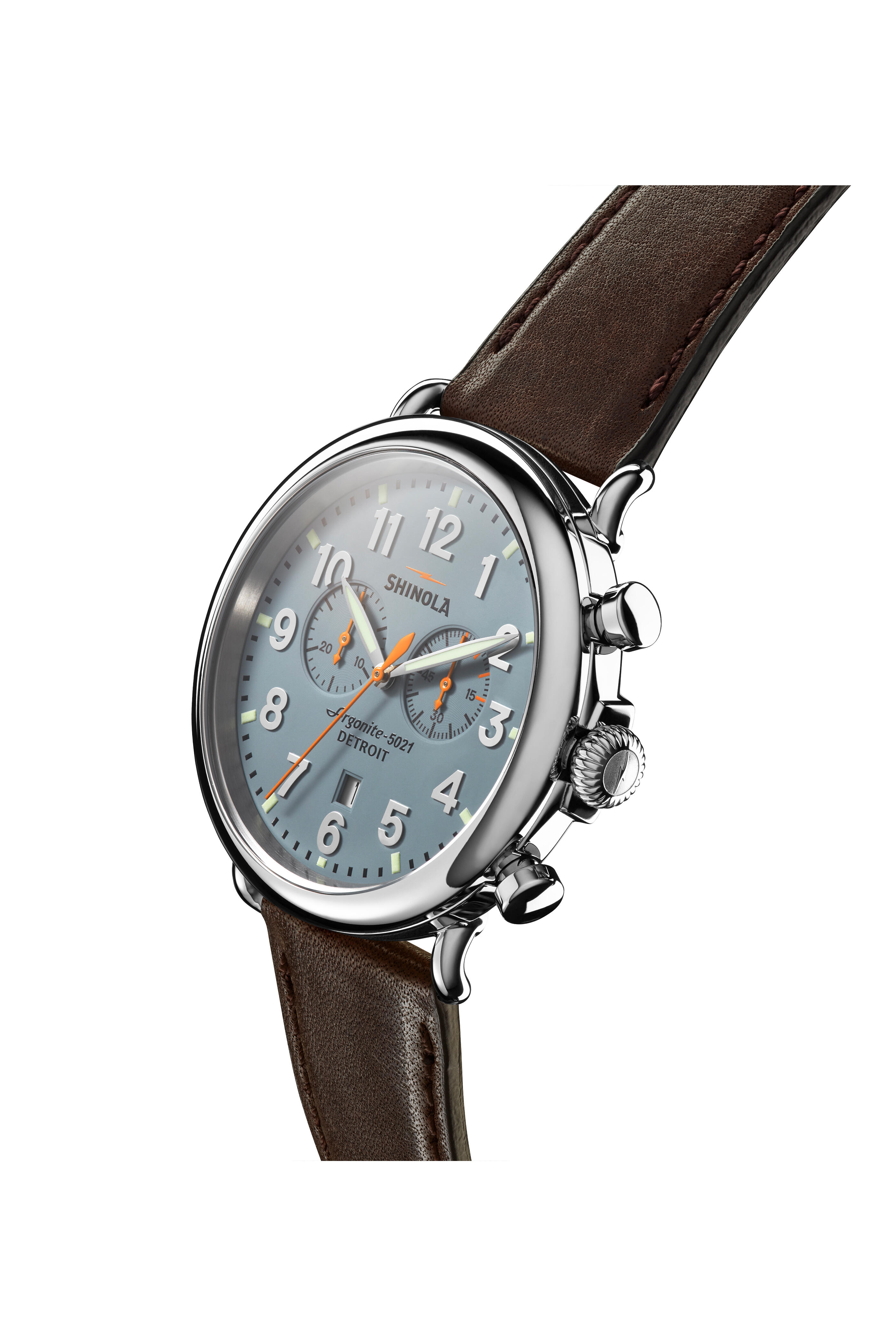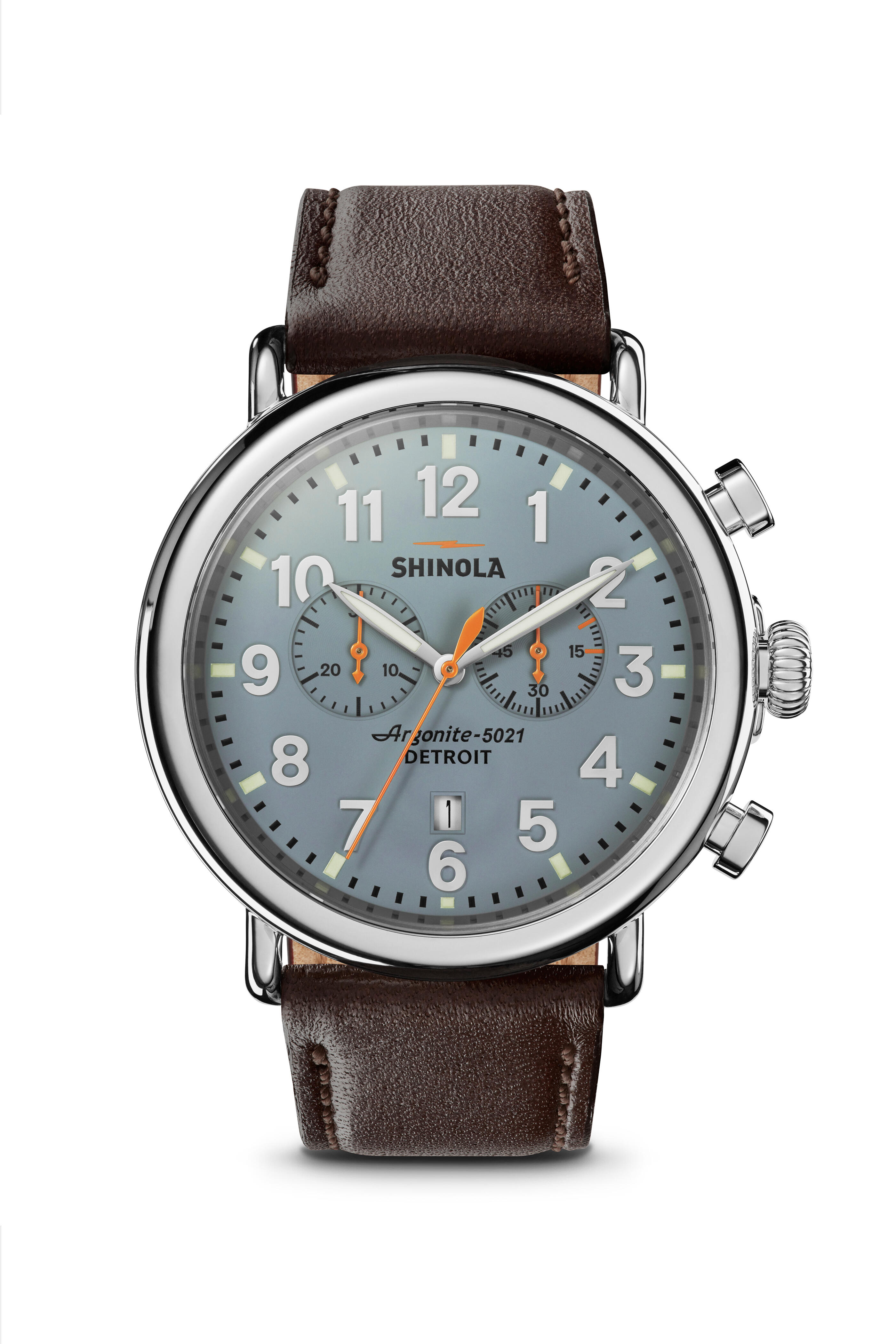 Movement: Swiss Argonite 5021. Case material: Polished stainless steel, double-domed sapphire crystal. Case diameter: 47 mm. Strap: dark brown leather strap. Dial: slate with super-luminova hands. Made in the USA.