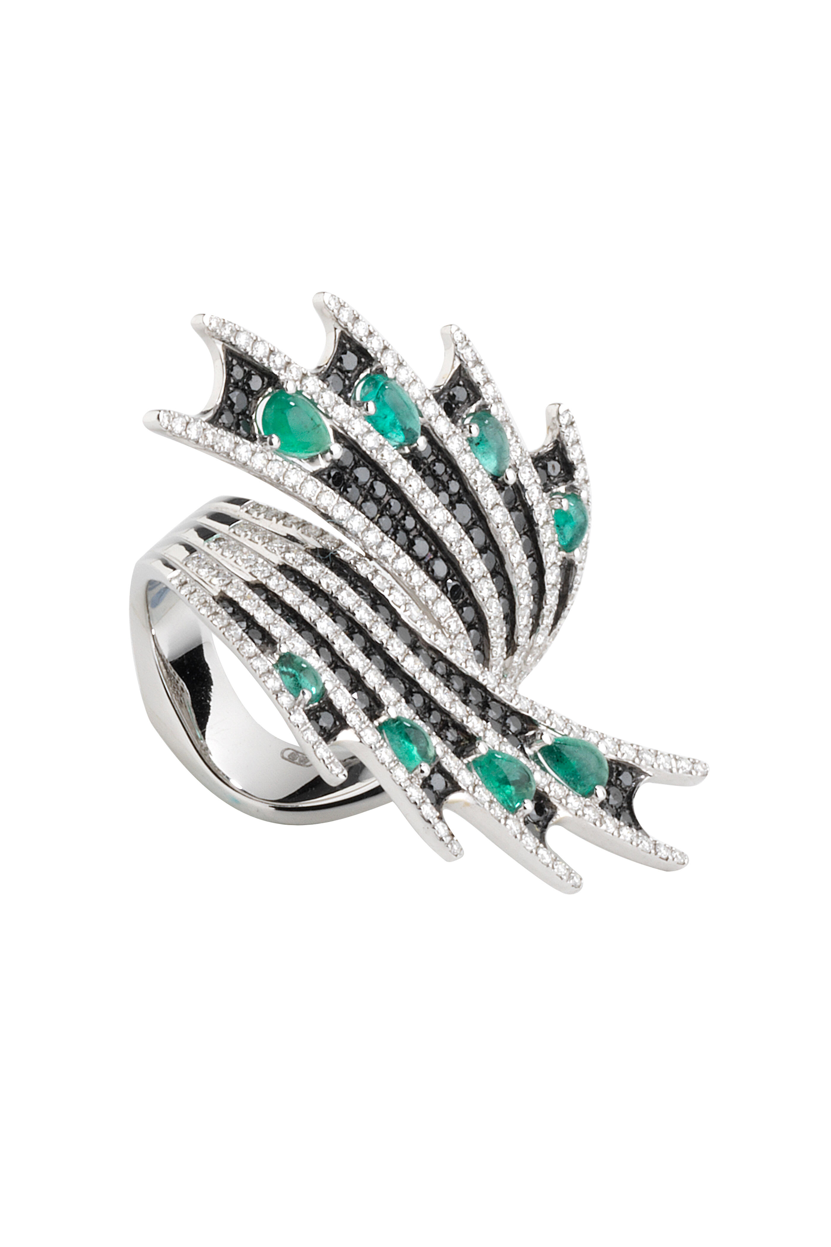 18K White Gold Diamond & Emerald Double Fin Ring
