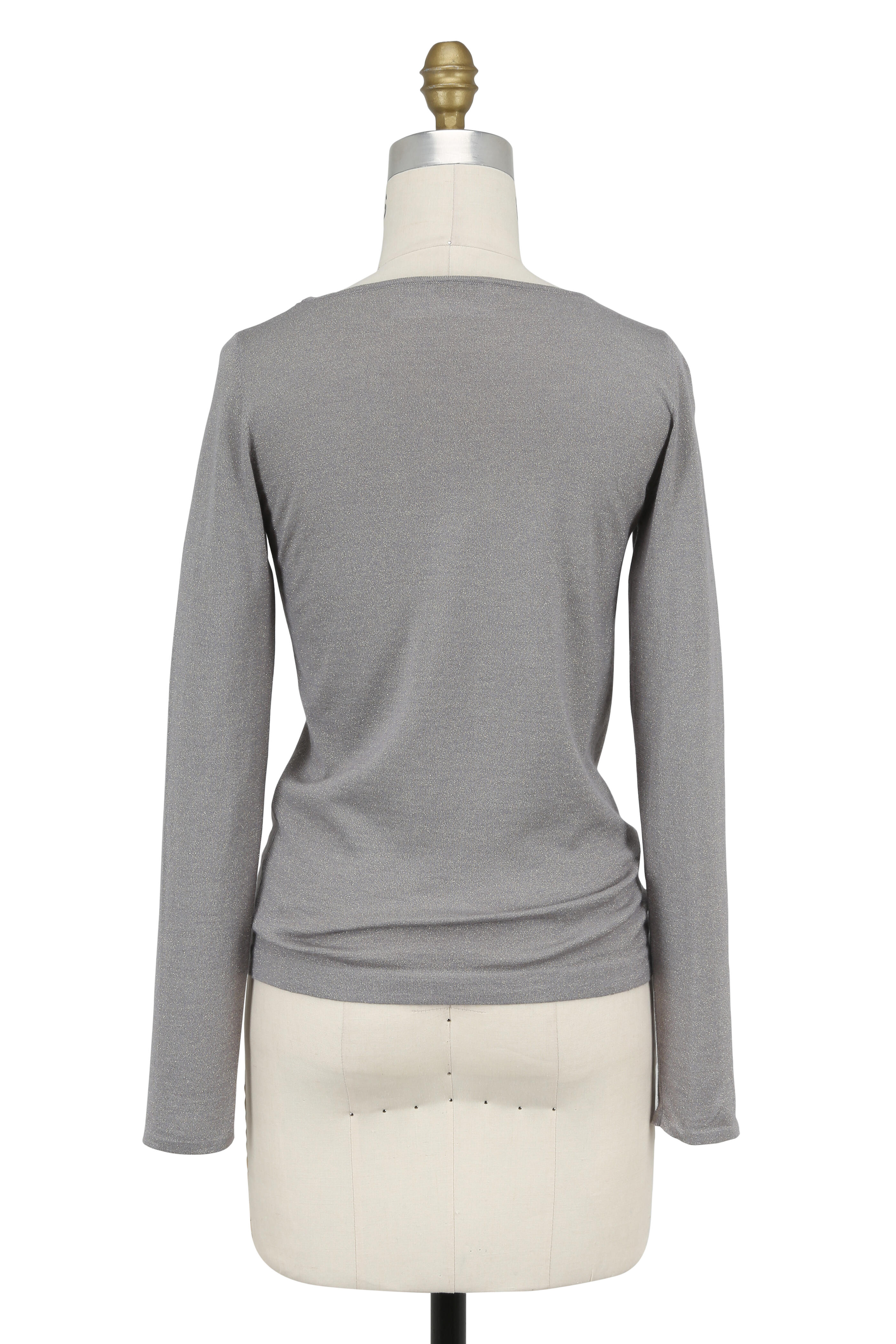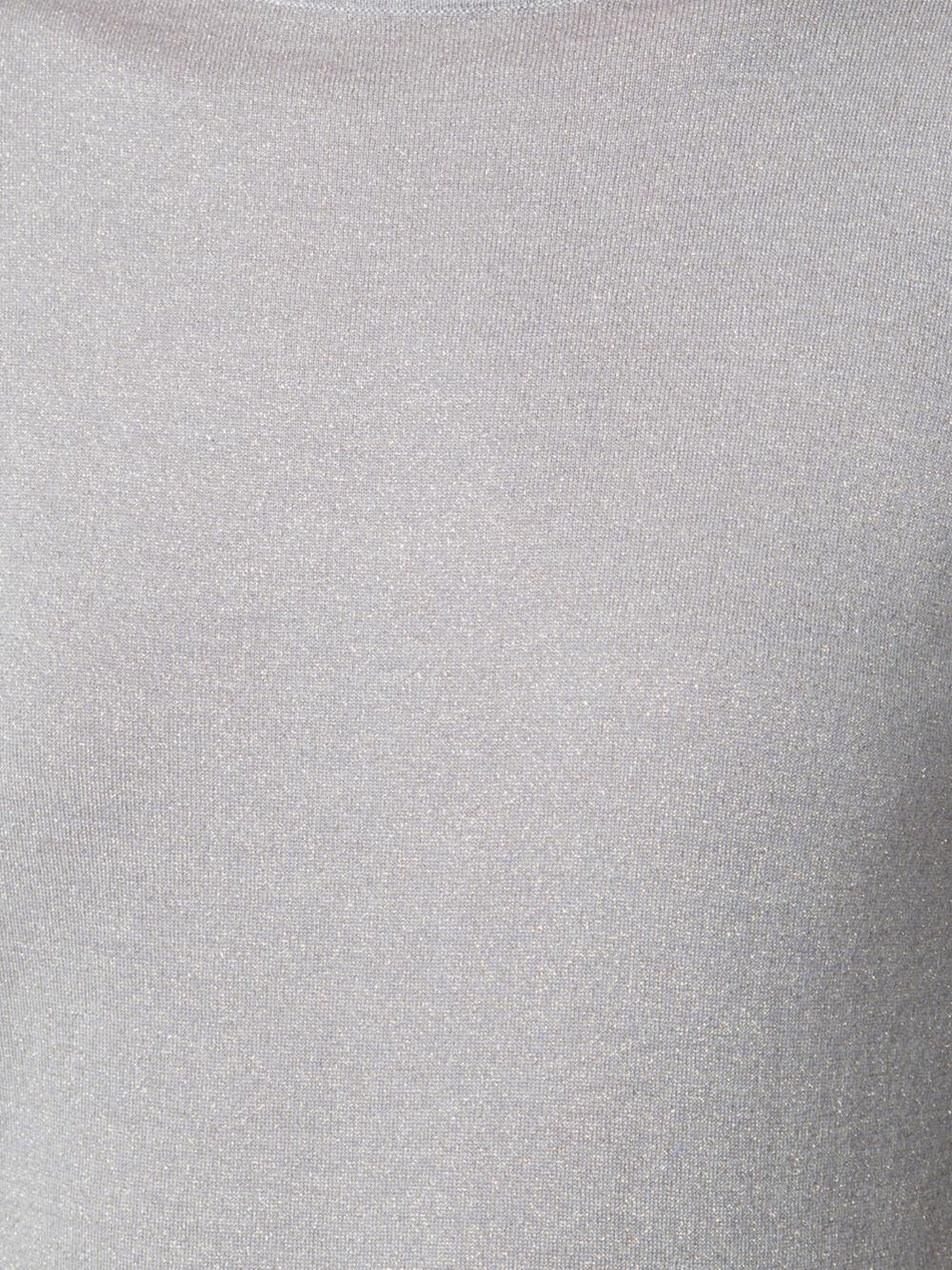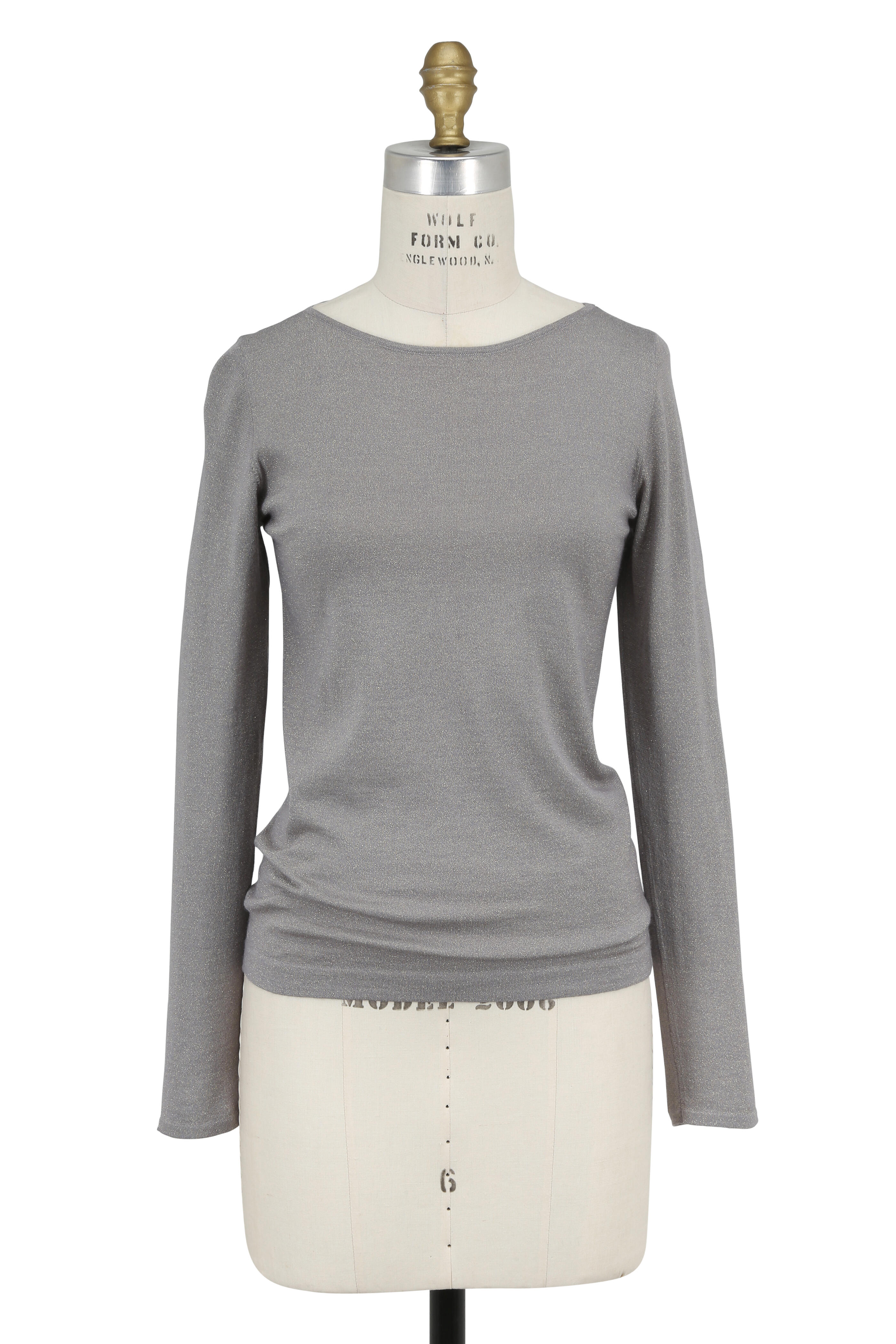 Bateau neckline. Made in Italy. 51% cashmere, 22% silk, 20% polyamide, 7% metallic fibers. Hand wash.