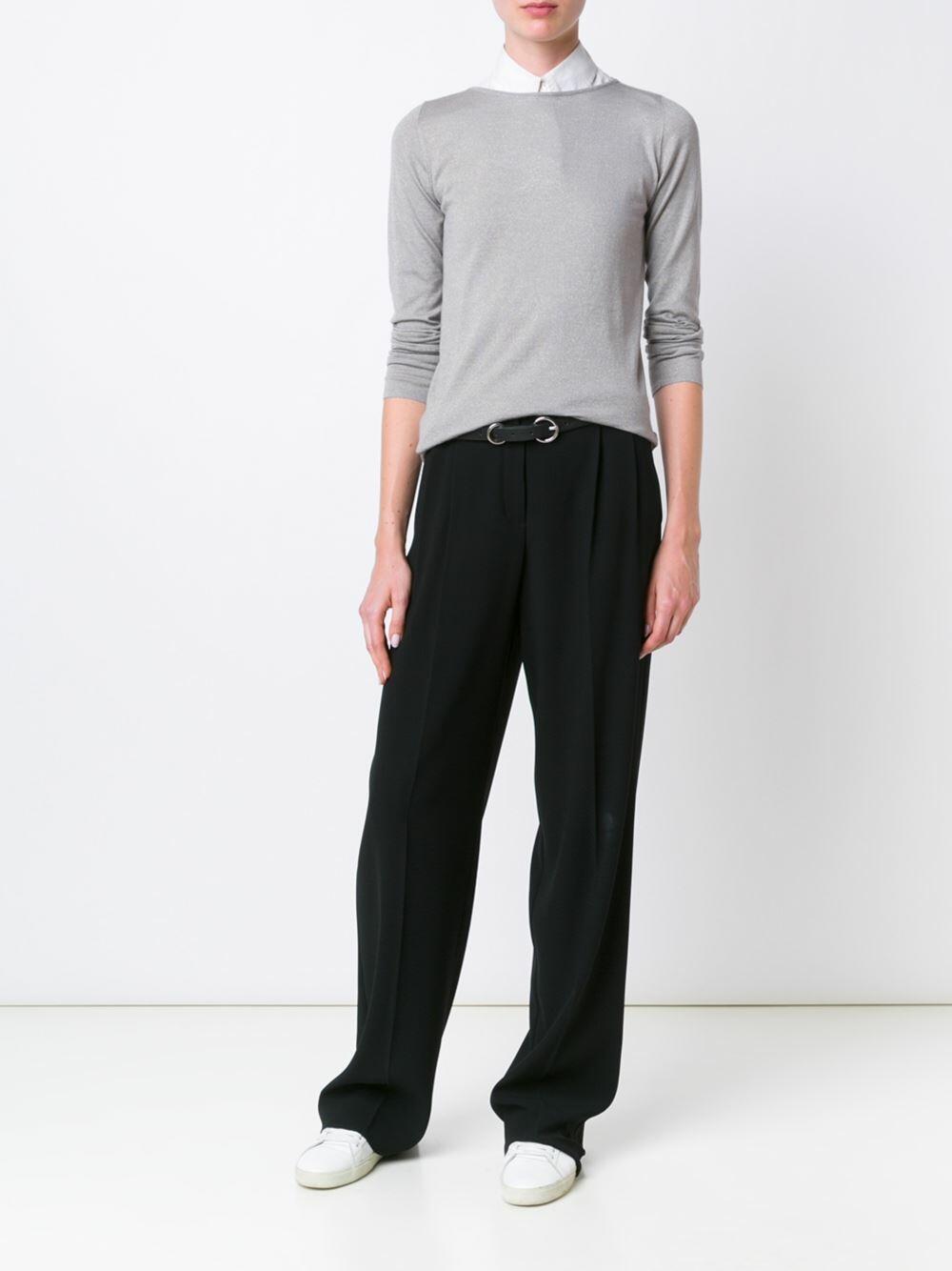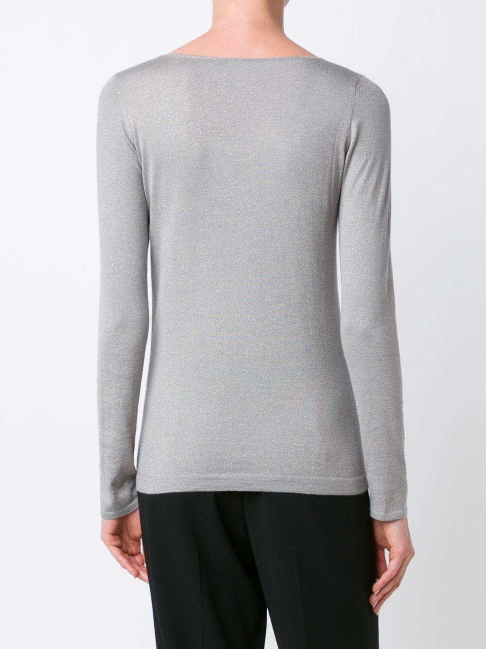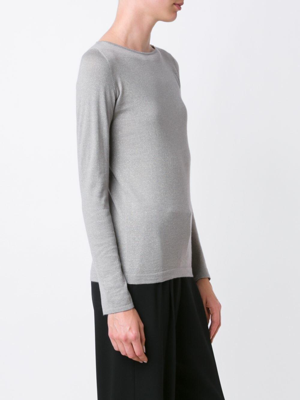 Bateau neckline. Made in Italy. 51% cashmere, 22% silk, 20% polyamide, 7% metallic fibers. Hand wash.