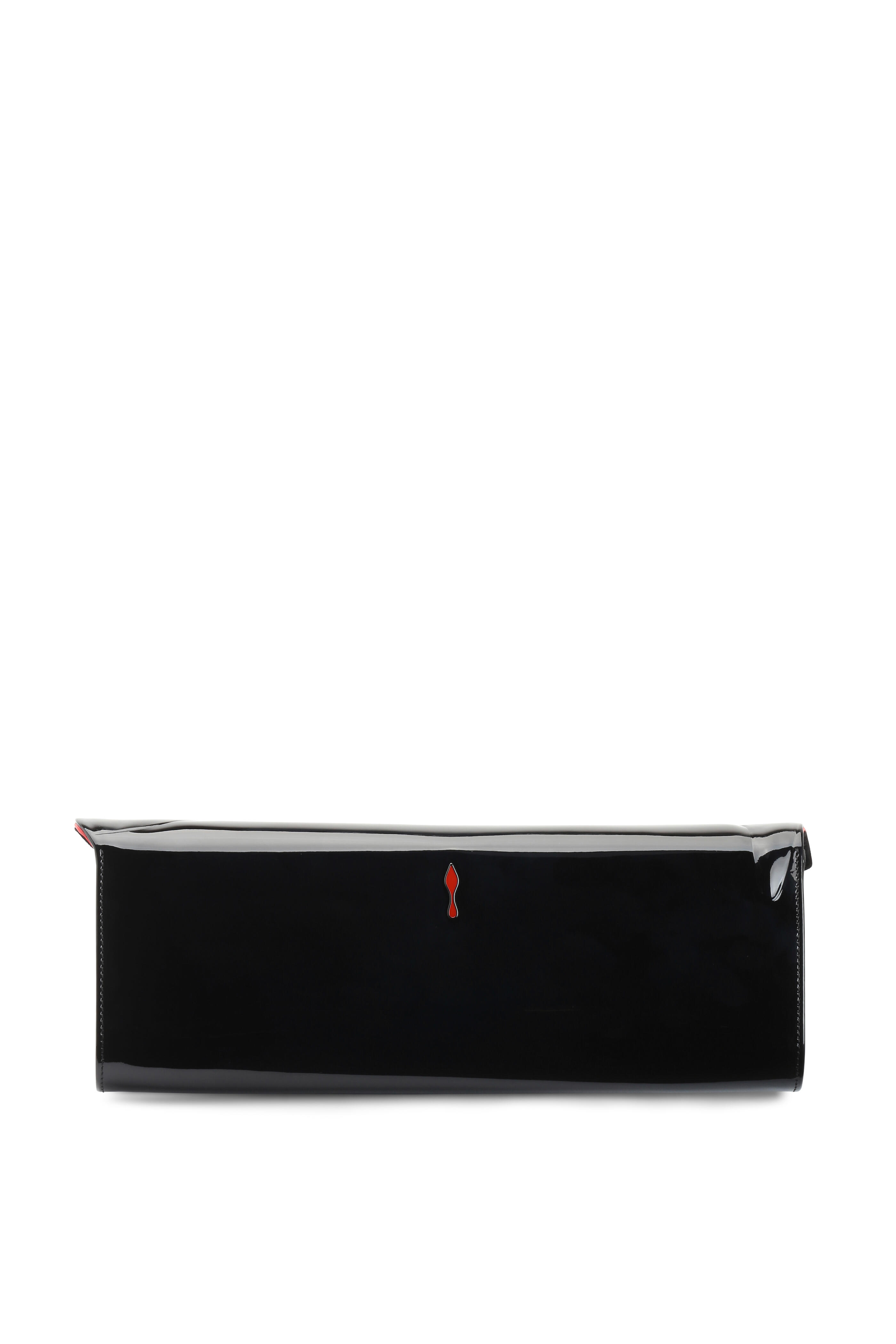 Patent leather. Flap front with concealed magnetic closure. Interior slip pocket. Red suede lining. Made in Italy. Width: 12". Height: 4 ½". Depth: 2".
