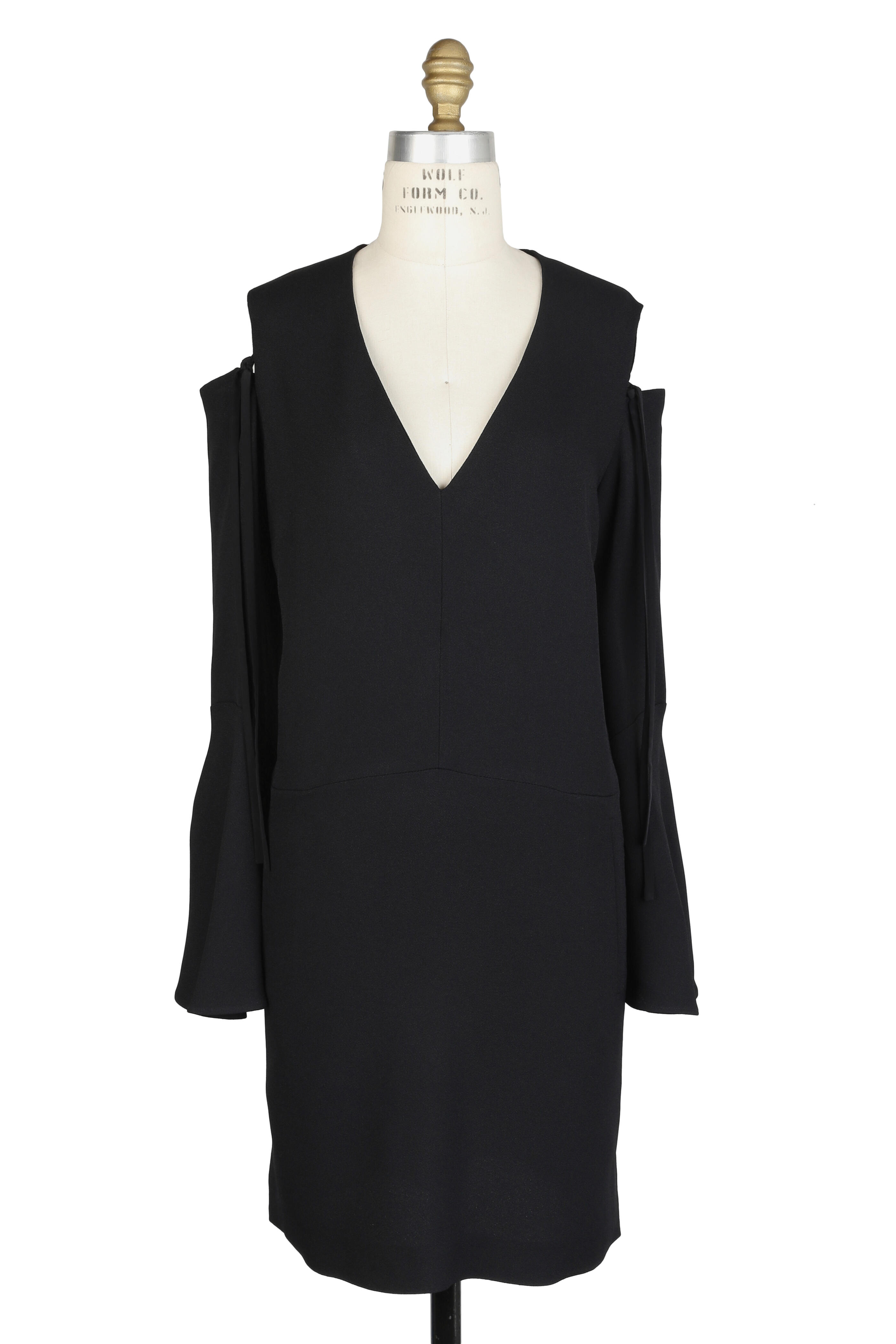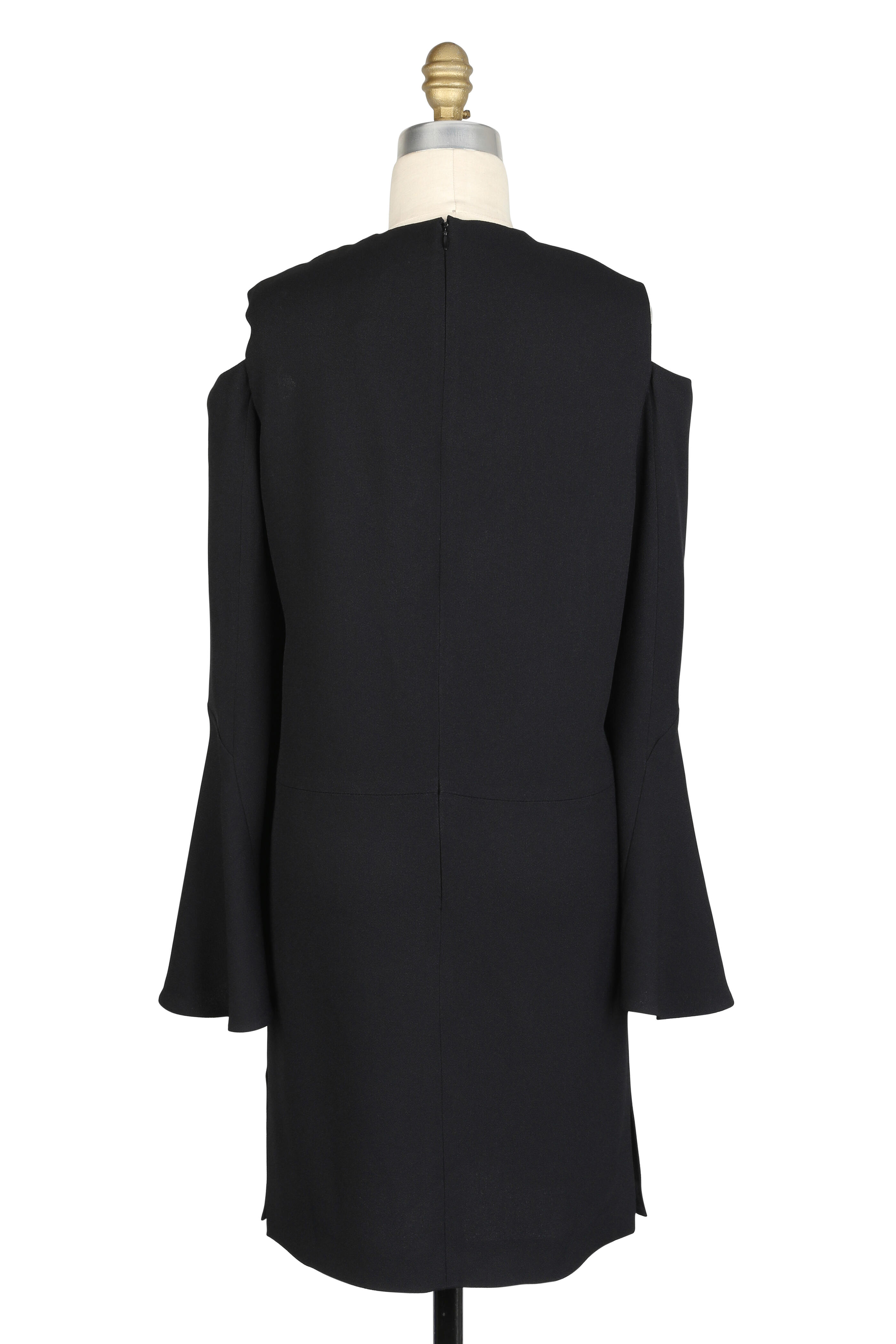 V-neckline. Concealed back zip closure. Long bell sleeves. Side slip pockets. Cut-outs at shoulder. Split hem. Imported. 36" shoulder to hem (size 6). 53% acetate, 47% viscose; lining: 100% silk. Dry clean.