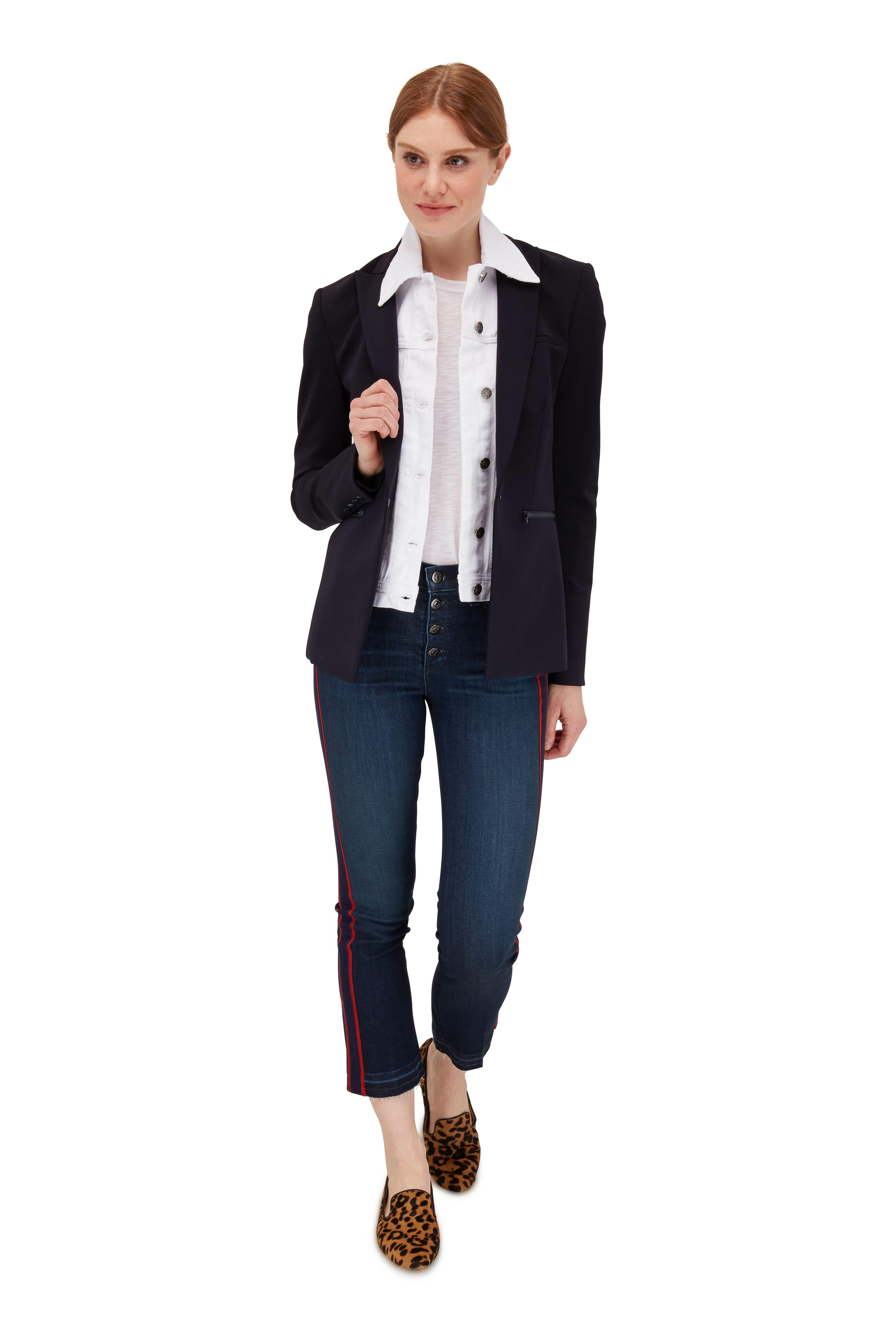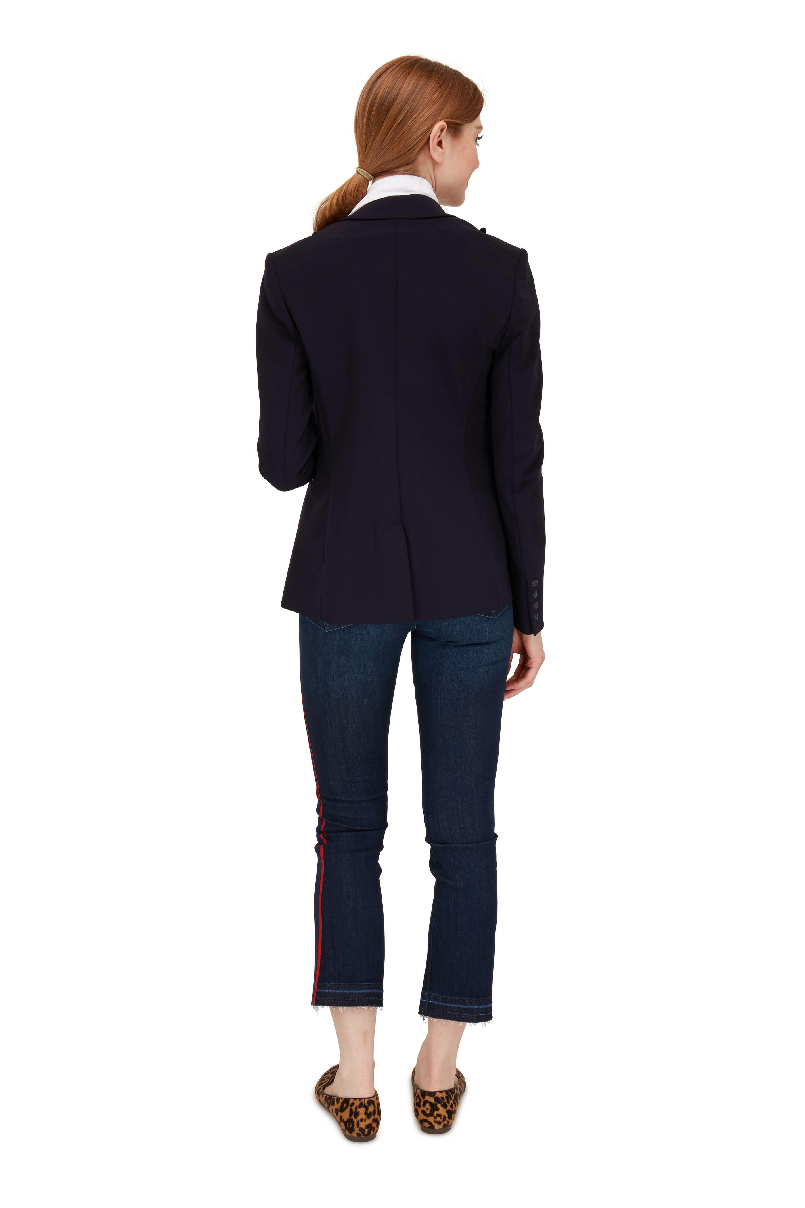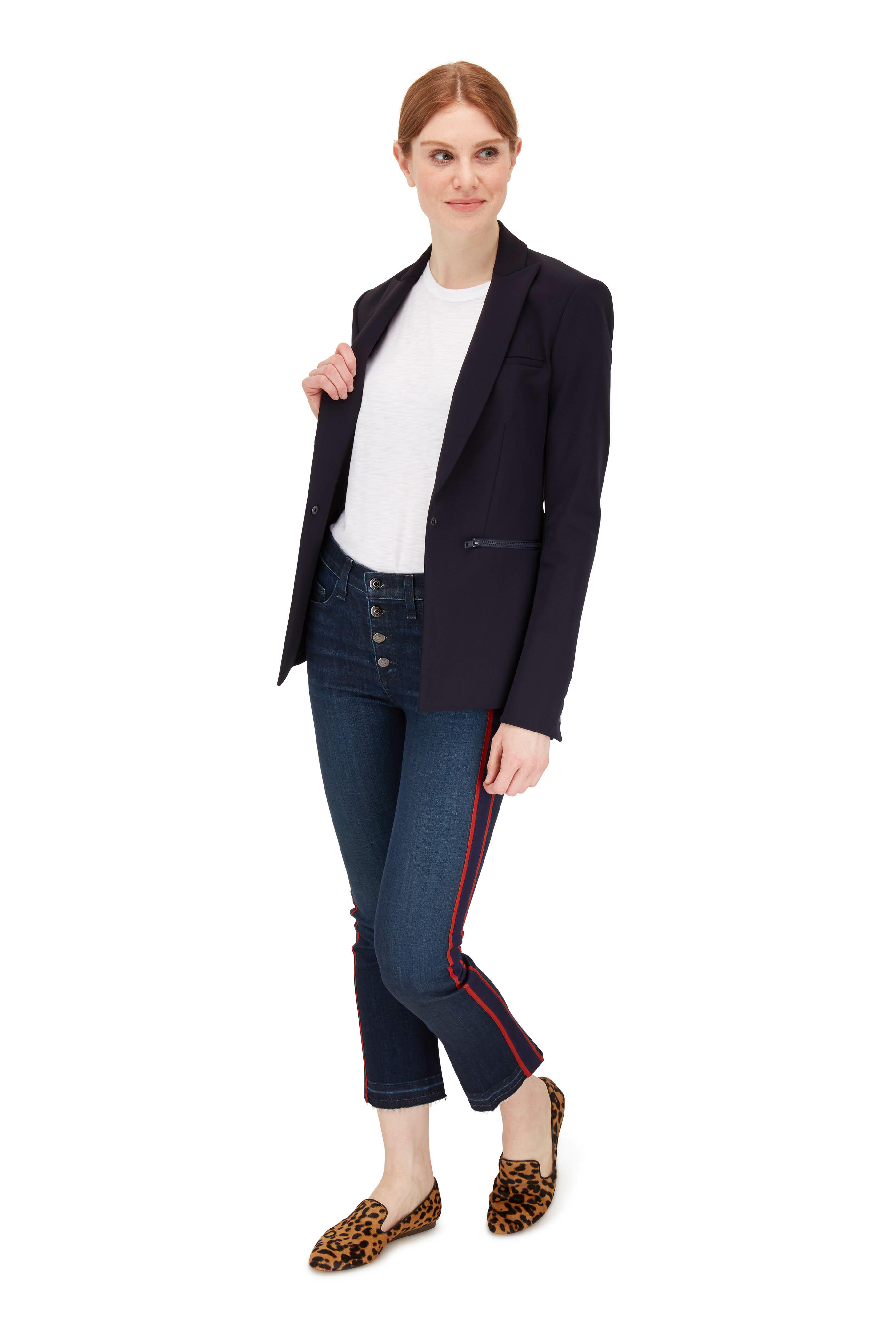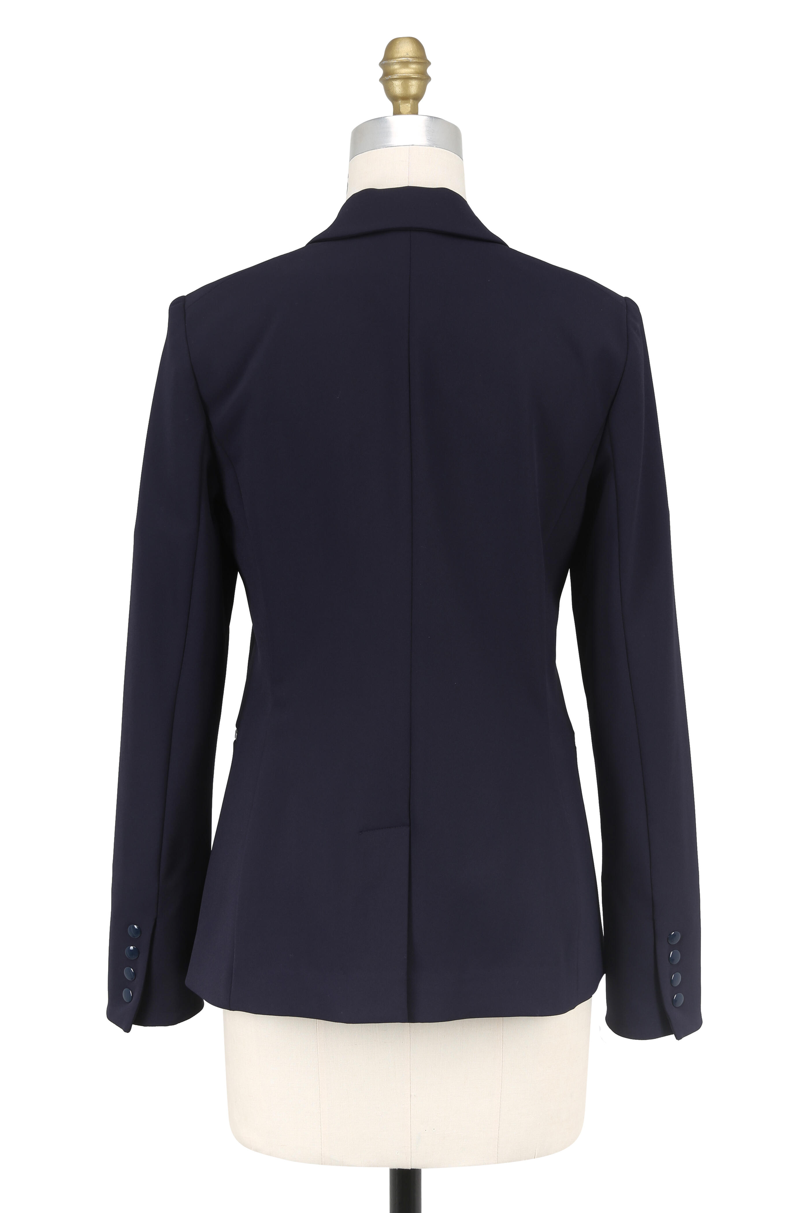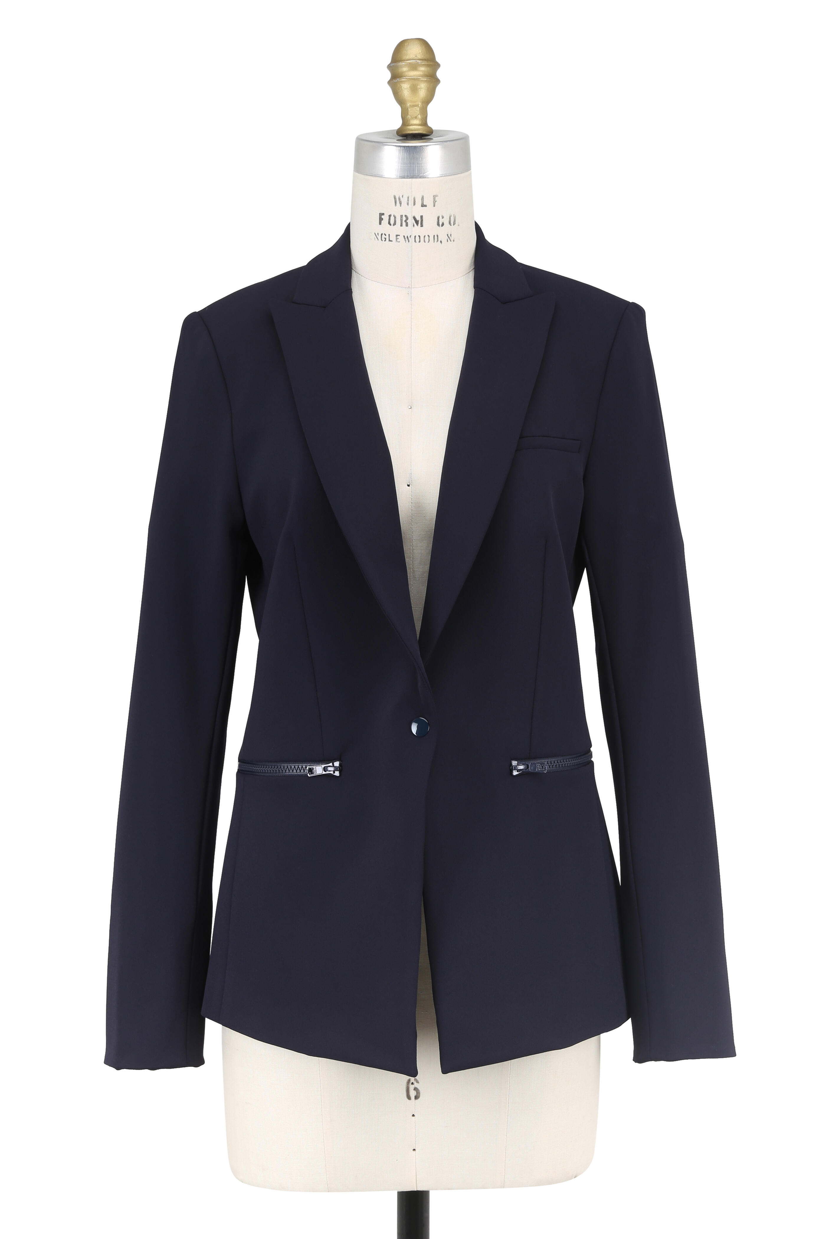 Peak lapels. Single button-snap closure. Button-snap cuffs. Chest pocket, lower front zip pockets. Back vent. Made in the USA. Pair it with any of our Dickey options. 86% polyester, 14% elastane; partially lined. Dry clean.