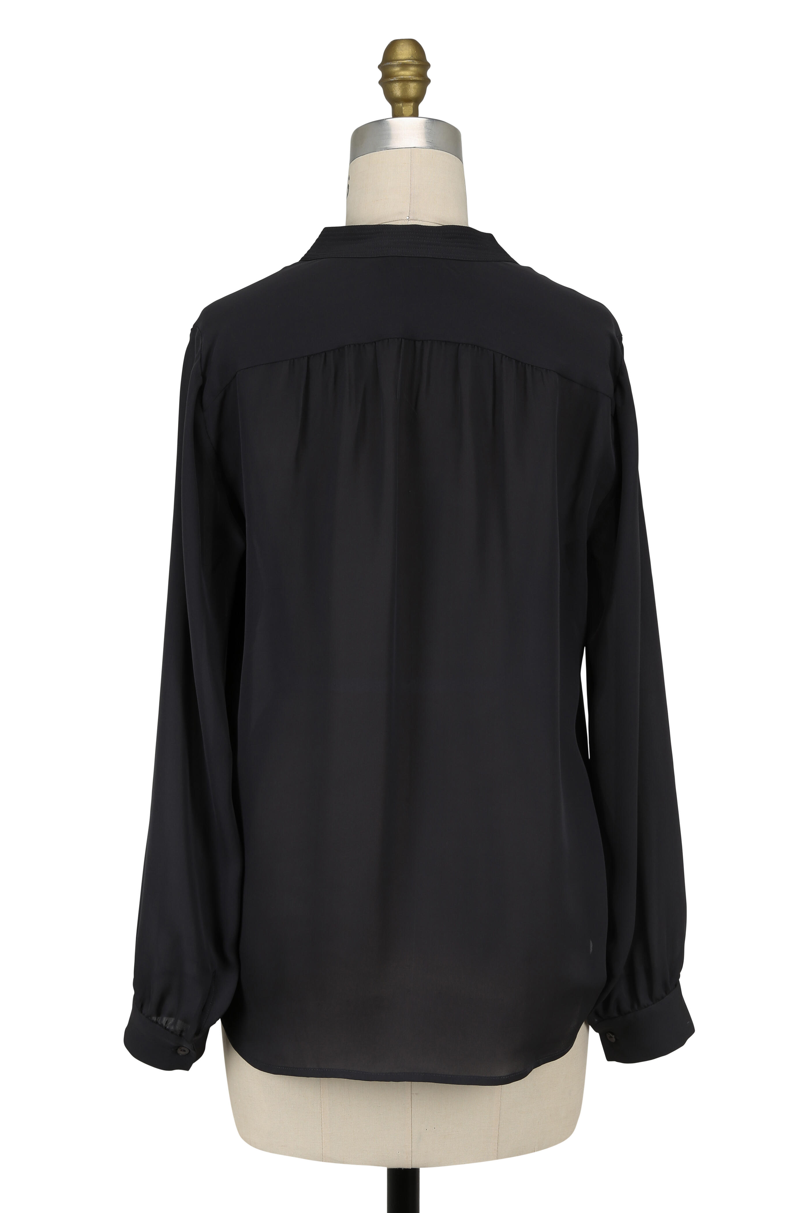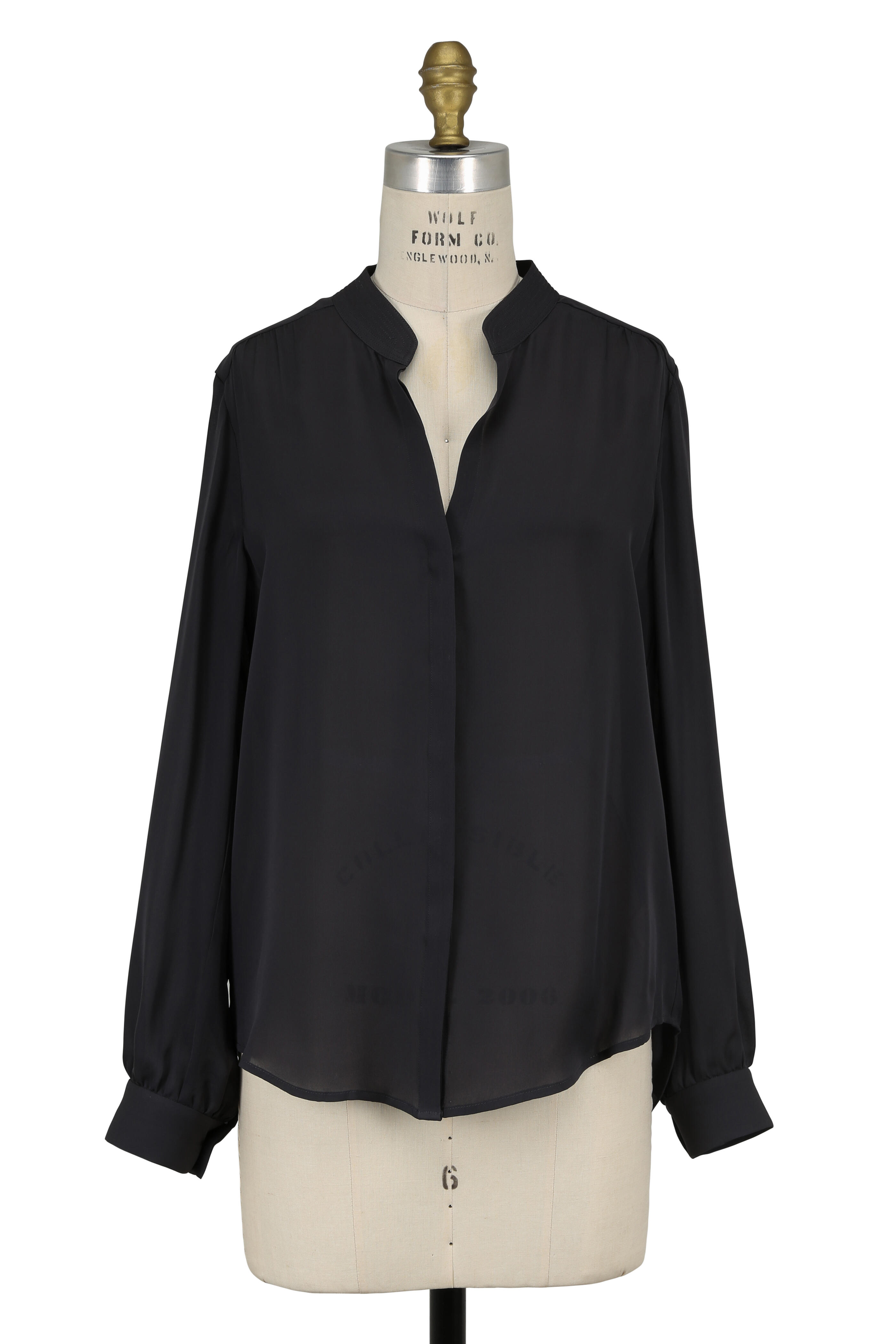 Banded neckline. Concealed button front placket. Single button cuffs. Pleating detail at shoulders. Imported. 100% silk. Dry clean.
