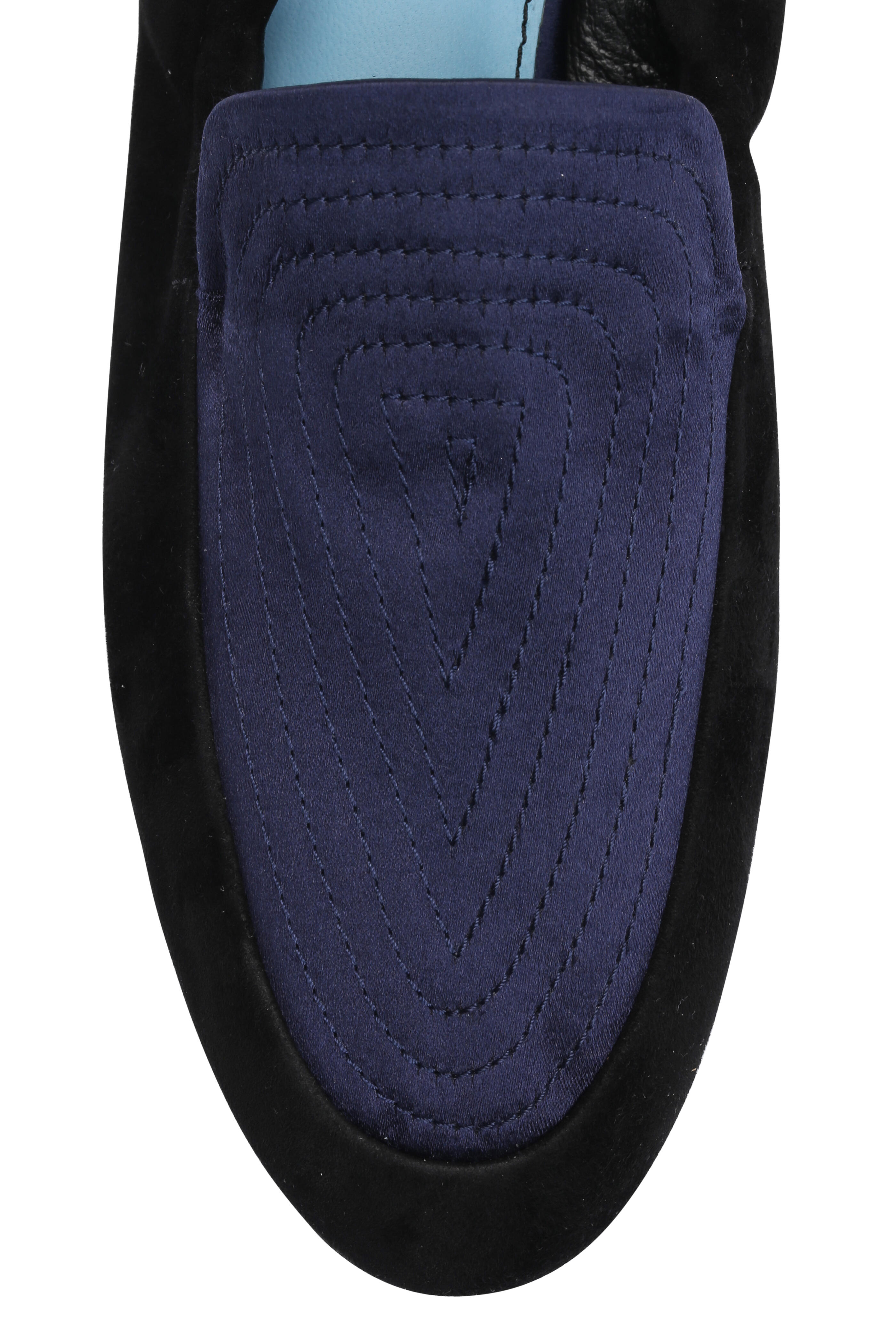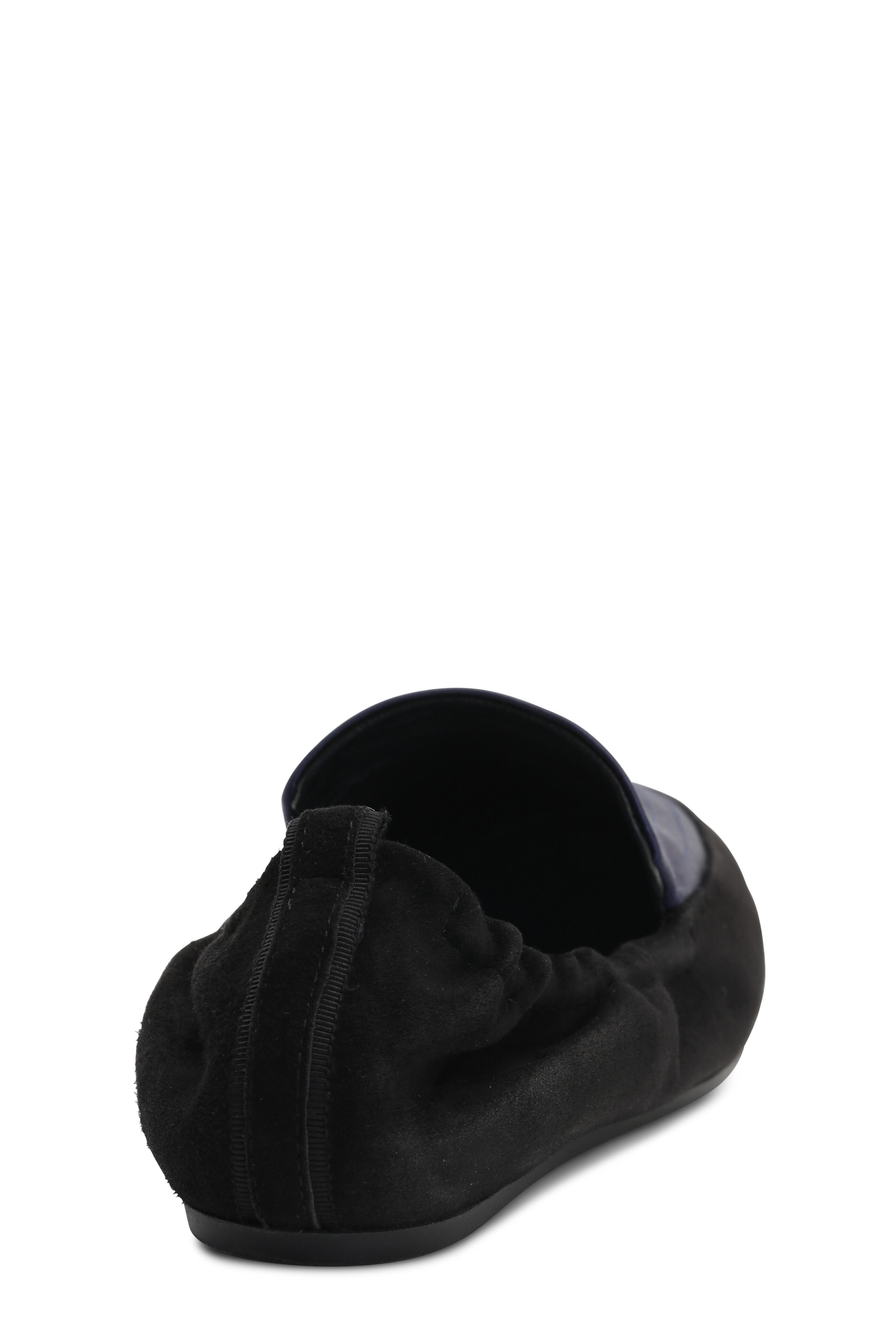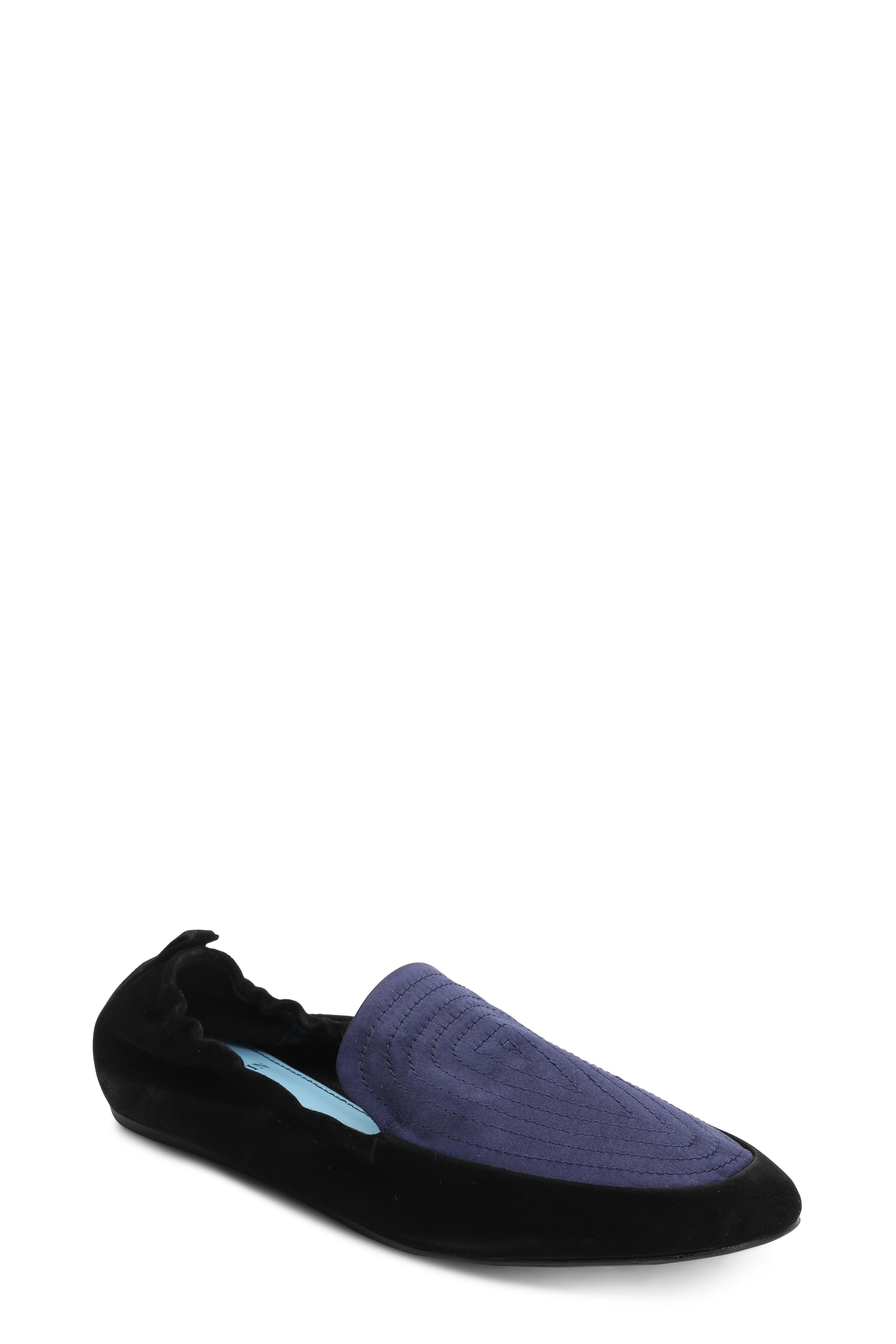 Calfskin suede upper. Apron toe. Notched vamp. Elasticized collar. Leather lining; cushioned insole. Leather sole. Made in Italy.