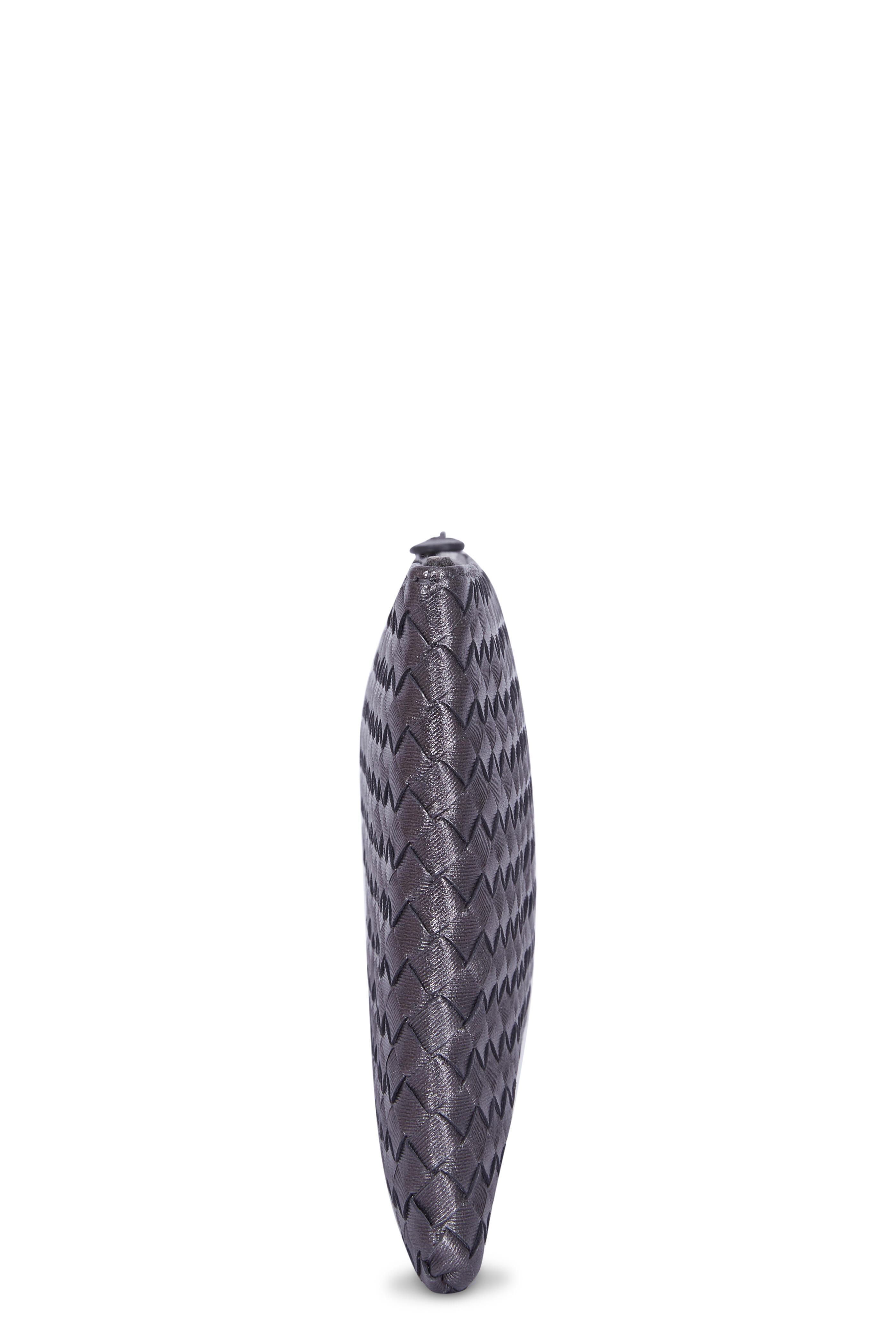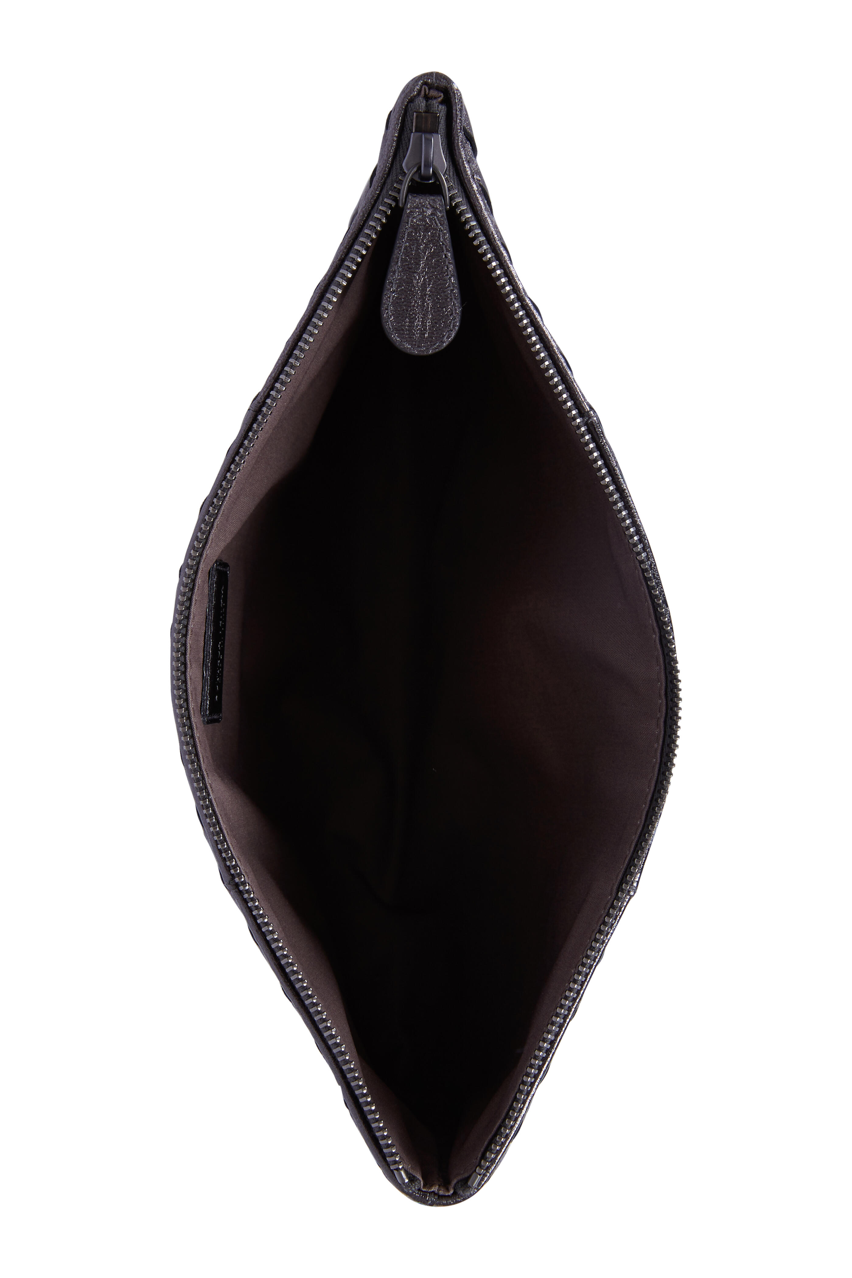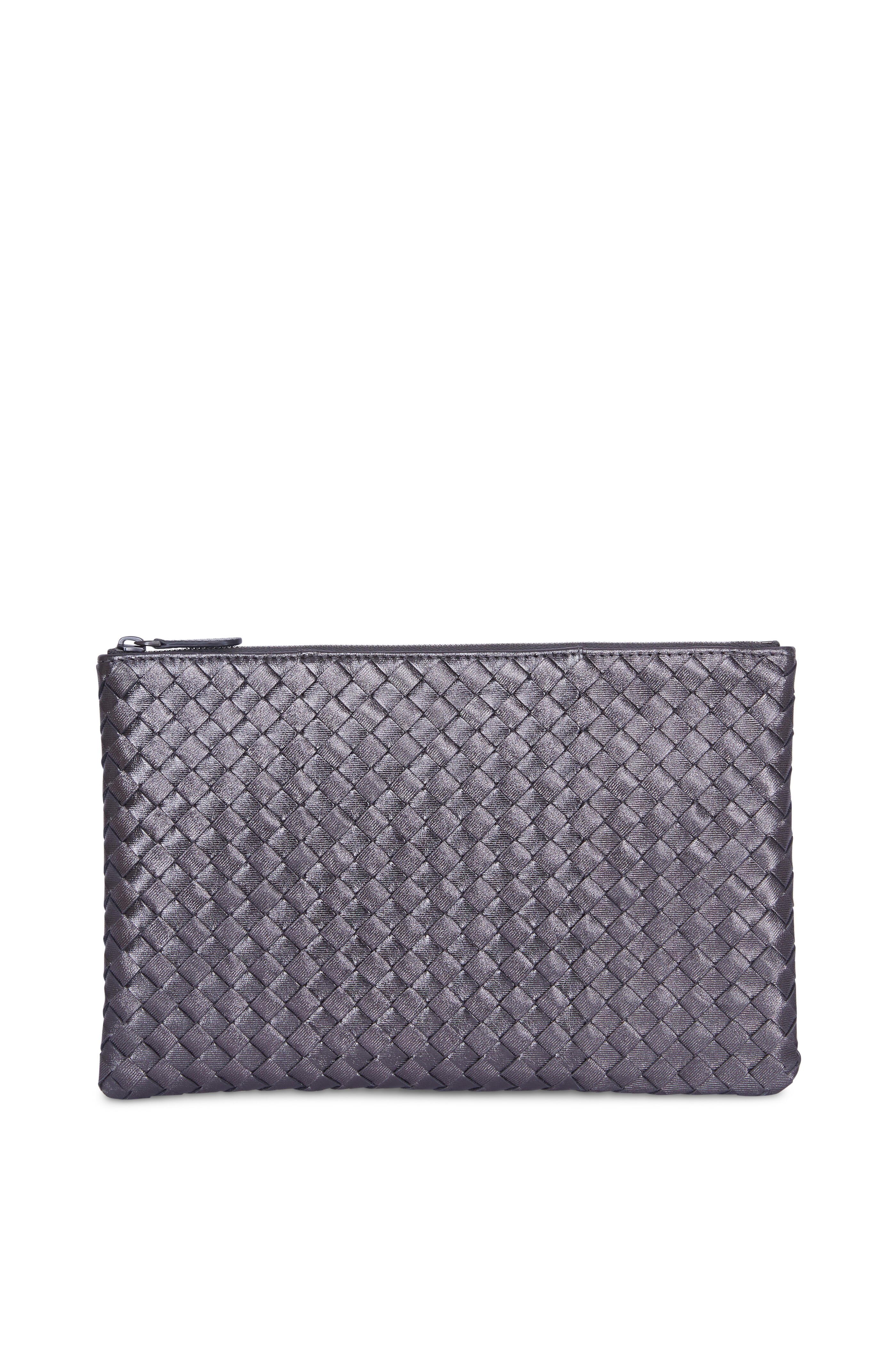 Woven calfskin leather. Top zip closure. Fully lined. Made in Italy. Width: 10". Height: 6 ½". Depth: ½".