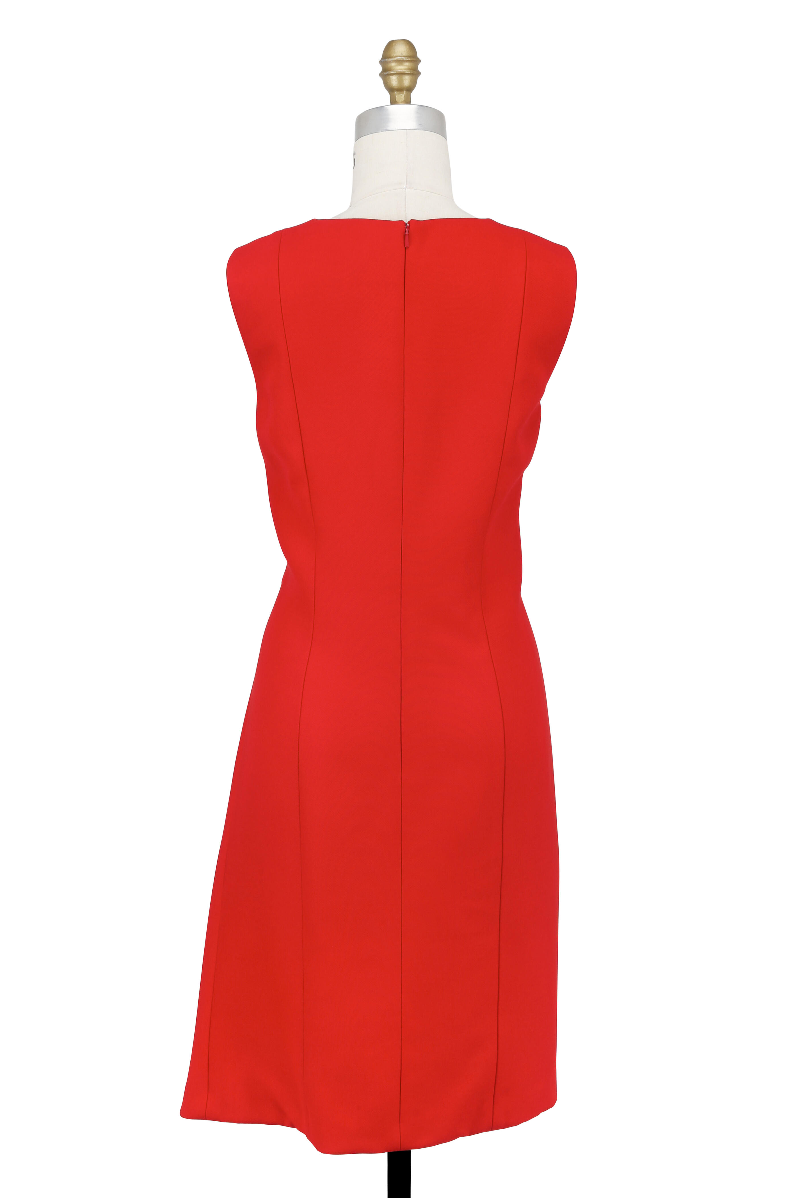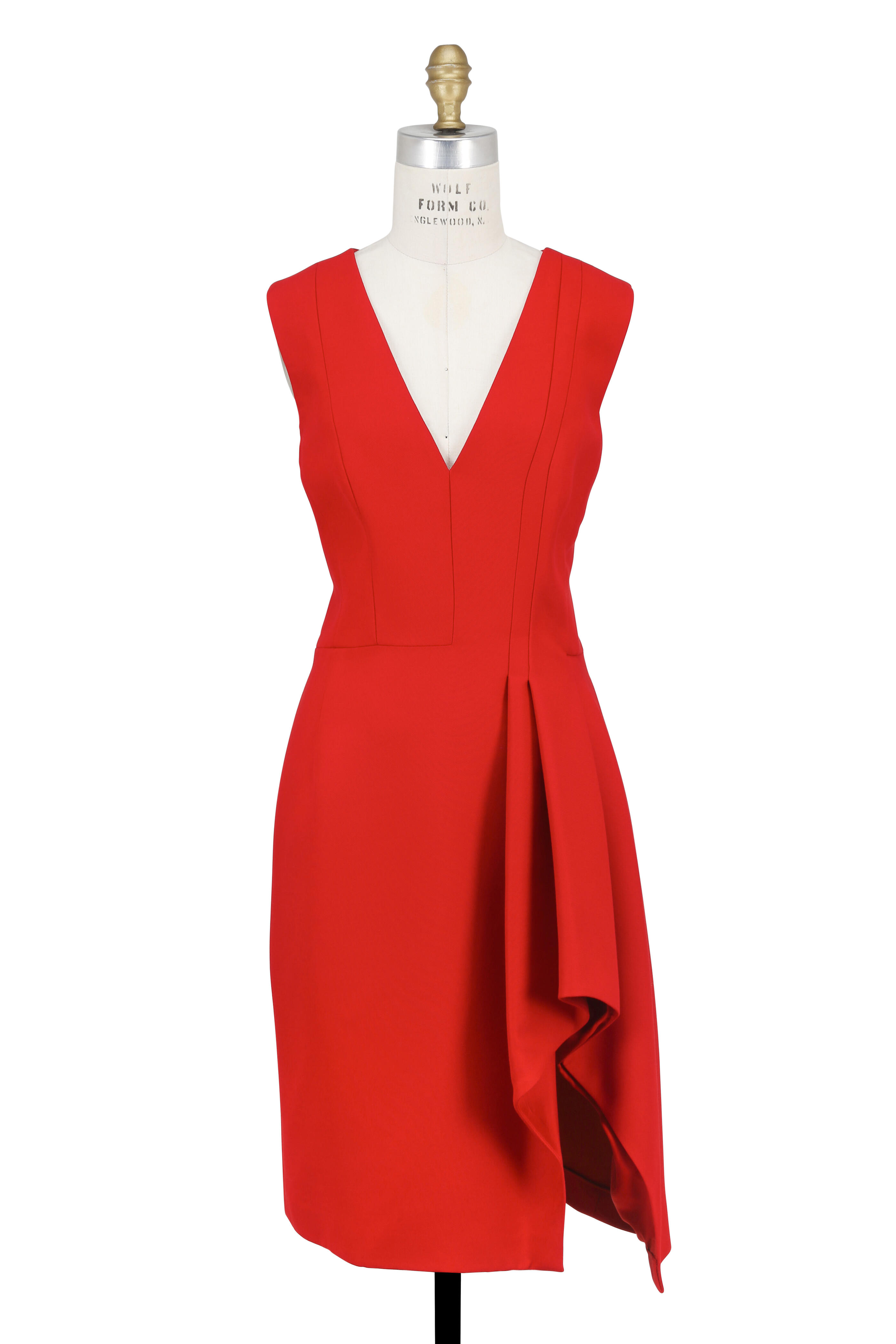 Deep V-neckline. Concealed back zip closure. Shaping seams. Draped high slit front. Made in the USA. 39" shoulder to hem. 100% viscose; lining: 100% silk. Dry clean.