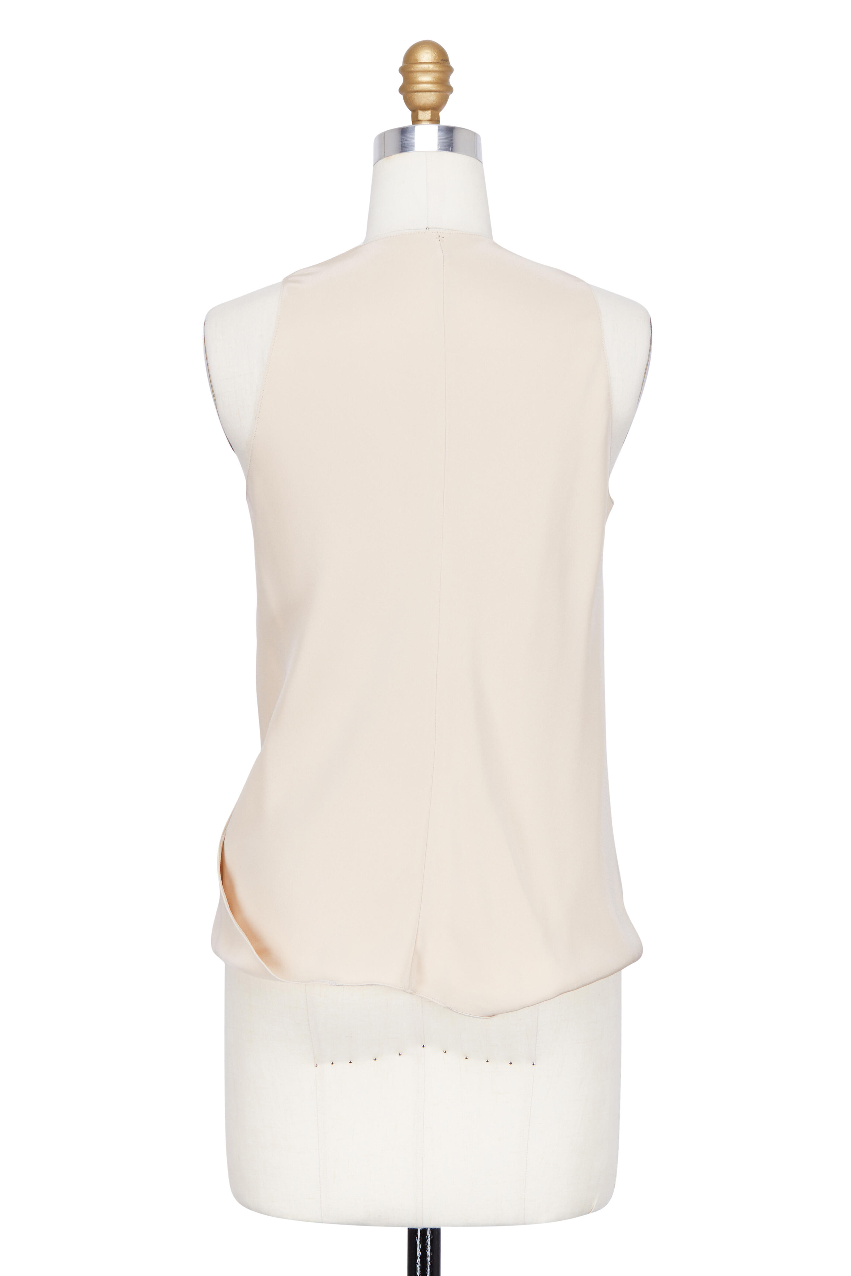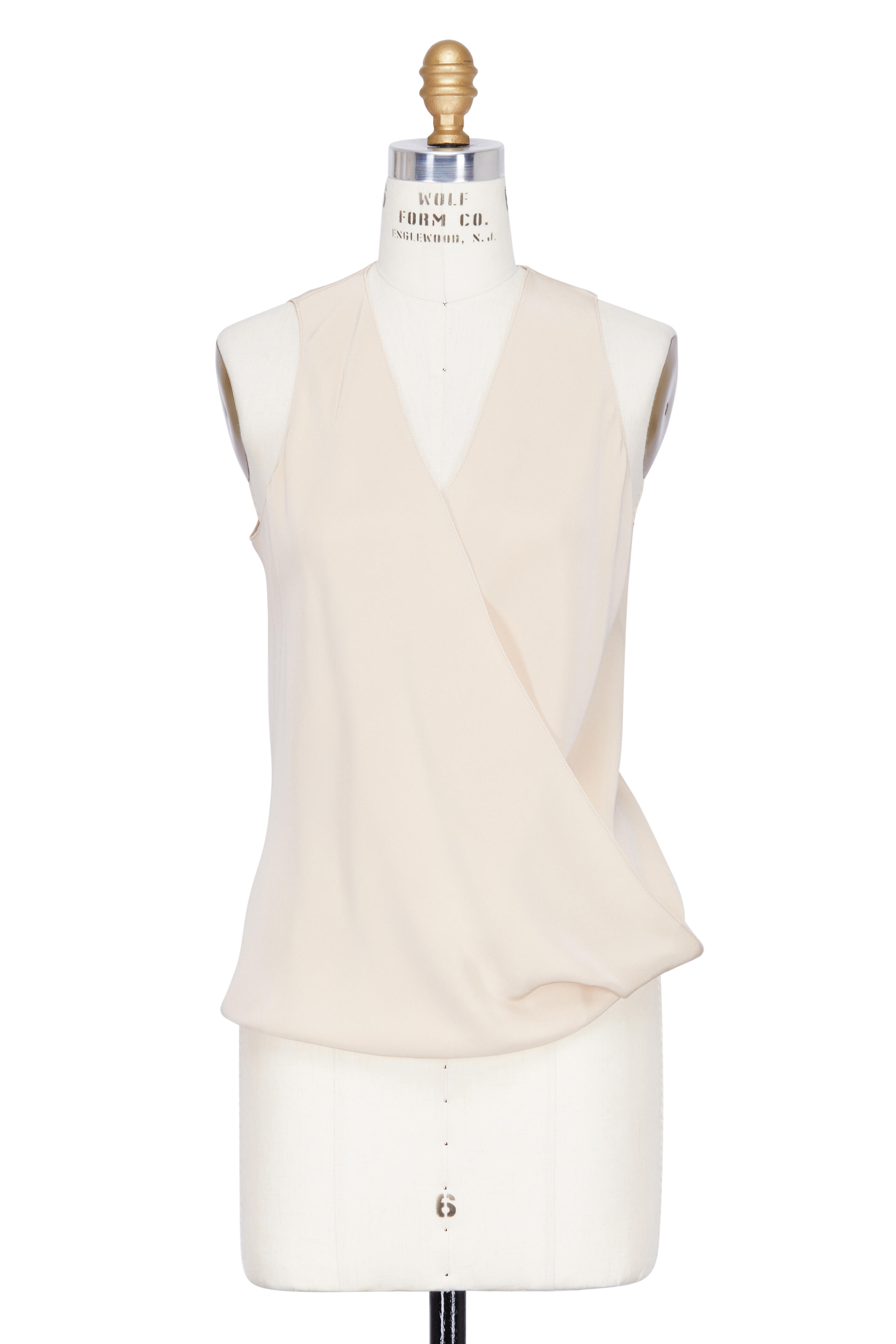 Surplice neckline. Drape front. Made in the USA. 100% silk. Dry clean.