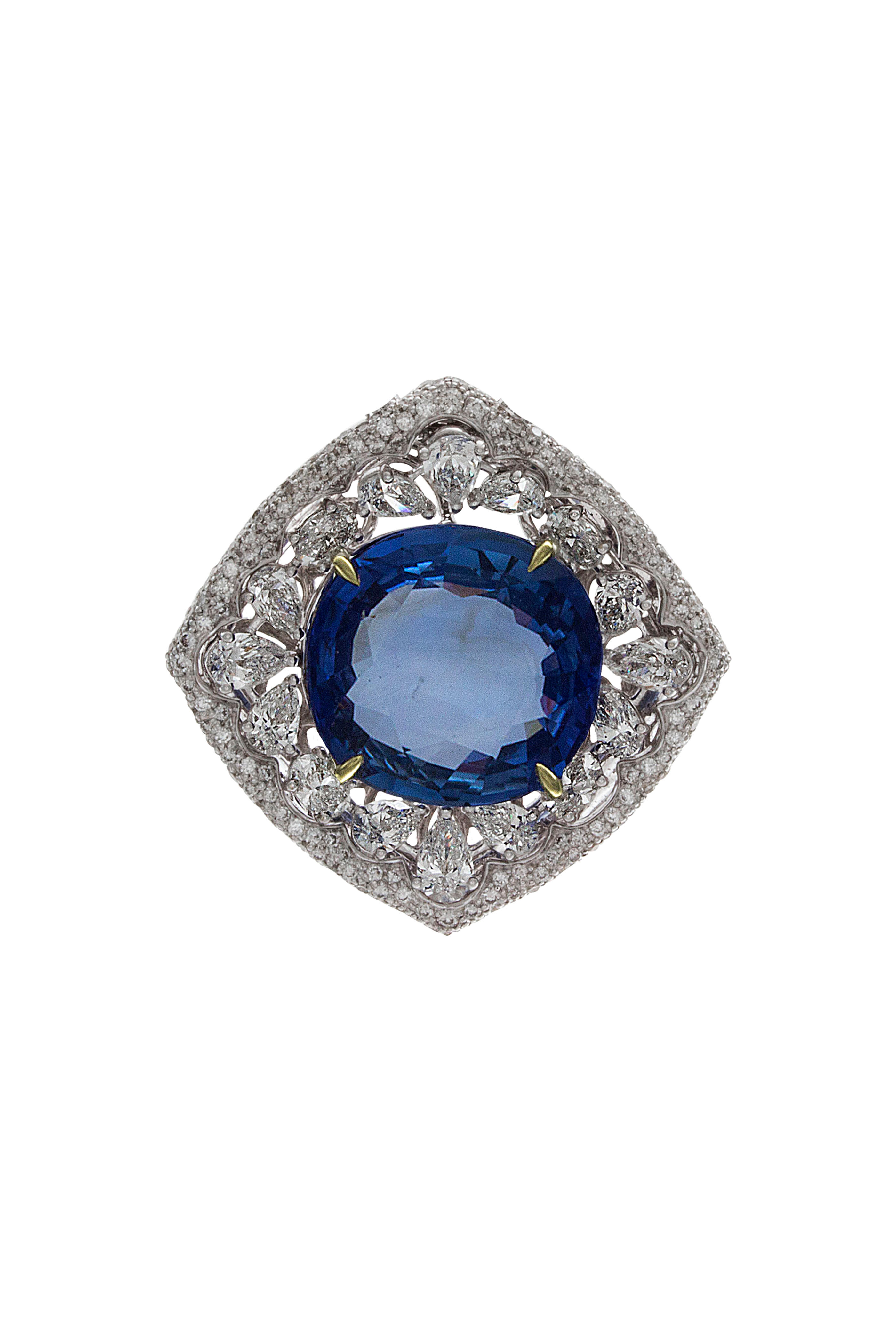 18K white gold. Sapphire. Brilliant cut diamonds, 1.58 total carat weight. Oval cut diamonds, 0.55 total carat weight. Princess cut diamonds, 1.84 total carat weight.