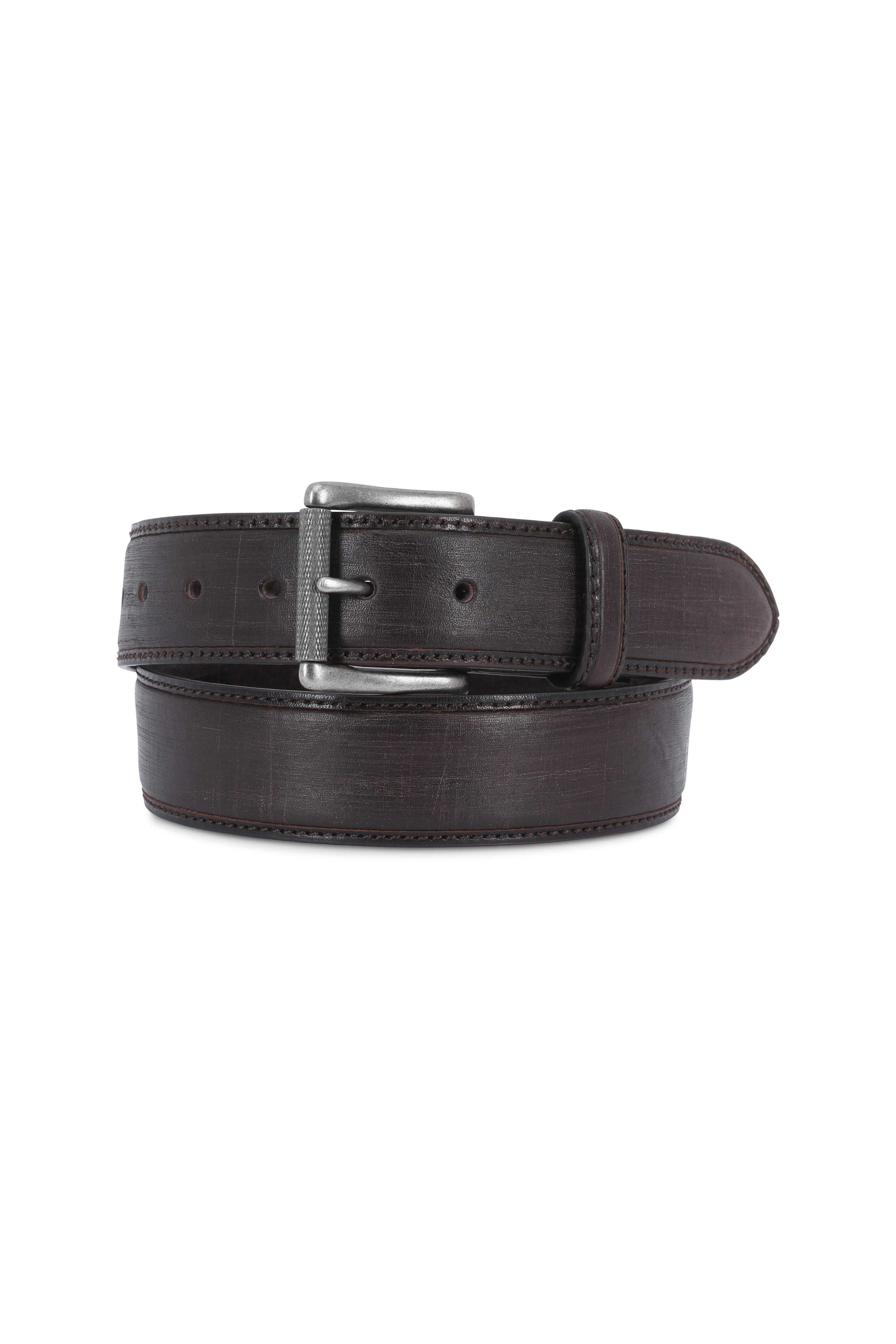 Vintage scarred leather. Textured classic roller bar buckle finish. Leather wrapped and stitched edges. Single loop keeper. Tapered tip. Imported.