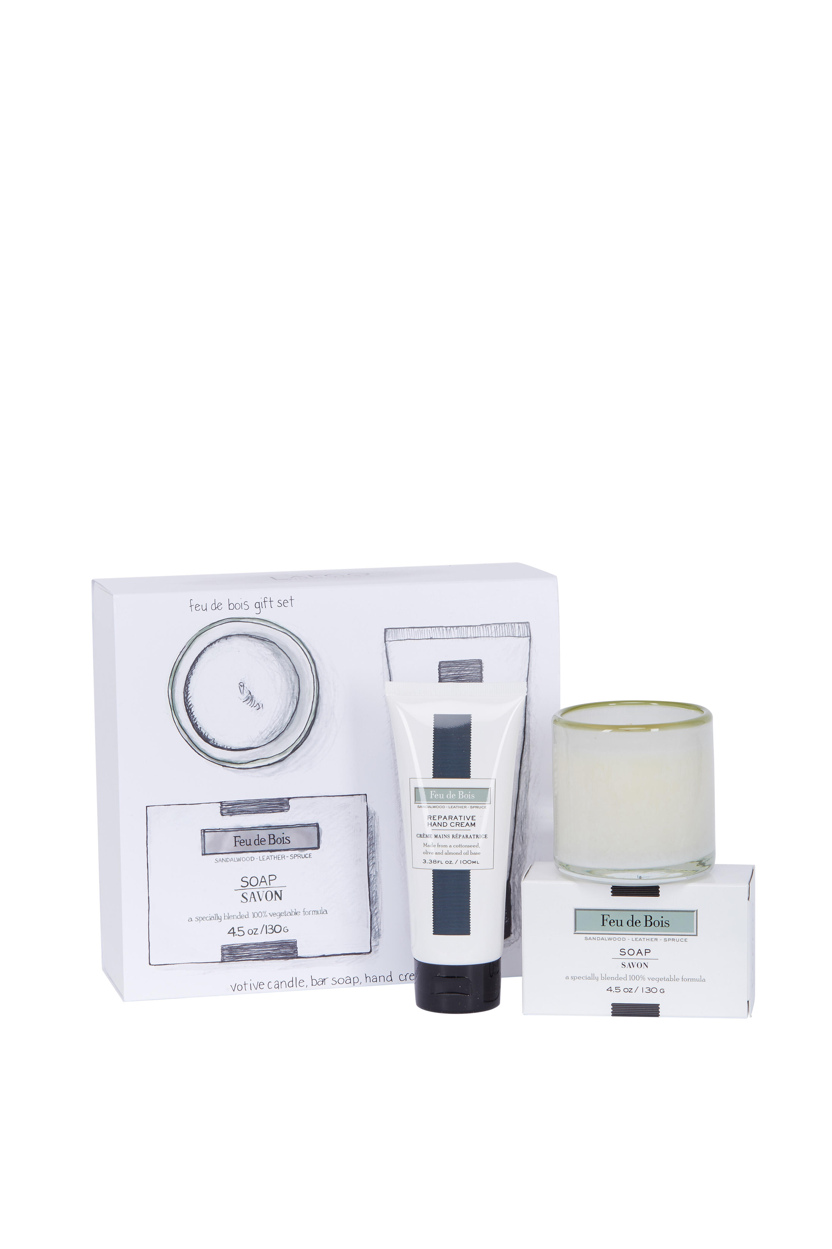 - Feu de Bois Gift Set contains a mini votive candle, a hand cream tube, and a boxed bar of soap.