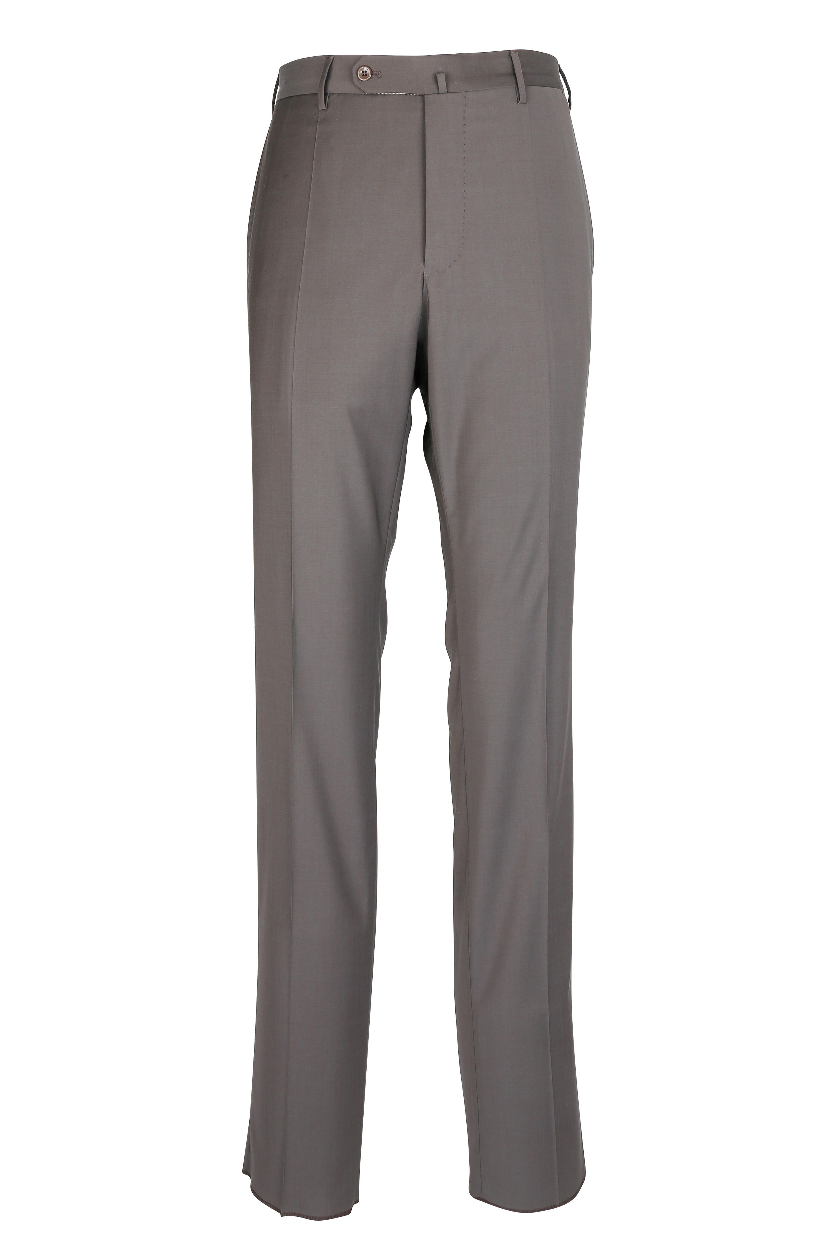 Front slash pockets, coin pocket, back buttoned-besom pockets. Unfinished hem. Imported. Classic fit. 98% wool, 2% elastane. Dry clean.