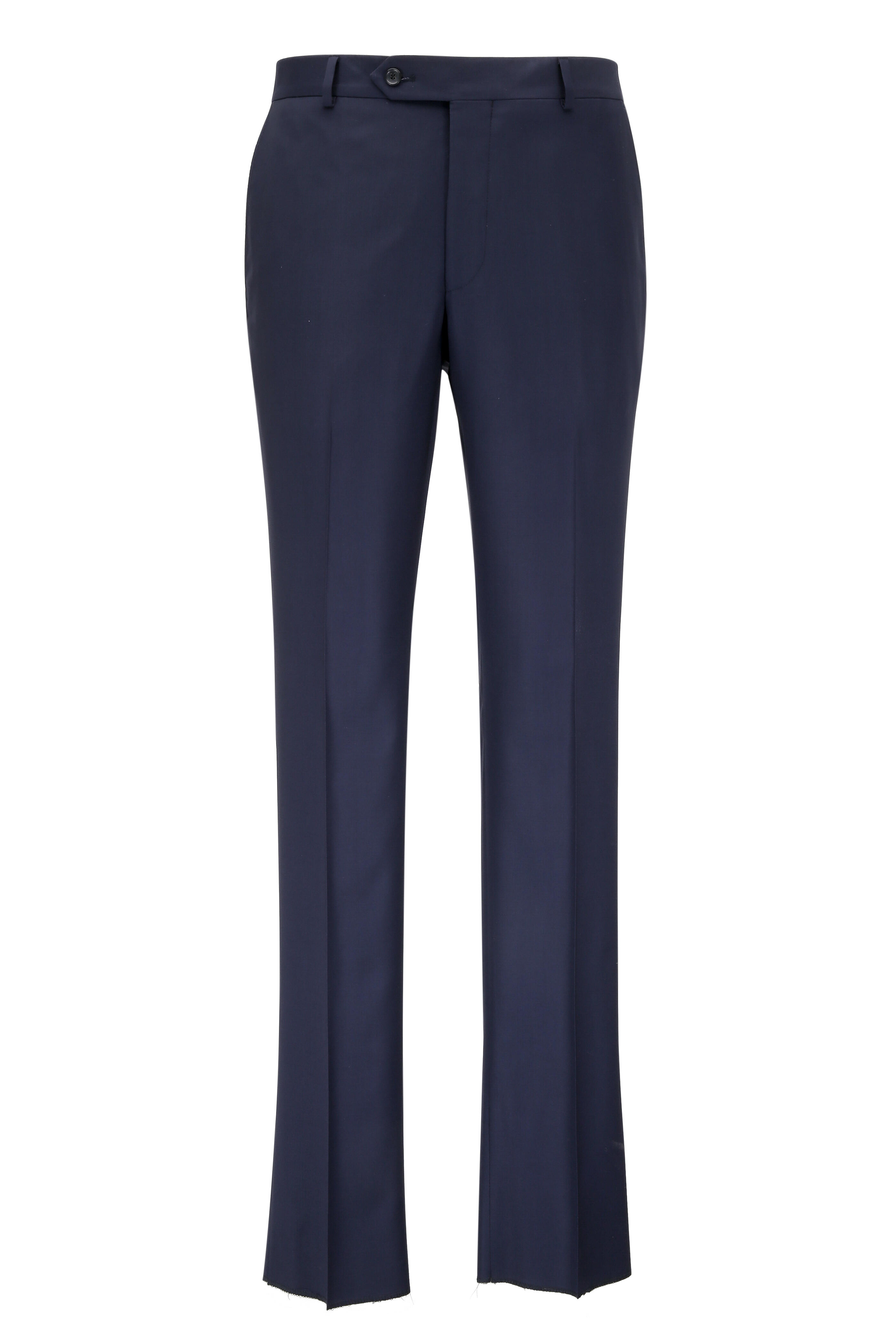 Made in Italy. Jacket: Fully lined. Notched lapels. Two button front closure. Chest welt pocket; lower flap pockets. Double vent. Pants: Side slash pockets, back button-besom pockets. Unfinished hem. 85% wool, 15% silk. Dry clean.