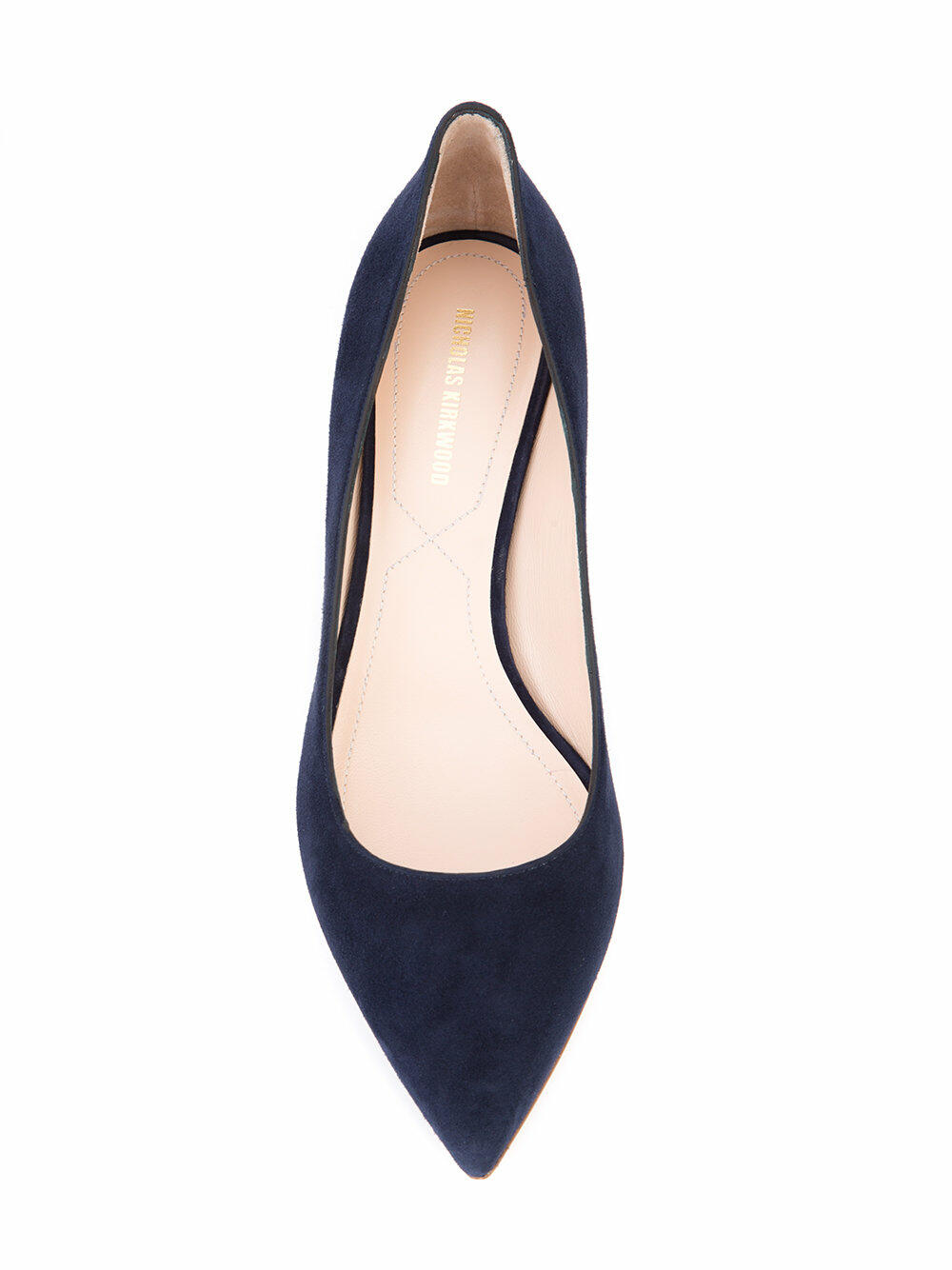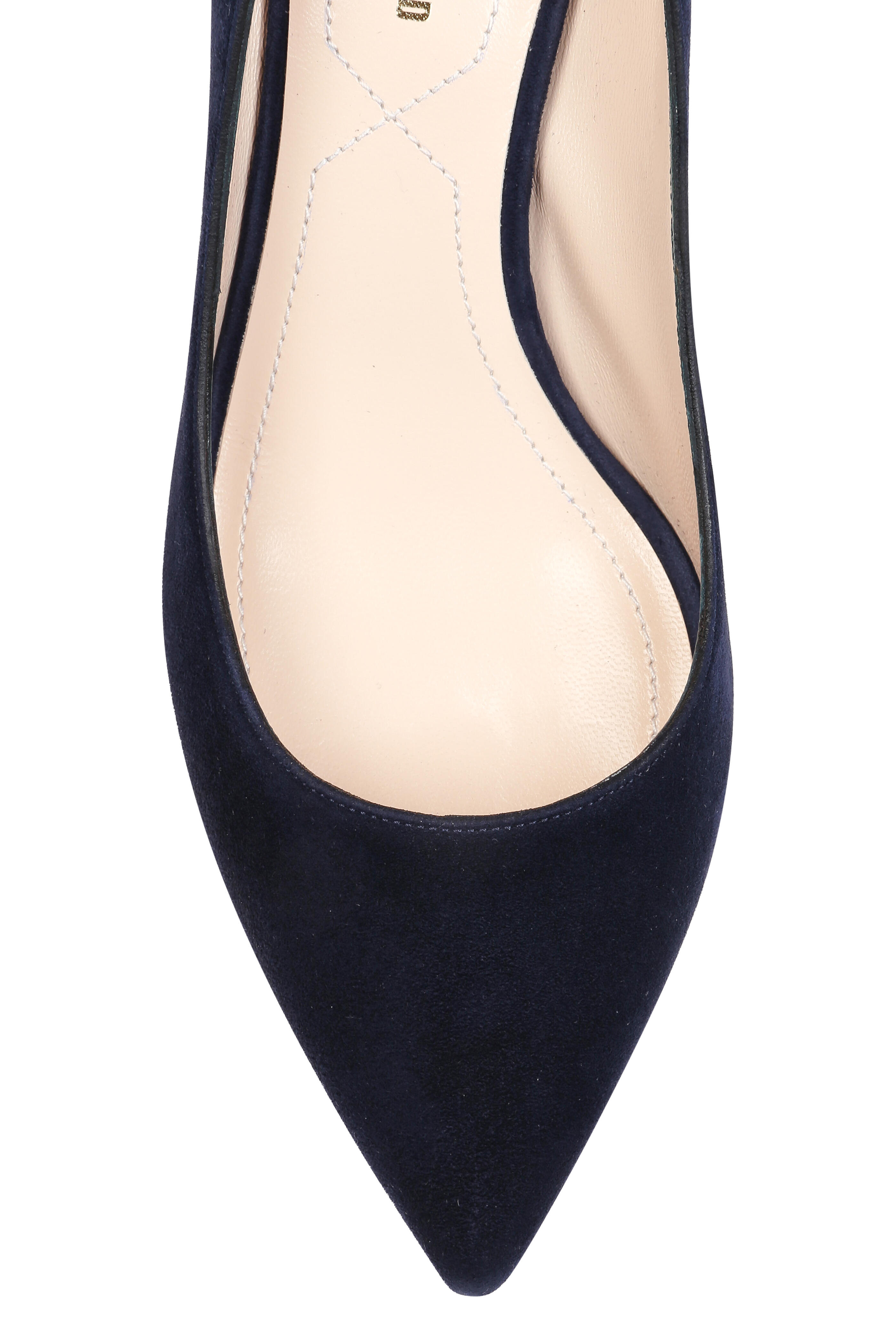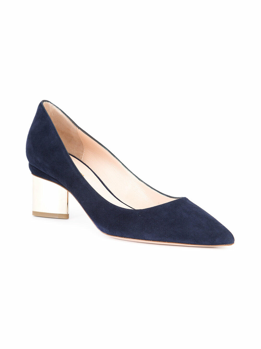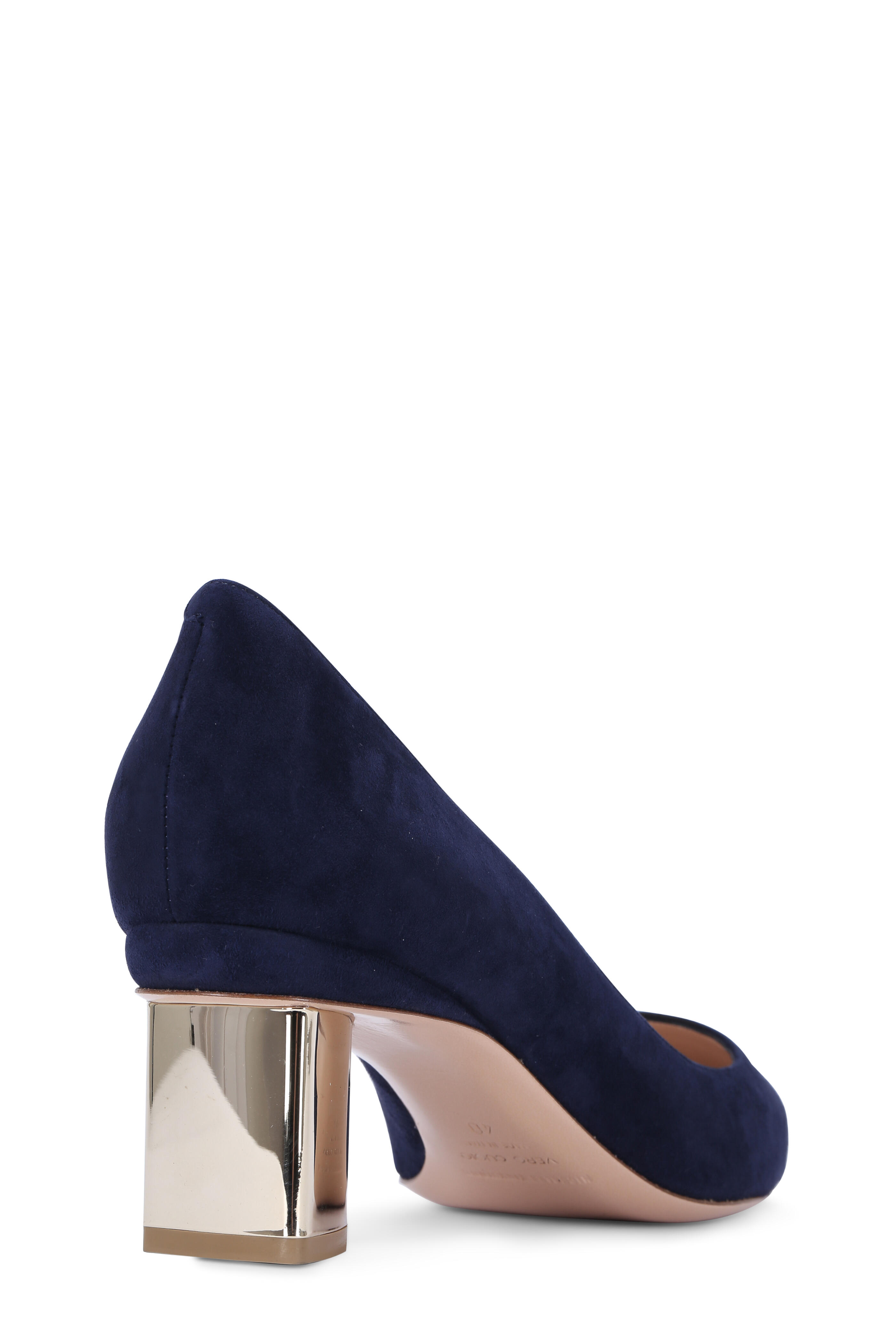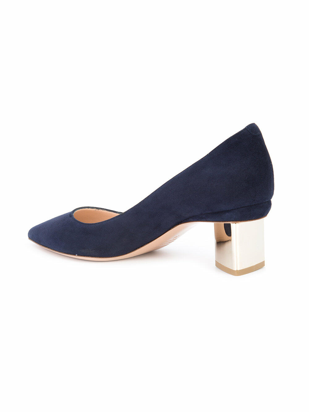 Suede upper. Pointed toe. Leather lining; cushioned insole. Metallic gold prism heel. Leather sole. Made in Italy. Heel measurement: 55mm (2 ¼").