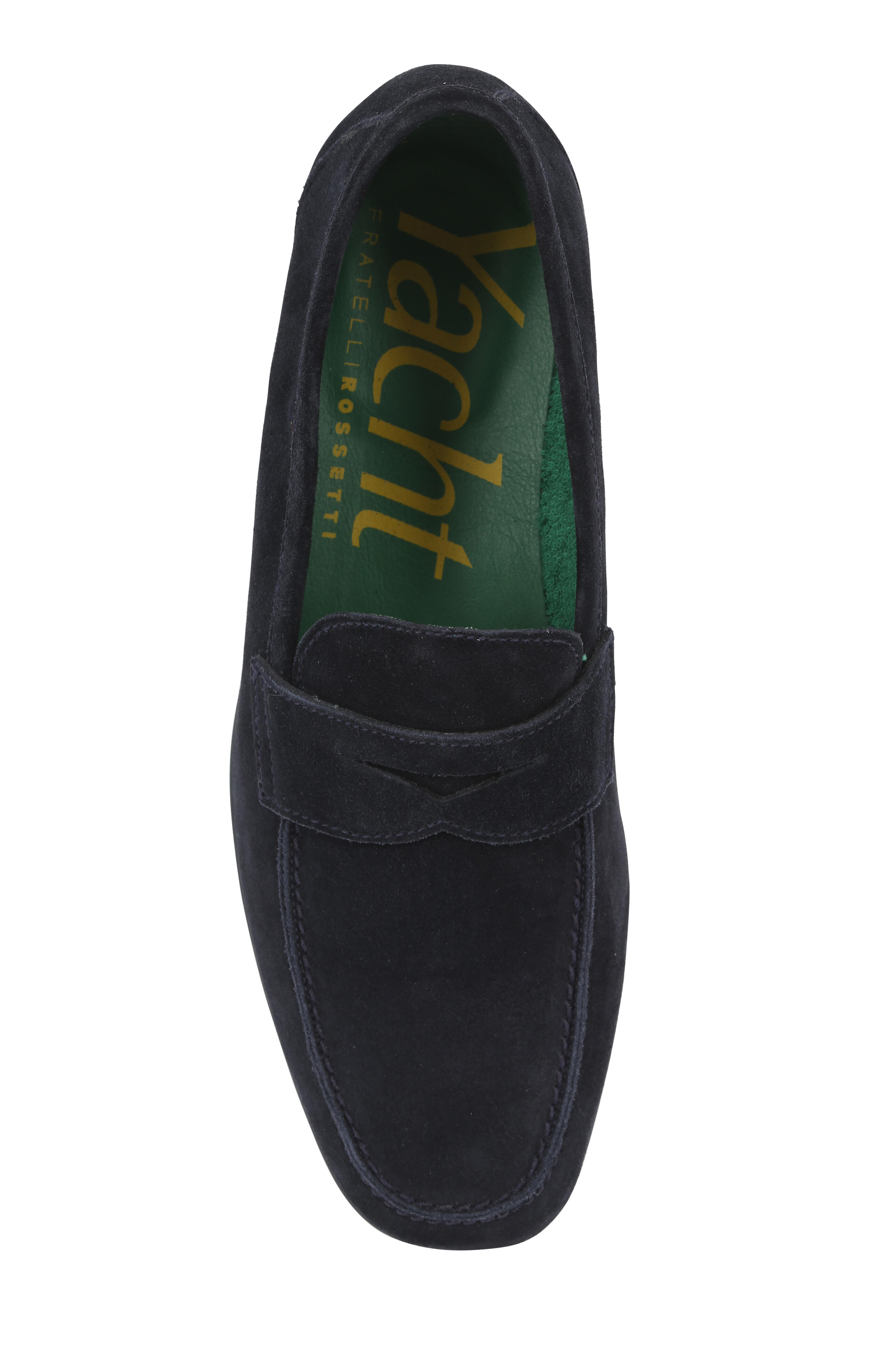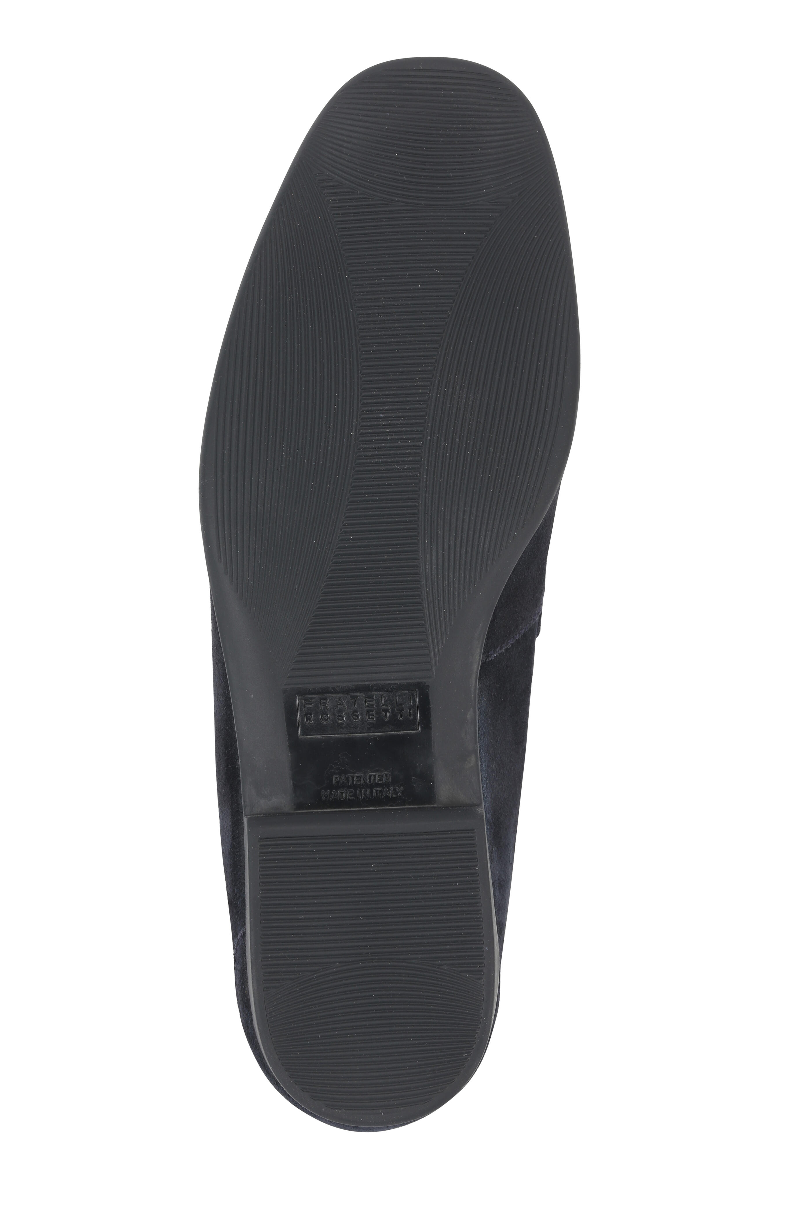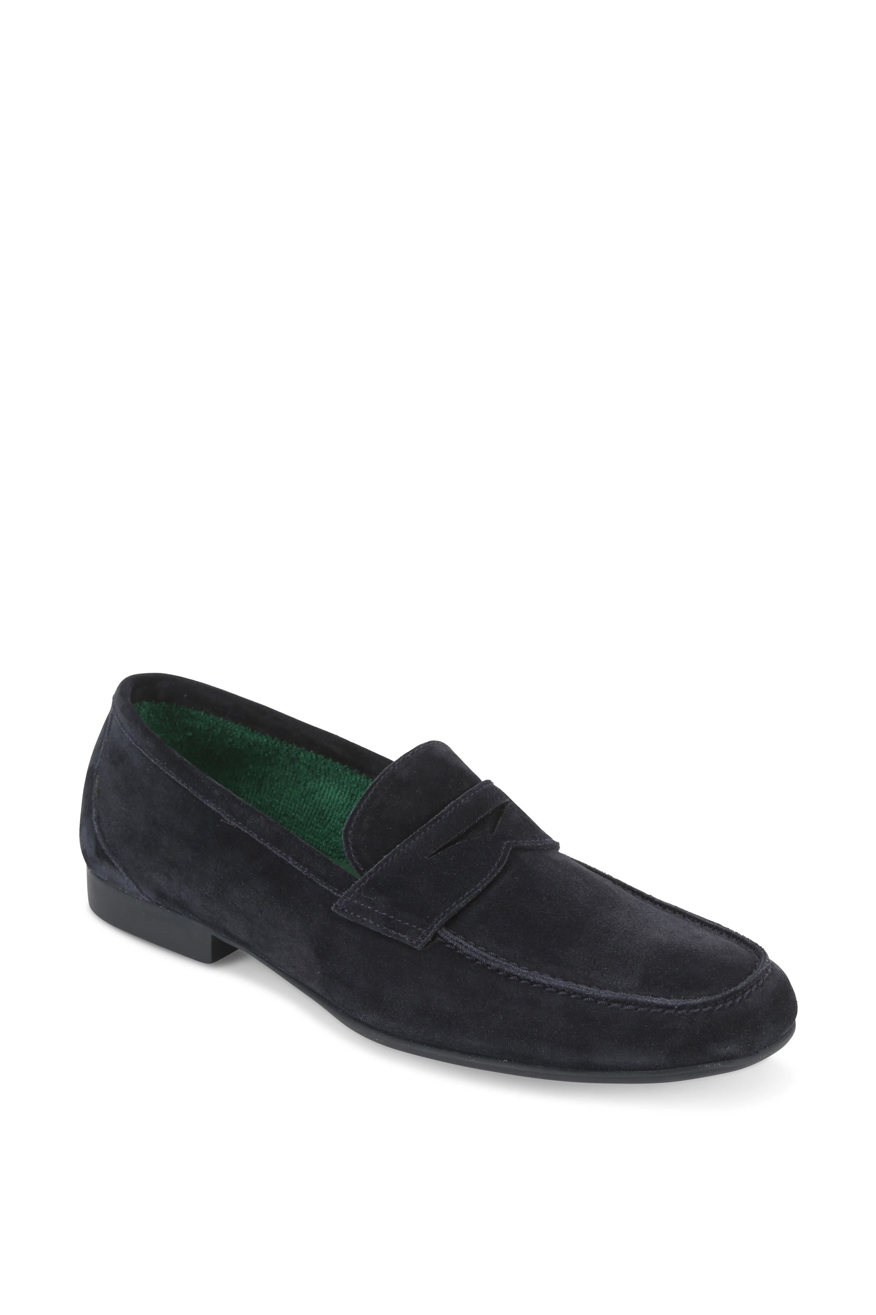 Suede upper. Apron toe. Penny strap across vamp. Terry cloth lining; cushioned leather insole. Stacked wooden heel. Non-skid rubber sole. Made in Italy.