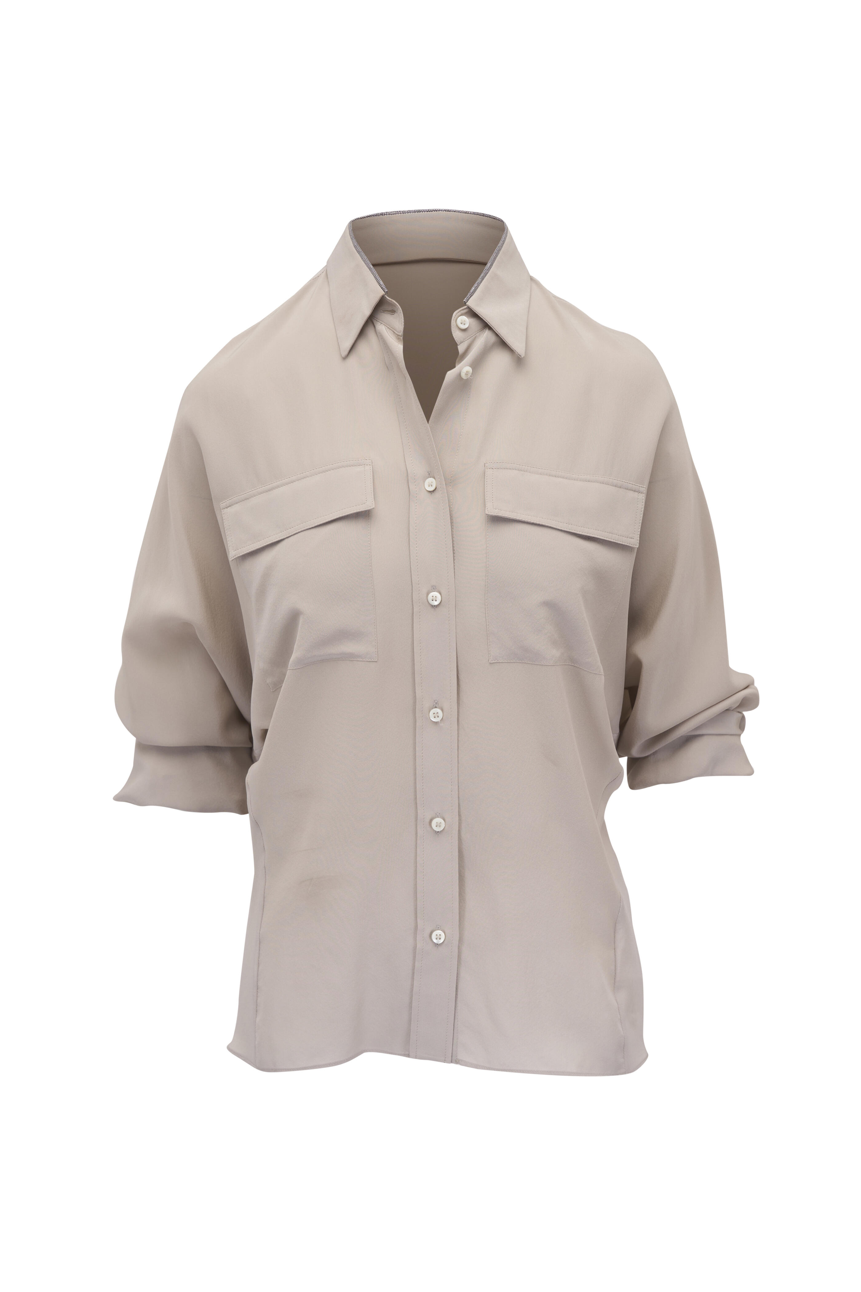Cool Beige Crepe De Chine Button Down Blouse