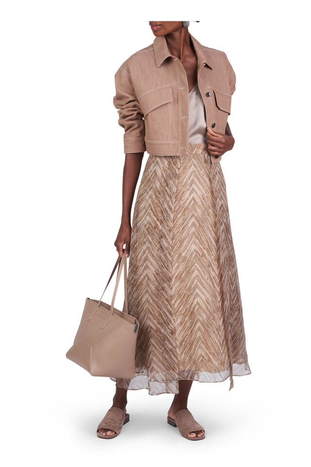 Beige Chevron Print Silk Paneled Circle Skirt